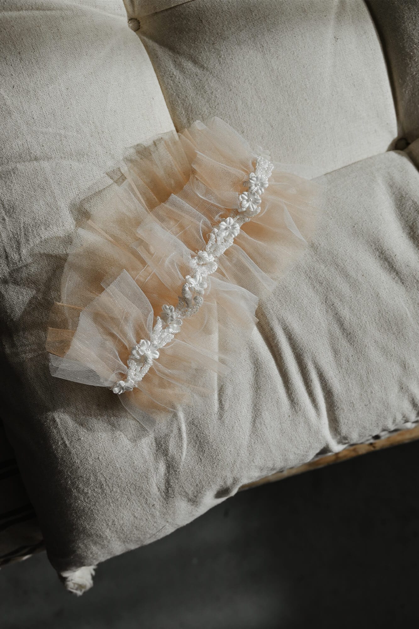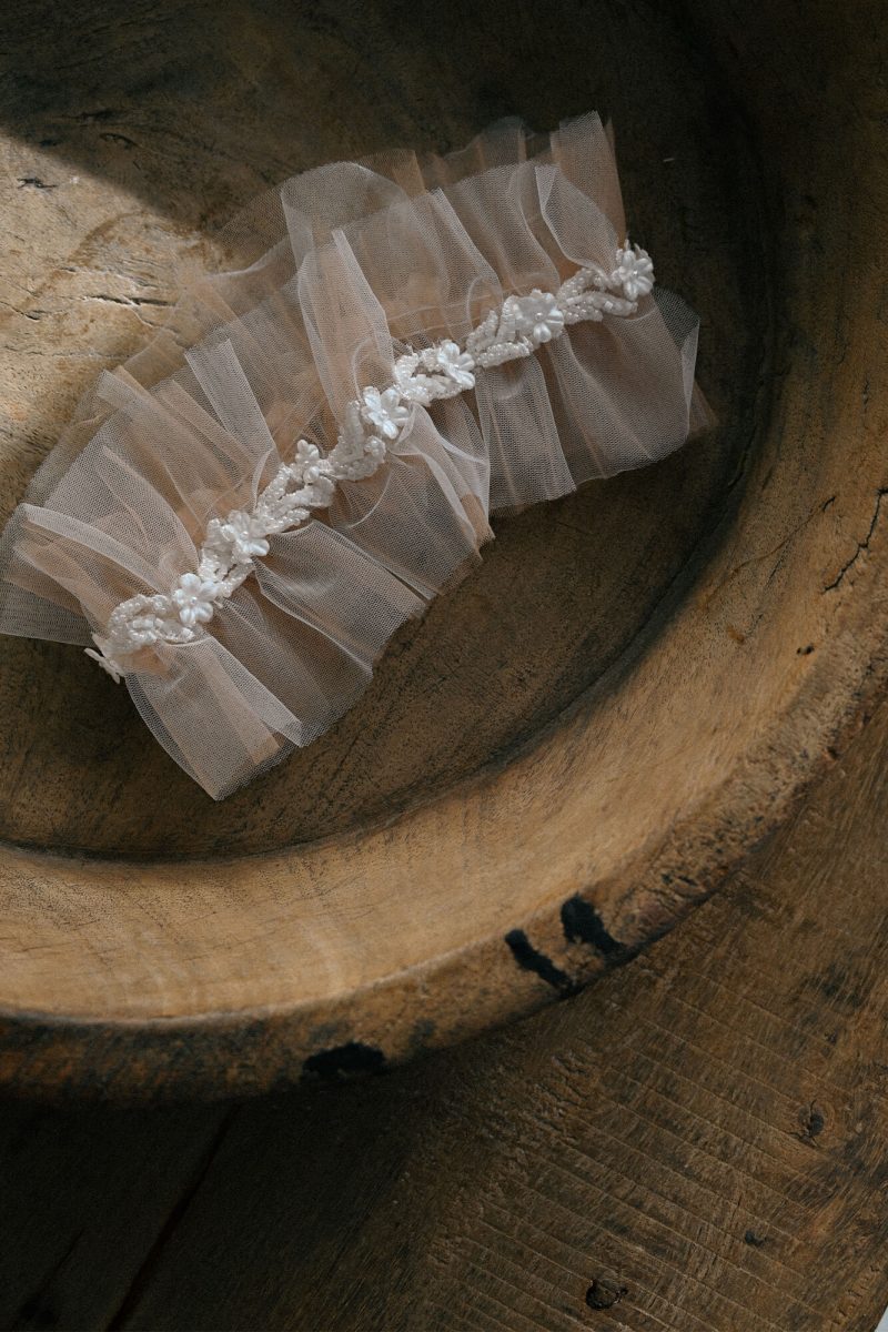 Jeśli jesteś typem romantyczki, ale lubisz eleganckie akcenty i biżuterię, to na pewno zwrócisz uwagę na tę podwiązkę. Jest ultra lekka i efektowna. Została uszyta z dwóch warstw tiulu – ecru i cielistego, co sprawia, że kontrastuje tak mocno z ciałem i daje efekt mgiełki. Dookoła podwiązki została naszyta bogato zdobiona taśma z kwiatuszkami. Taka podwiązka ślubna to nie tylko piękny element dekoracyjny, ale także wspaniała pamiątka i oryginalny pomyśl na prezent dla przyszłej Panny Młodej.