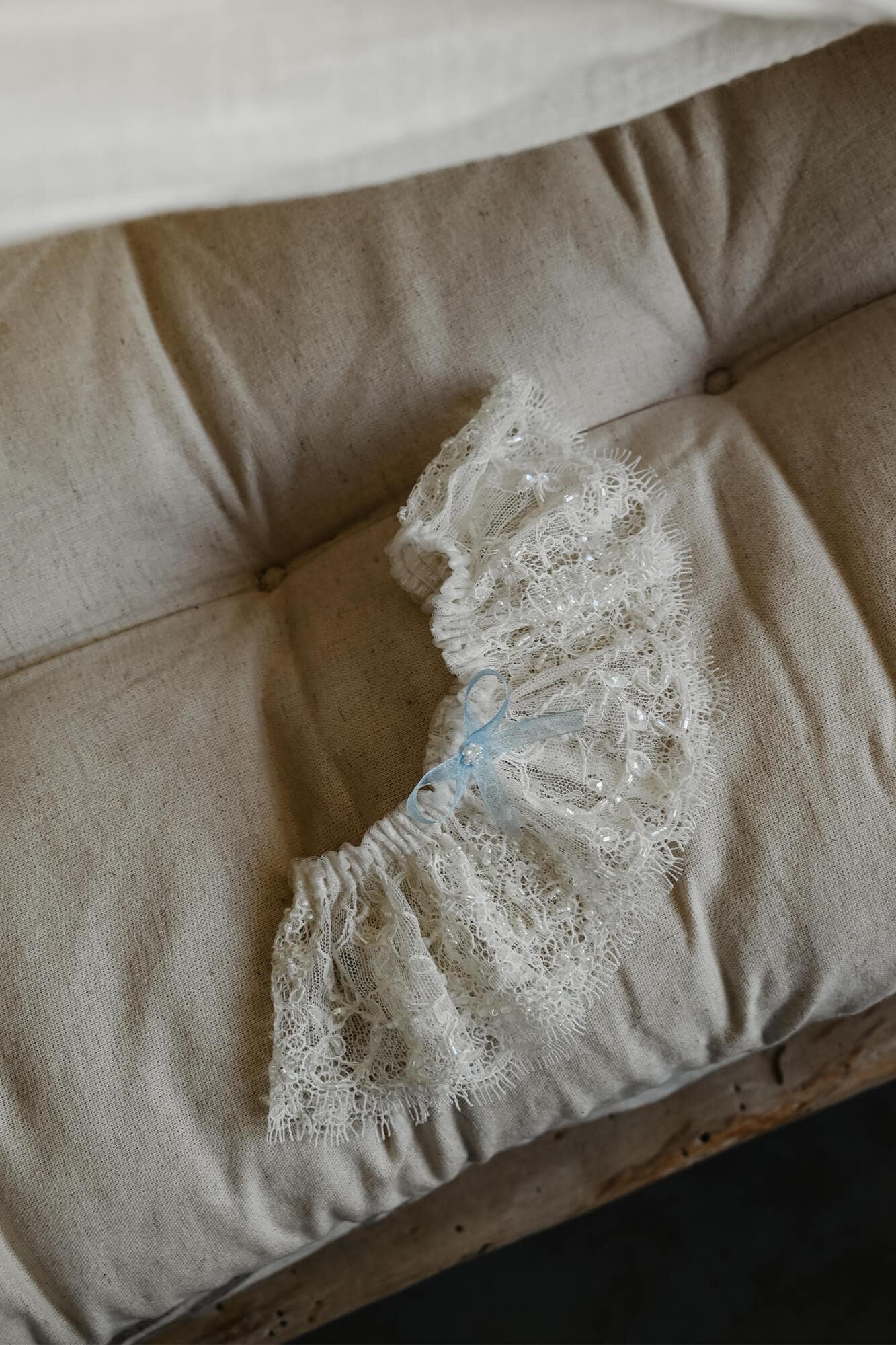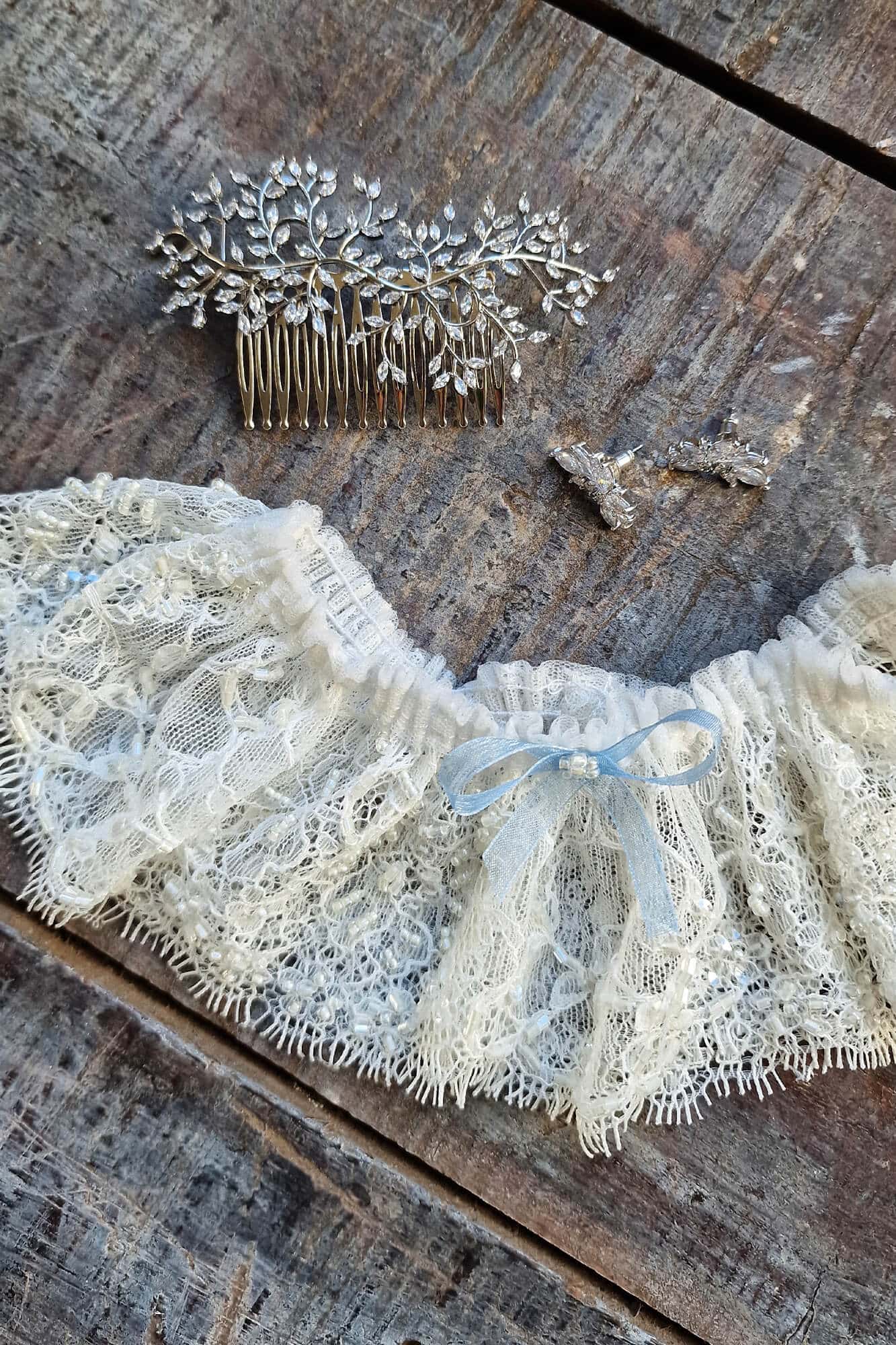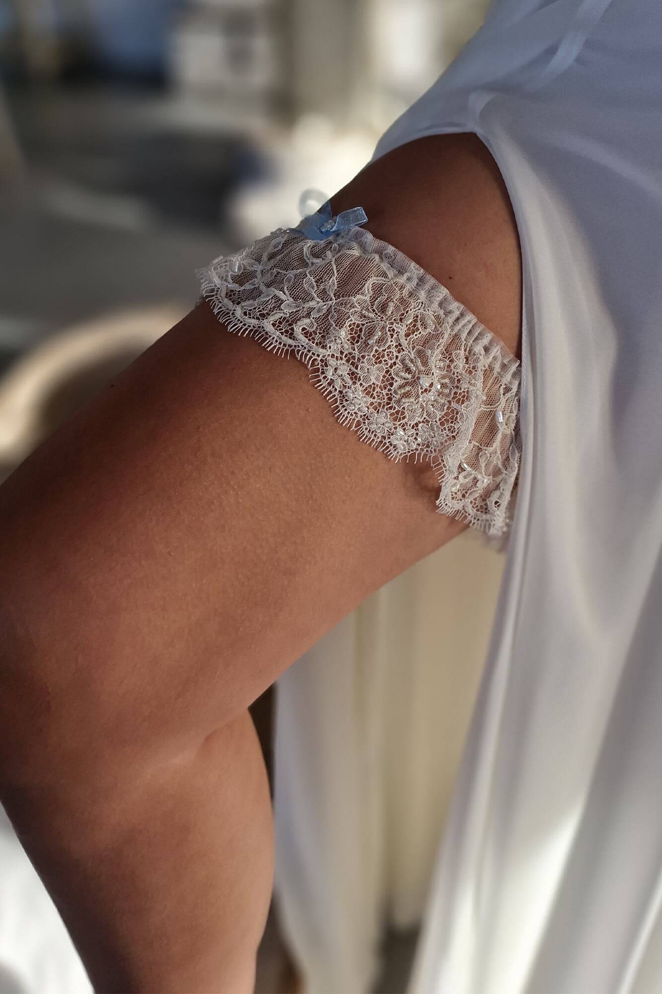Kochasz koronki? A może wybrałaś gładką suknię, ale chciałabyś poszaleć z dodatkami? Podwiązka z delikatnej koronki, wyszywanej koralikami na pewno spodoba się i Tobie i Twojemu przyszłemu mężowi. Brzeg koronki jest nieregularny i zwieńczony mini „rzęskami” , które dodają jej lekkości. W górną krawędź podwiązki wszystko cienką gumeczkę, która utrzymuje ją na miejscu i nie wcina się w udo. Przezornie na środku podwiązki naszyto mini kokardkę w kolorze błękitnym – lepiej dmuchać na zimne ?Jeśli wolisz z niej zrezygnować to powiedz nam o tym składając swoje zamówienie.