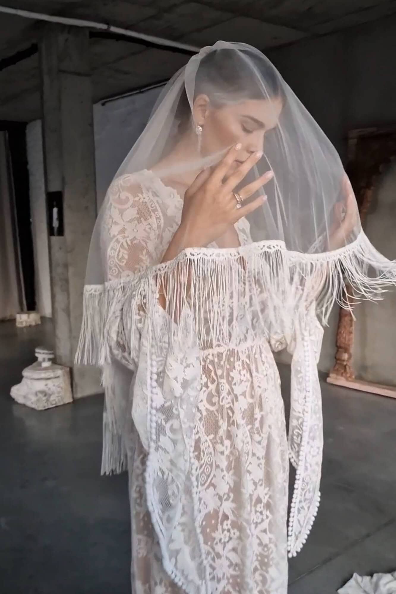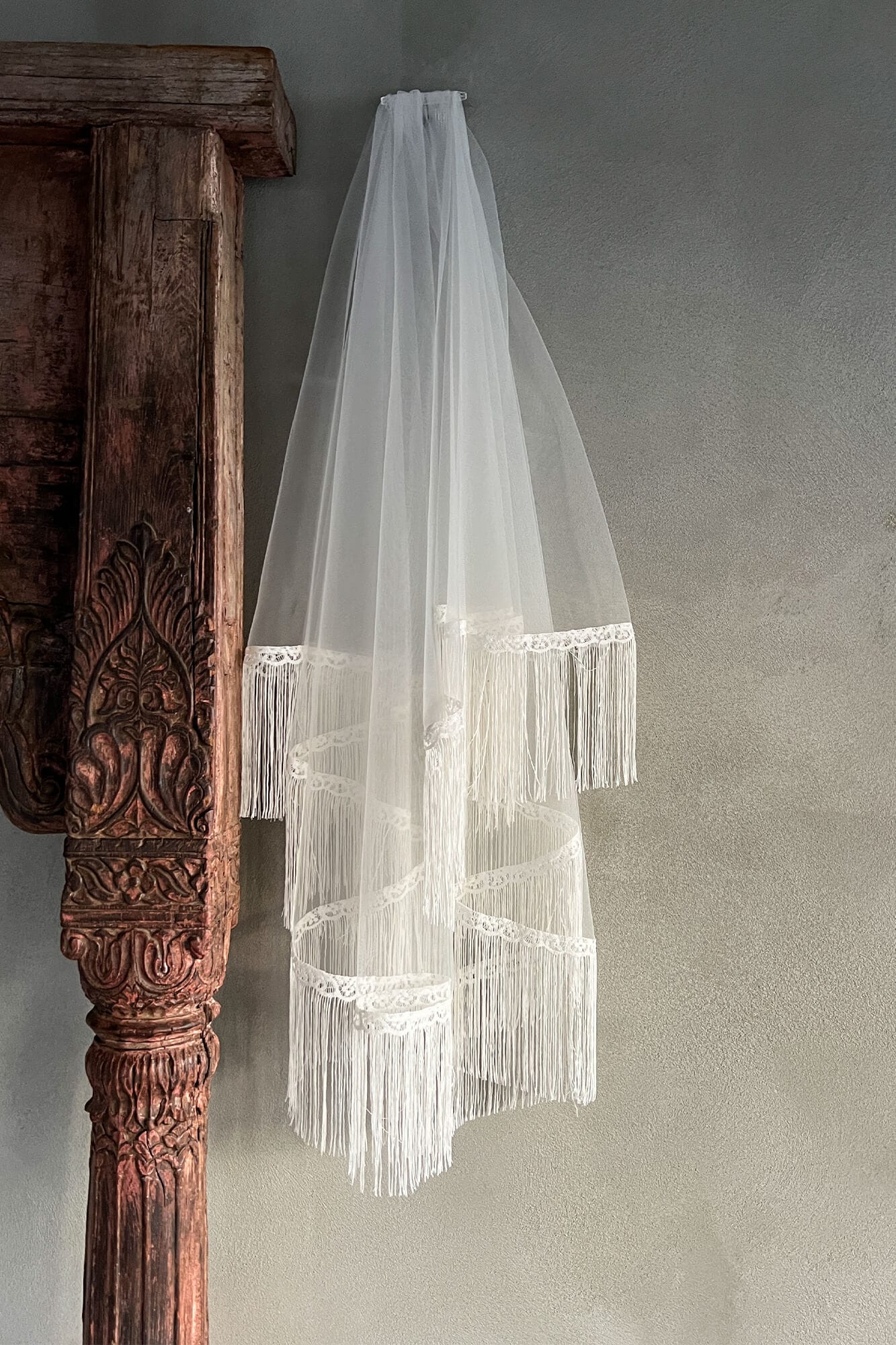 Kochasz styl boho i marzysz o tym, by frędzle wirowały w tańcu nie tylko na Twojej sukni ślubnej, ale także na welonie? Oto on! Super lekki, romantyczny i zadziorny za razem! Welon uszyty w tiulu, obszyty kremowymi frędzlami dookoła. Po środku ma doszyty transparentny grzebyk, dzięki któremu przytwierdzisz welon stabilnie do fryzury, a jego wierzchnią część możesz zarzucić na twarz. Taki welon w frędzlami będzie pasował zarówno do sukni koronkowej jak i klasycznej – gładkiej. W obu przypadkach będzie spełniał inną rolę – przy sukni koronkowej może być tylko uzupełnieniem stylizacji, a w połączeniu z gładką suknią ślubną może się okazać motywem przewodnim całego look’u.