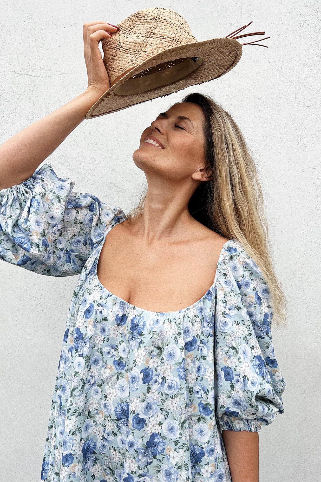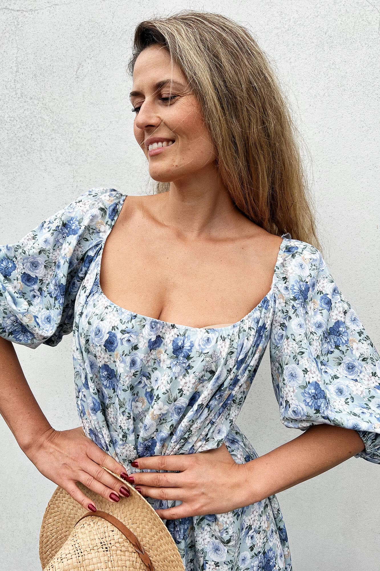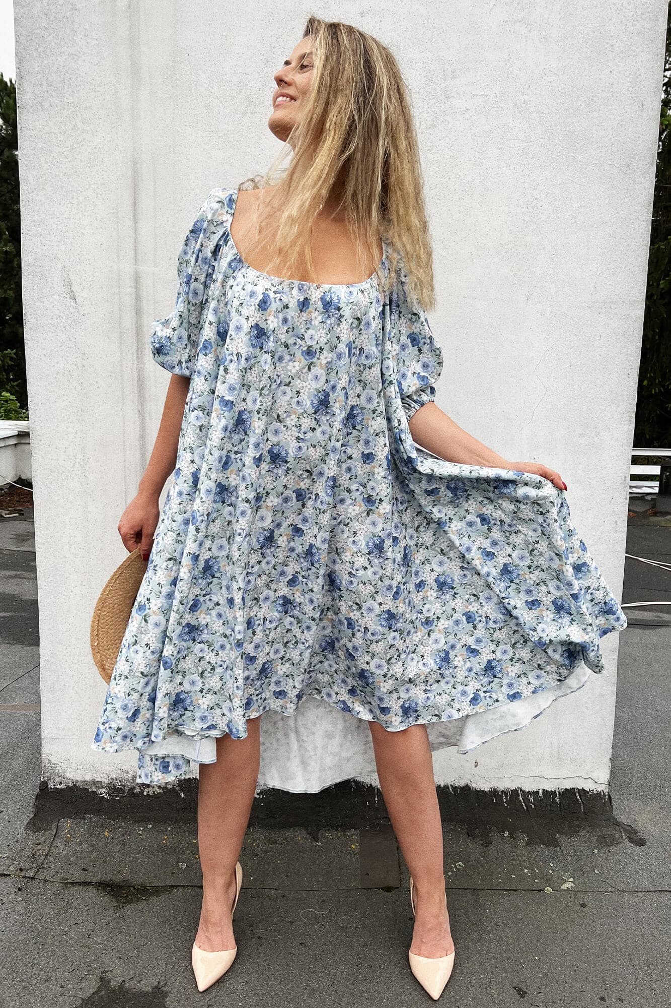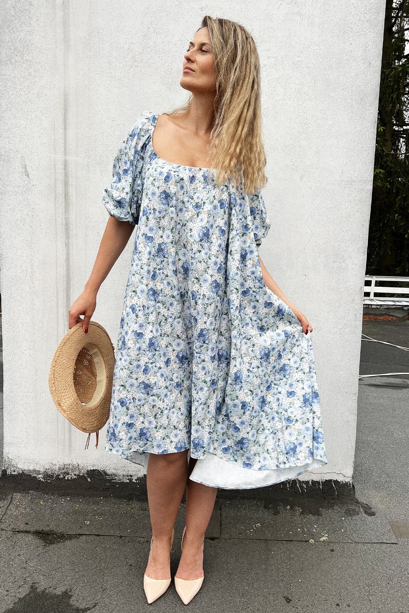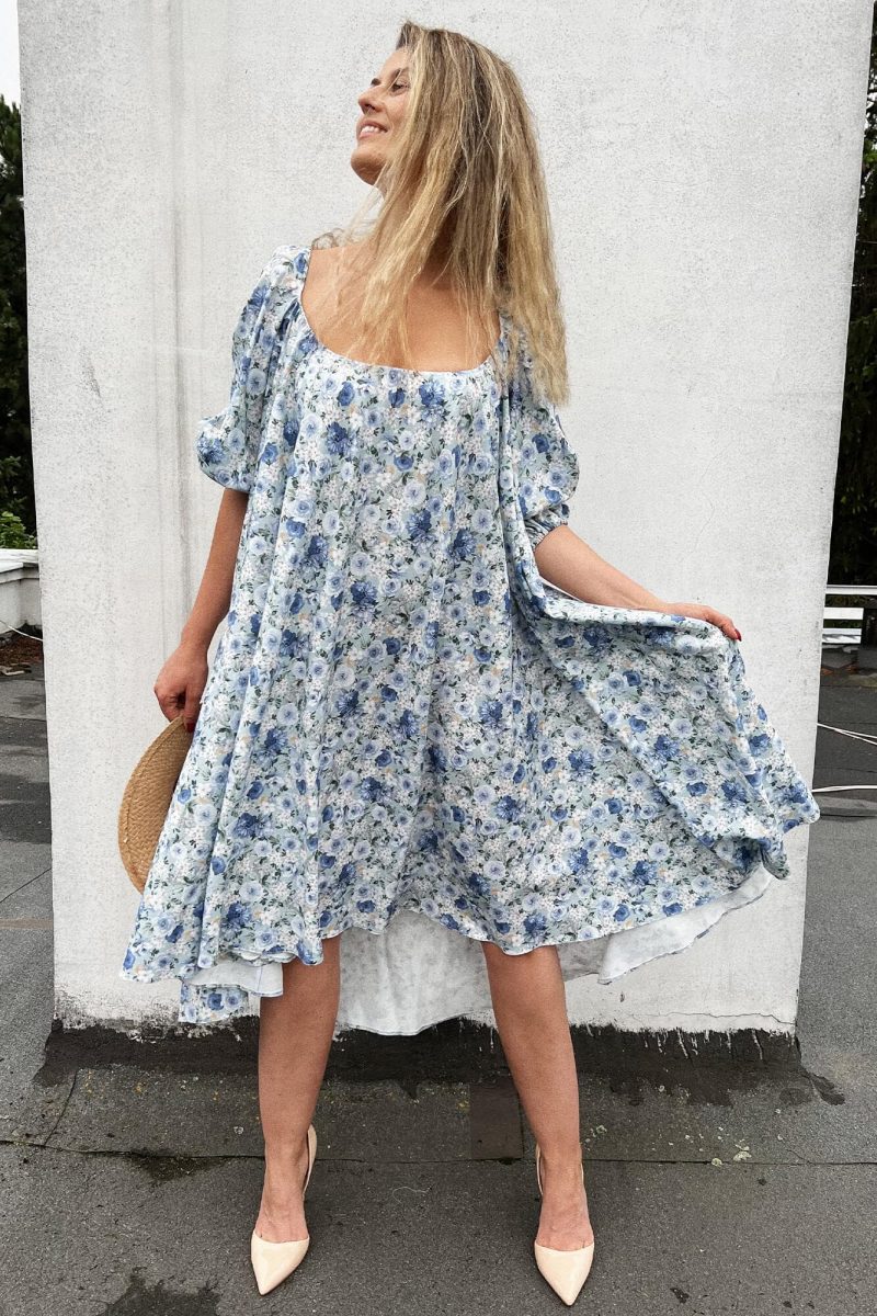 Luźna sukienka do połowy łydki to spełnienie marzeń kobiet, które lubią swoje nogi ale nie koniecznie chcą eksponować wszystko co jest powyżej. Dekolt z przodu jest na tyle duży, by pokazać szyję, ale na tyle skromny, że nie obnaża biustu. Dekolt z tyłu już tak skromny nie jest, a do tego wieńczy go zalotna falbanka. Rękawki są mocno bufiaste, a sama konstrukcja sukienki to obszerna połowa koła bez żadnych odcięć w talii czy pod biustem. Pamiętajcie, że szyjąc u nas taką sukienkę możecie zmienić zarówno o materiał, kolor, długość, kształt dekoltu czy rękawa, ale także kształt całej sukienki!