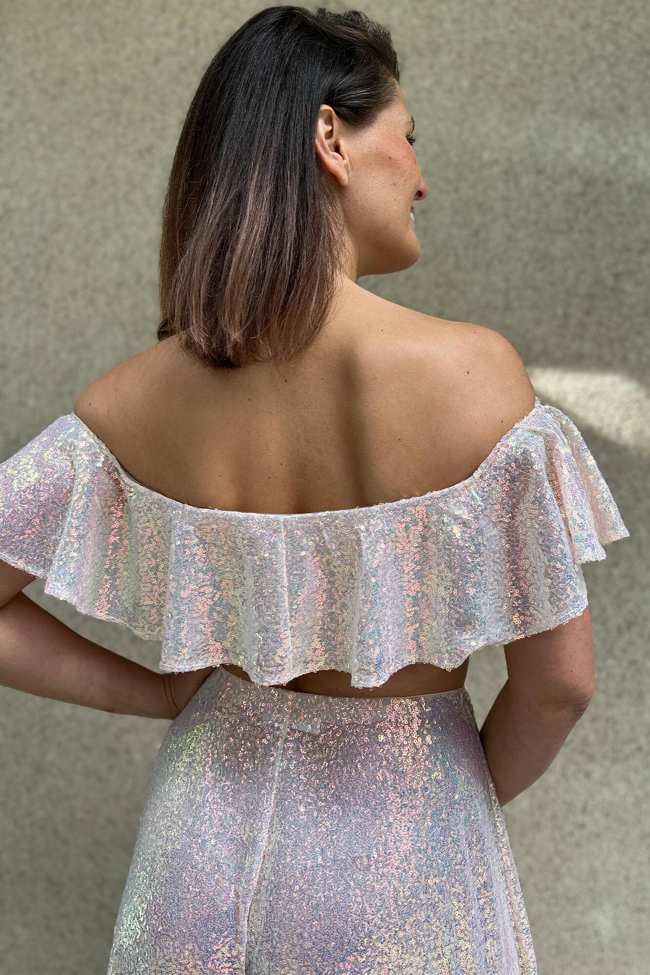 Kochasz błyszczeć nie tylko w karnawale? Spraw sobie cekinowy top z hiszpańskim dekoltem, zmysłowo odkrywającym ramiona. Ta nietuzinkowa bluzka pasuje zarówno do jeansów, gdy idziesz na imprezę na plaży, jak i do długiej czarnej spódnicy z rozporkiem na wielką galę! Bazę topu (część pod falbaną) rekomendujemy uszyć z gładkiej tkaniny, aby nie drapała rąk.
