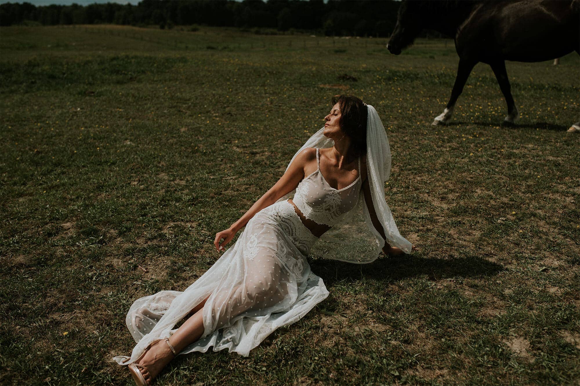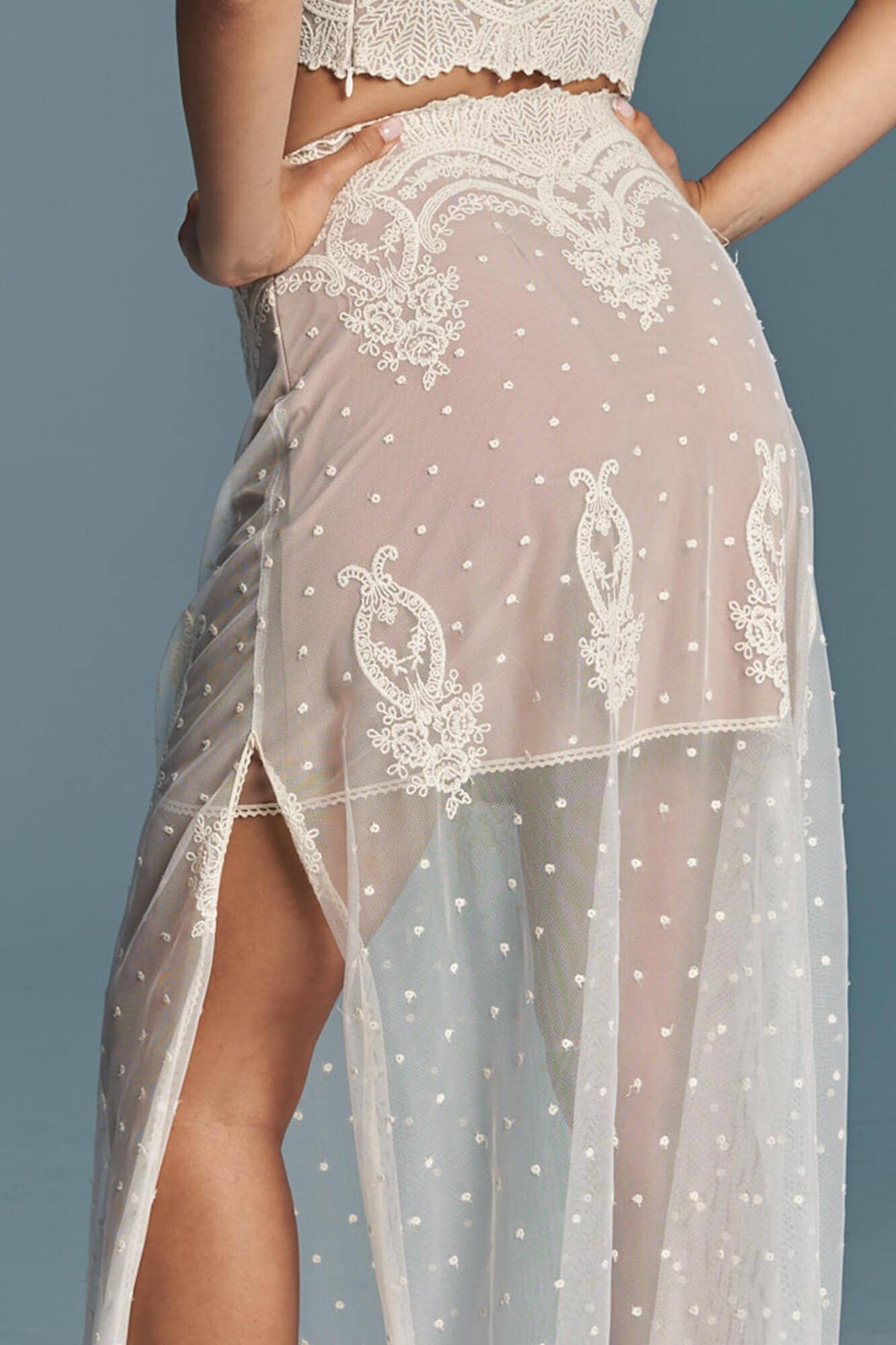 Beżowe suknie ślubne stanowią piękne tło dla wielu typów urody. Są idealną bazą, która podkreśla ich wyjątkowość i niepowtarzalne cechy. Ten unikalny model z kolekcji Barcelona został uszyty z beżowej bawełnianej koronki, która została rozmieszczona na cielistej elastycznej podszewce. Dwuczęściowa suknia ślubna to propozycja idealnie wpisująca się w klimat ślubów organizowanych w stylu boho czy rustykalnym. Świetnie sprawdzi się podczas plenerowych ślubów albo skromnych ceremonii w urokliwych miejscach. Jeśli jednak marzy Ci się styl vintage i chcesz, aby Twoja suknia ślubna zyskała jeszcze bardziej ślubny charakter to możesz śmiało połączyć ją z inną wyjątkową propozycją z kolekcji Barcelona – lekką, zwiewną, tiulową suknią w drobne kropeczki, którą znajdziesz pod numerem 14. W dniu ślubu poza oszałamiającym wyglądem ważna jest też Twoja wygoda. Do topu na cienkich ramiączkach z łagodnie wyciętym dekoltem możesz śmiało założyć biustonosz – będziesz miała pewność, że przez całą ceremonię Twój biust będzie odpowiednio podtrzymany i wyeksponowany. Dół sukni, czyli spódnica ma po obu stronach rozporki przez co jest nie tylko wygodna, ale też seksowna. Pod spodem znajduje się krótka podszewka w kolorze cielistym. Dwuczęściowa suknia ślubna to wyjątkowo praktycznie rozwiązanie – przede wszystkim bez wprowadzania większych zmian możesz założyć ją na wiele okazji, a nie tylko w dniu Twojego ślubu. Wystarczy, że zestawisz top albo spódnicę z zupełnie innym elementem swojej garderoby, a cała stylizacja zyska zupełnie nowe oblicze. Top możesz na przykład połączyć z obszerną narzutką przyozdobioną frędzlami i będzie pięknie prezentował się podczas wakacji w egzotycznym miejscu, a spódnica może towarzyszyć Ci podczas oficjalnych uroczystości. Koronki możesz w łatwy sposób zafarbować i nadać temu ślubnemu zestawowi zupełnie nowe oblicze – Twoją kreatywność w tej kwestii ogranicza jedynie dostępna paleta barw. Beżowe suknie ślubne dają mnóstwo możliwości modyfikacji i za to je uwielbiamy!