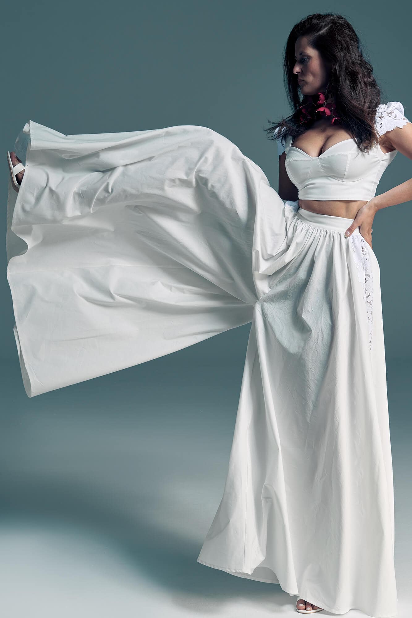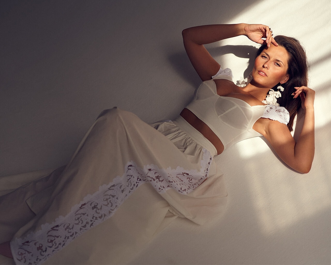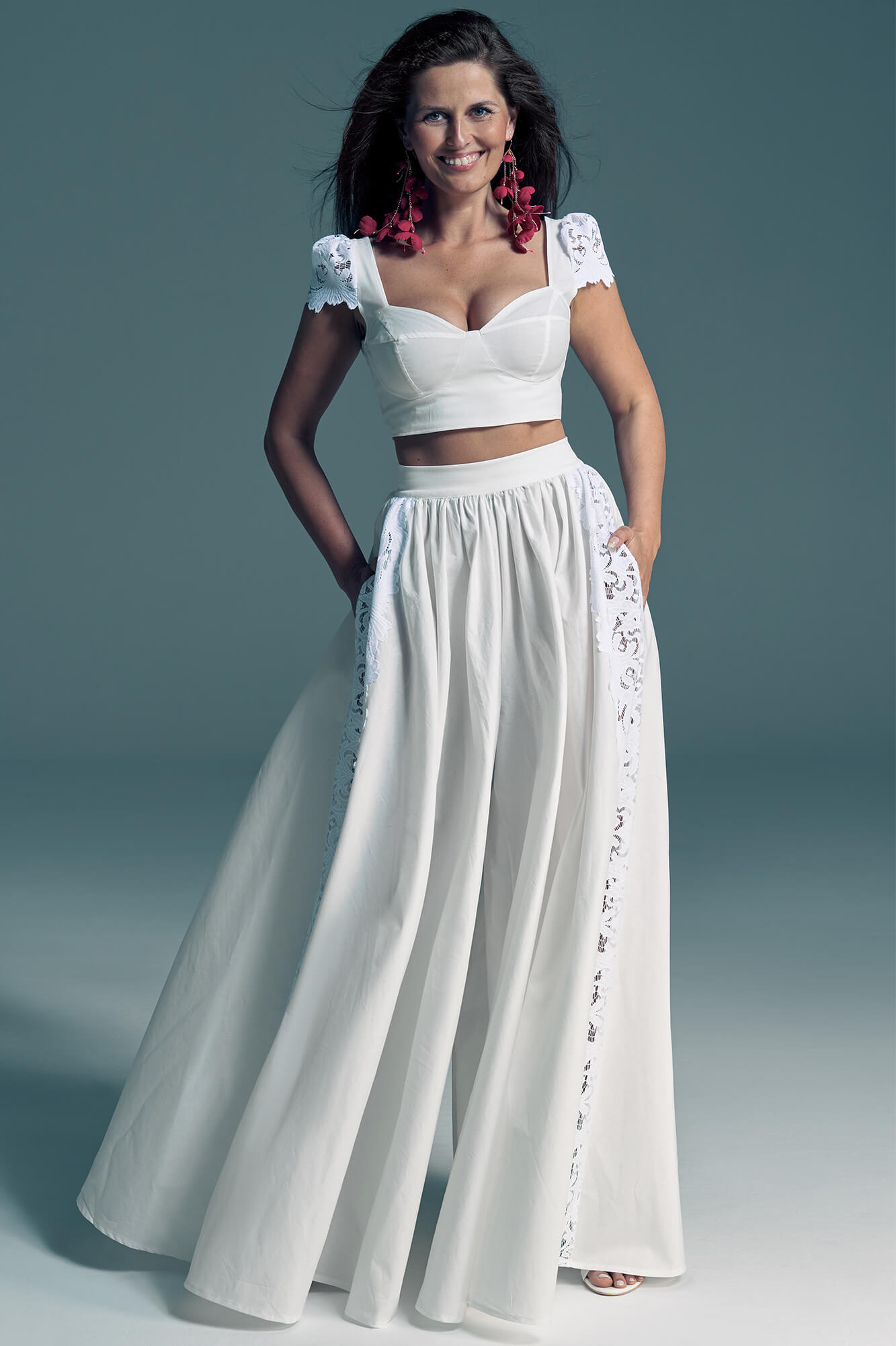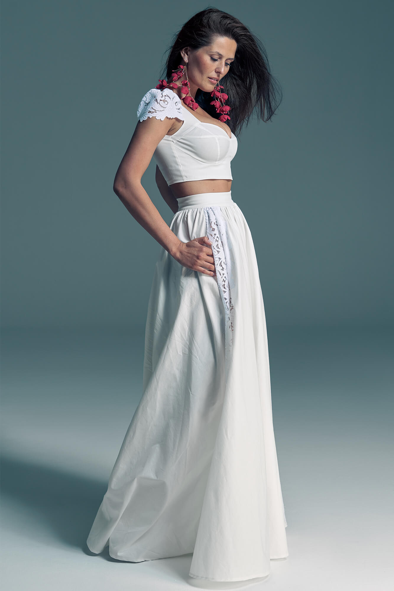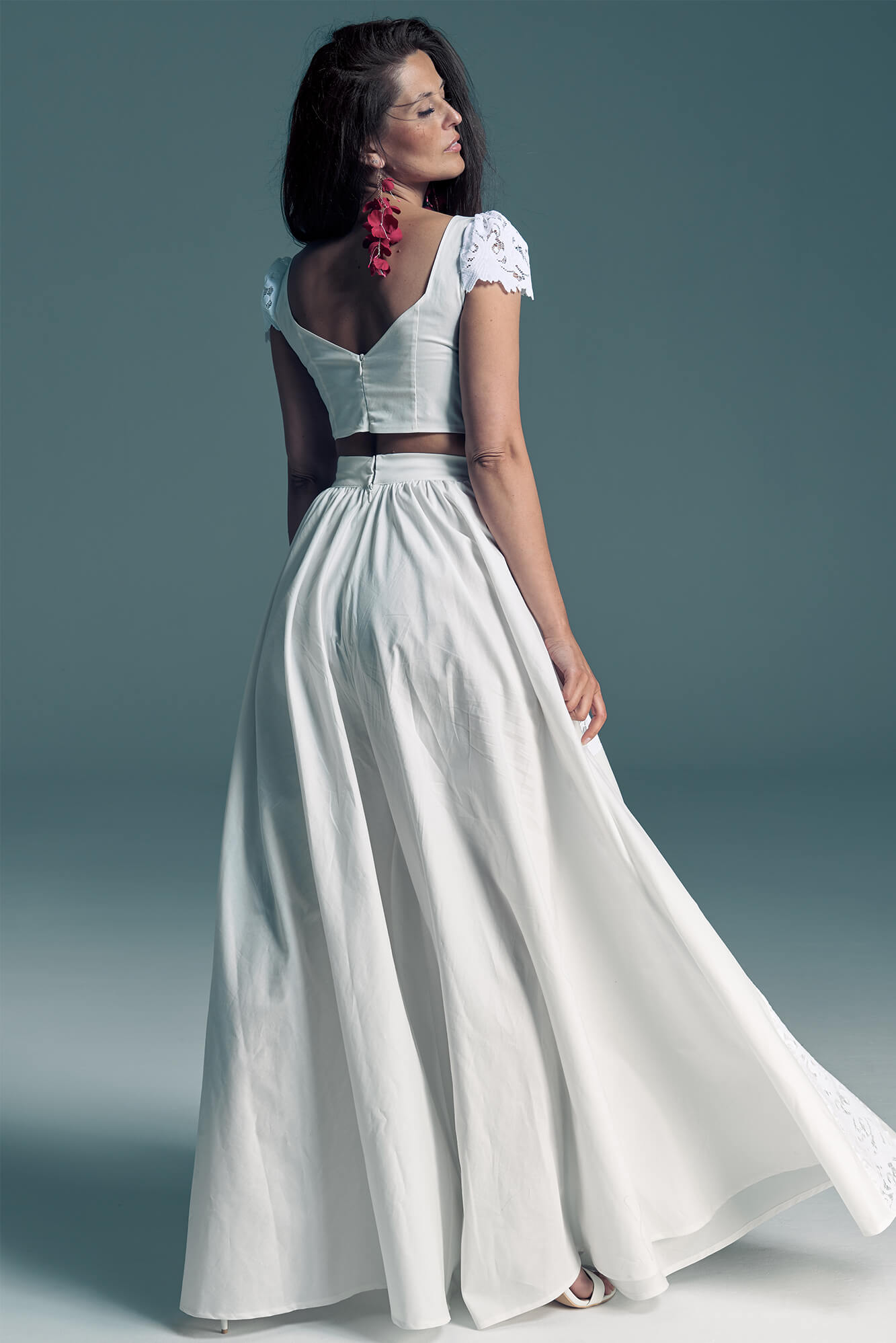 Twoją suknię uszyjemy ze sprawdzonych i przetestowanych przez nas materiałów. W tej sukni dominuje lekka i oddychająca bawełna, jedynie wstawki są z elastycznej koronki. Tkanina ta wprawdzie nie jest tak elastyczna jak nasze koronki i wymaga prasowania, ale jest naturalna i wyjątkowo przyjazna twojej skórze. A jeśli zdecydujesz, by po ślubie przerobić swoją suknię tak, byś mogła ją nosić na co dzień, to z łatwością ją zafarbujesz w profesjonalnej farbiarni.