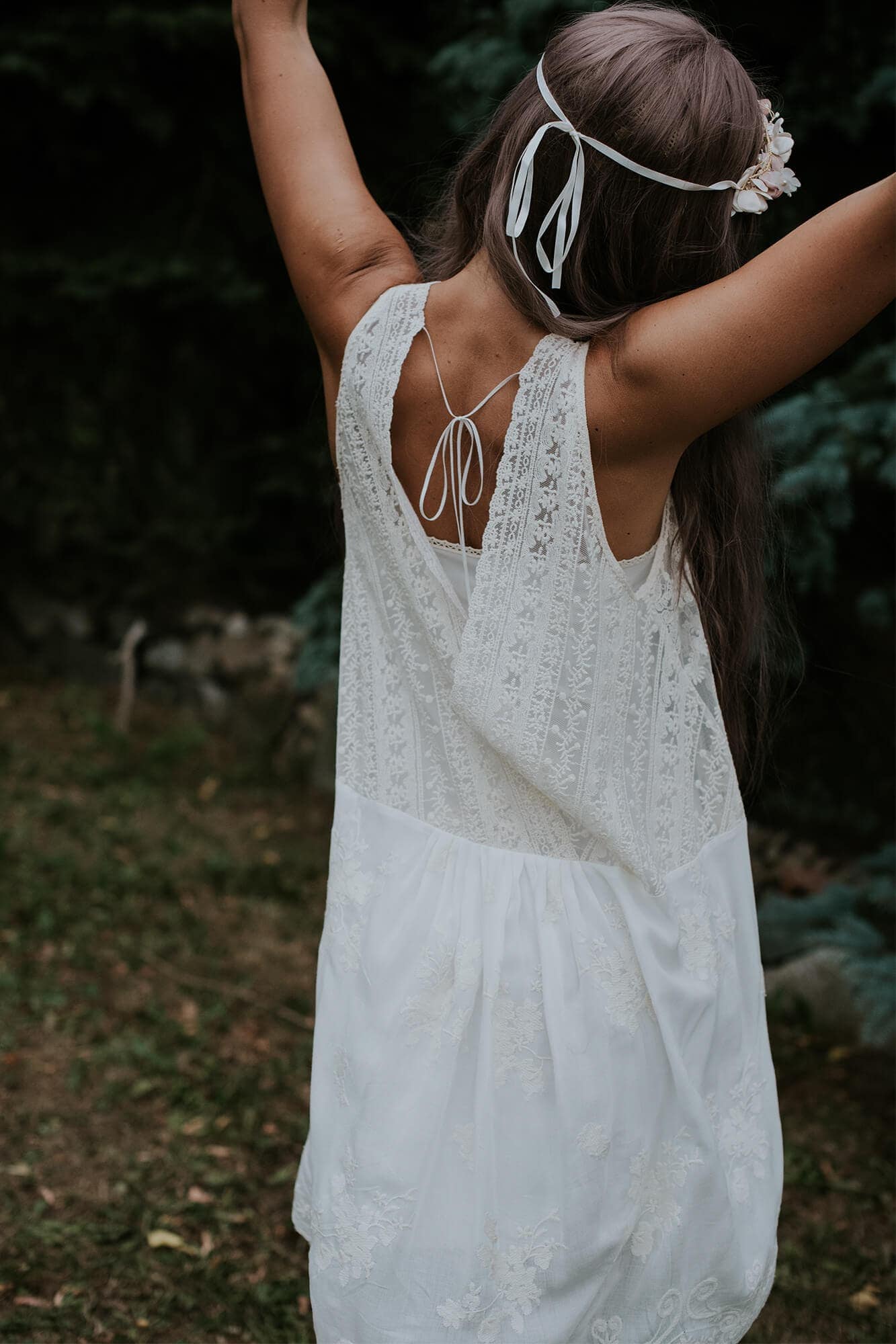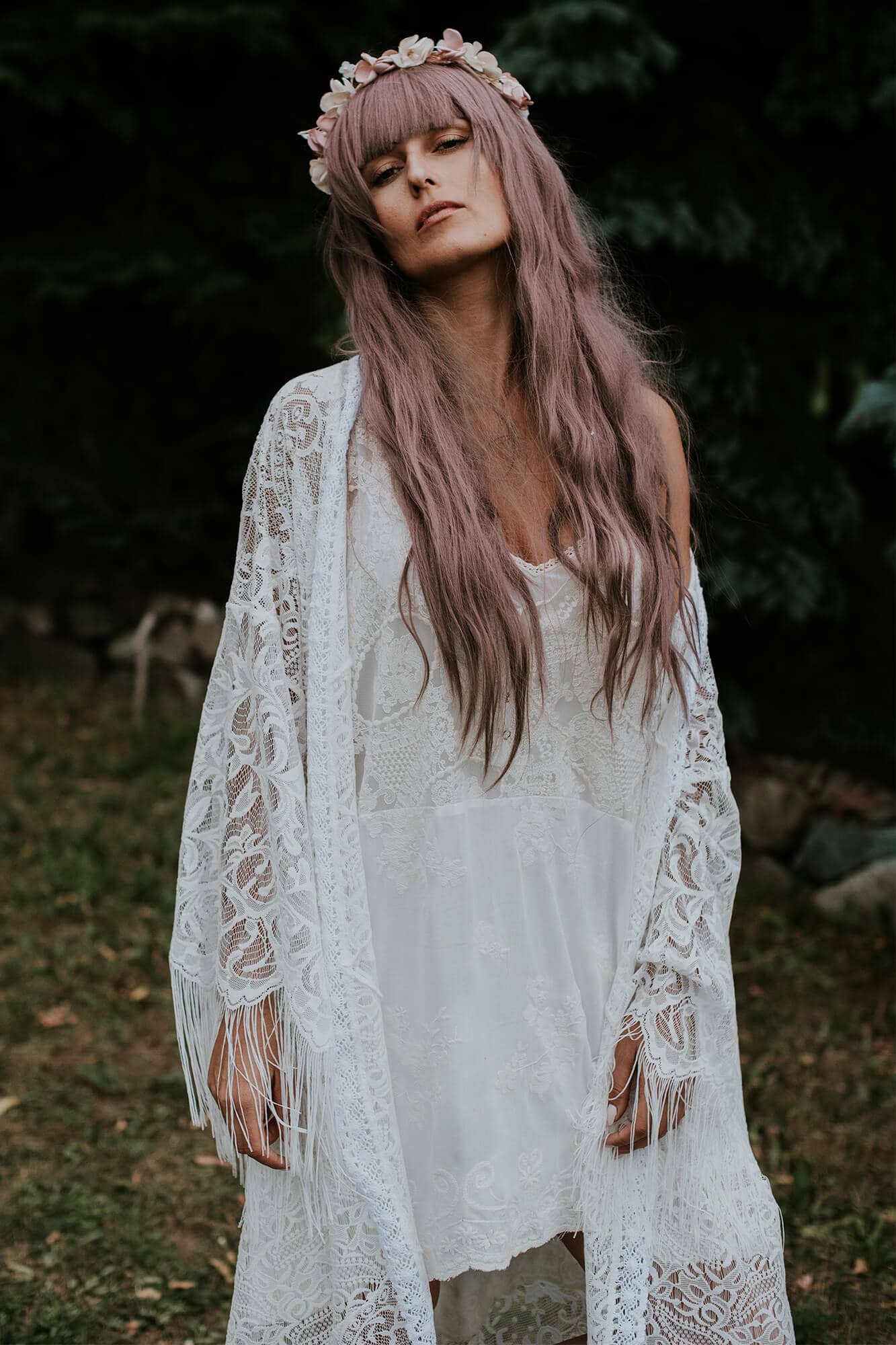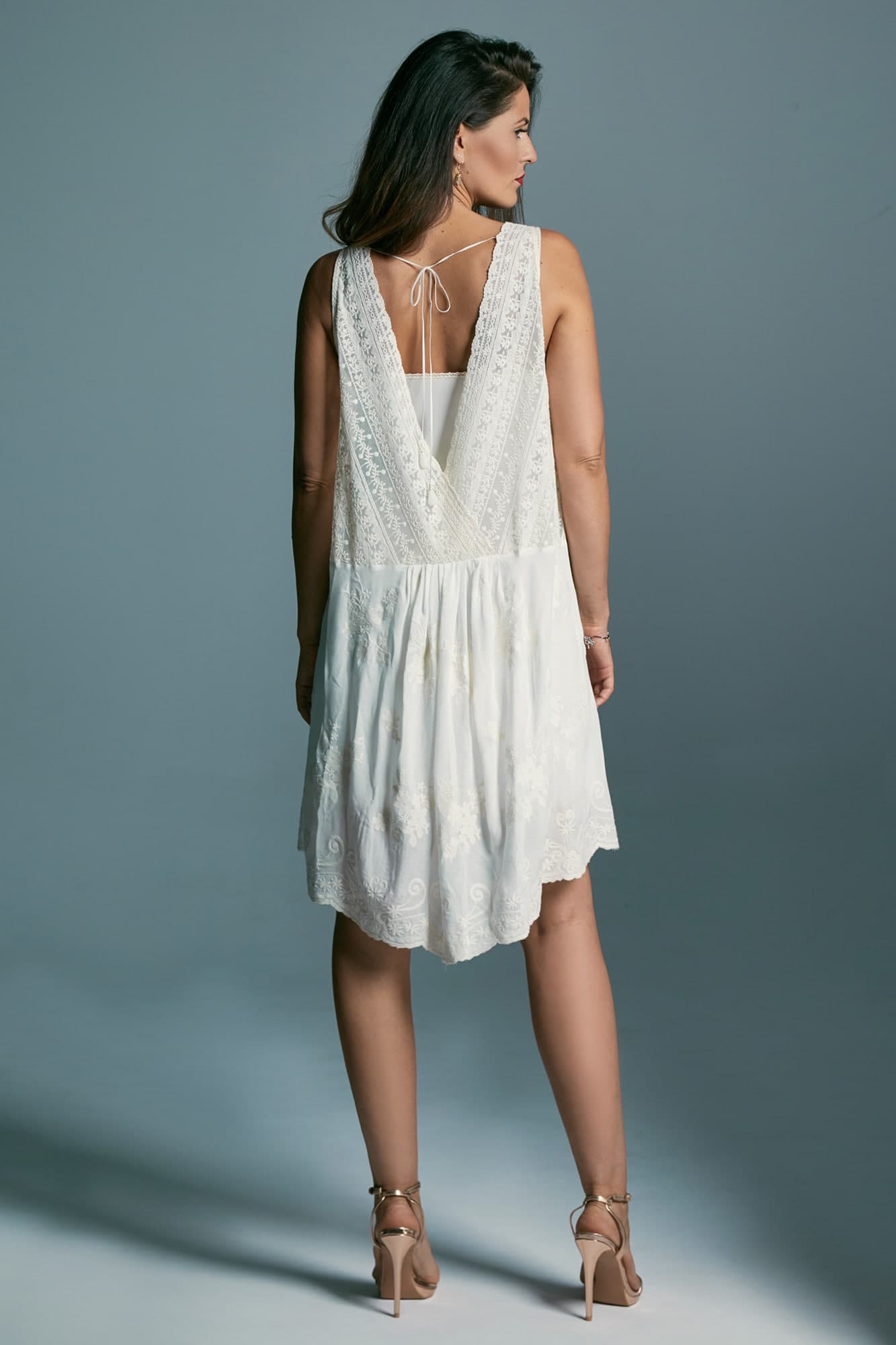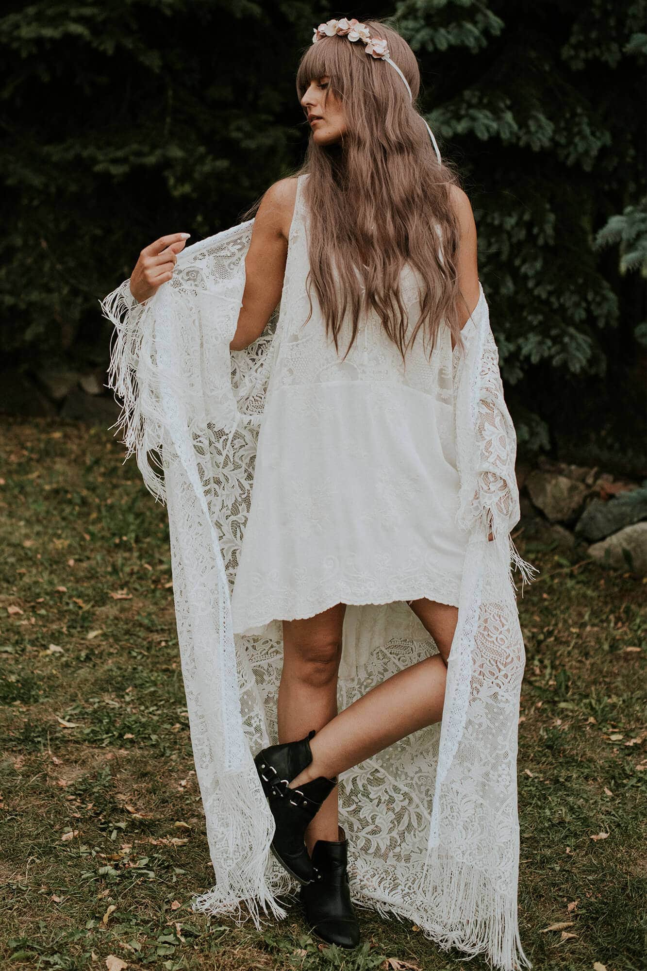 Boho to styl życia, a ubiór jest jego wyraźnym odzwierciedleniem. Łączenie wzorów i faktur oraz swobodne mieszanie ze sobą tkanin nie tylko nadaje stylizacji indywidualnego rysu, ale też sprawia, że staje się ona wyjątkowo ciekawa. Krótka sukienka boho, którą właśnie widzisz, powstała z miłości do nieskrępowanego żadnymi konwenansami stylu, który czerpie to co najlepsze z wielu różnych nurtów. Sukienka została uszyta z bawełnianej tkaniny ozdobionej ciekawymi haftami w odcieniu beżu. Beż to naturalność, dlatego hafty w tym kolorze pięknie odbijają się na skórze, a jednocześnie pozostają wyjątkowo delikatne. Sukienka jest w zestawie z halką wykonaną z dżerseju – sukienkę można nosić w takim połączeniu, ale można ją założyć również na strój kąpielowy czy top. Będzie idealna jako kreacja na poprawiny lub skromny ślub w plenerze. Jeśli marzy Ci się ceremonia na łonie natury, wianek we włosach i suknia idealnie pasująca do tego klimatu to ta krótka sukienka boho na pewno spełni Twoje oczekiwania. Głęboki dekolt z przodu i seksowne wycięcie na plecach to przepięknie detale, których zwieńczeniem jest subtelne wiązanie na karku. Zastosowane rozwiązania optycznie wydłużają sylwetkę oraz podkreślają szyję i biust. Ta propozycja to też sukienka wizytowa, którą po ślubie będziesz mogła założyć na wszystkie wyjątkowe wyjścia, ale też na co dzień – wystarczy, że dobierzesz do niej kryjącą podszewkę i mocniejsze dodatki. Niesamowicie stylowo prezentuje się w połączeniu z kowbojskimi botkami. Na zdjęciach możesz zobaczyć jaki efekt uzyskasz dołączając do sukni obszerną narzutkę z frędzlami – ona naprawdę sprawdzi się w różnych stylizacjach. Suknia jest bawełniana, więc nie musisz martwić się o komfort jej noszenia, jest naprawdę wygodna. Po ślubie, jeśli tylko chcesz, możesz zafarbować koronki i sprawić, że sukienka wizytowa zyska zupełnie nowe oblicze.