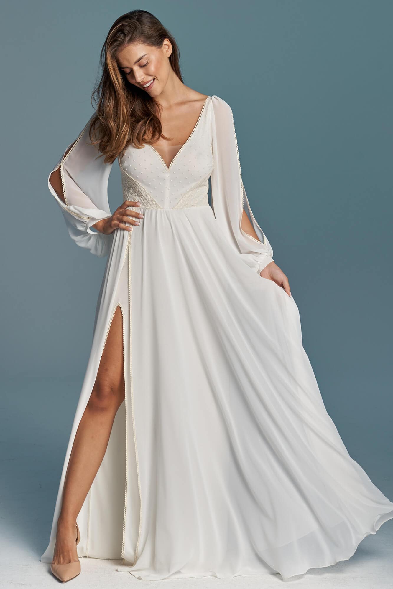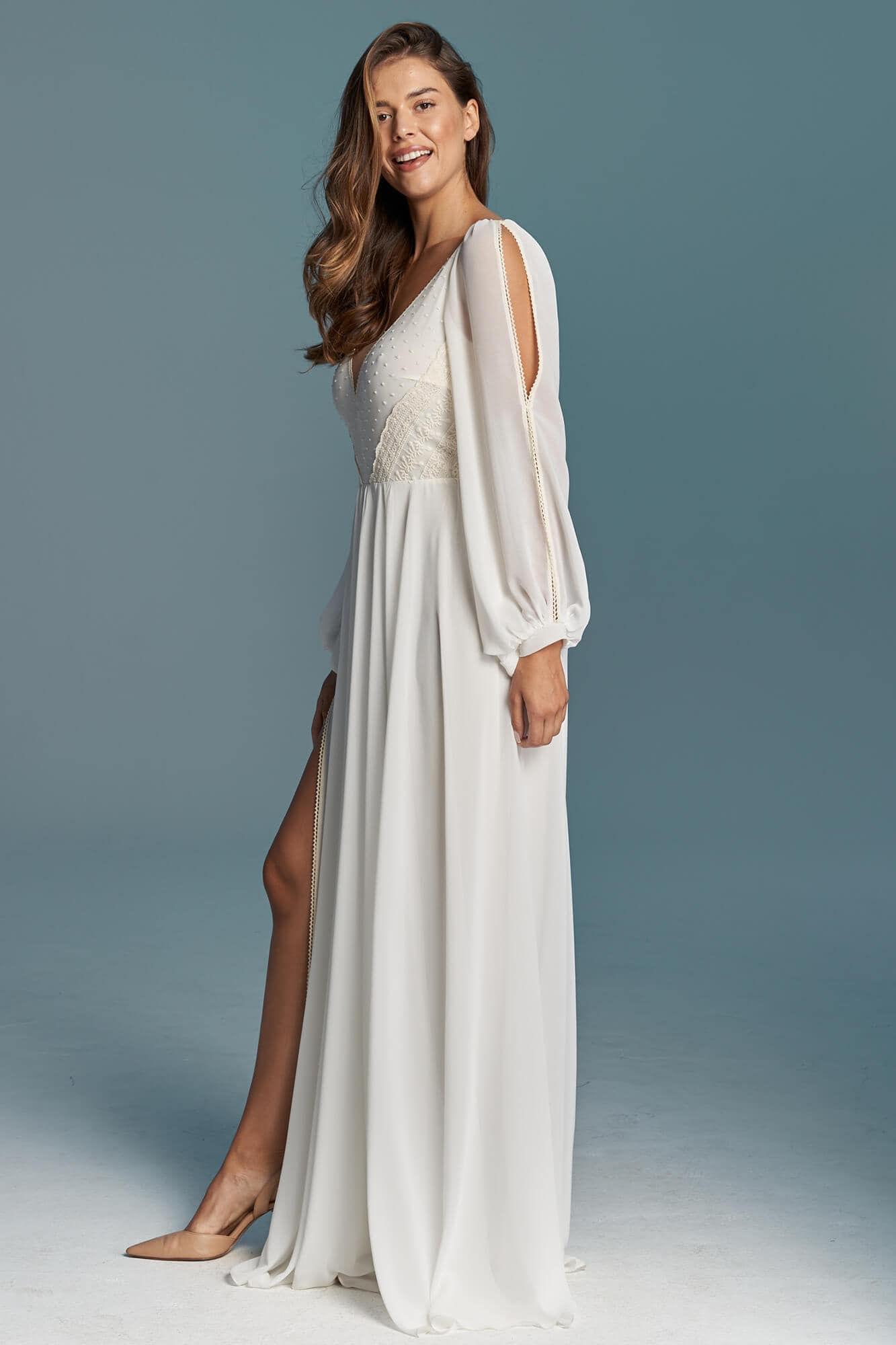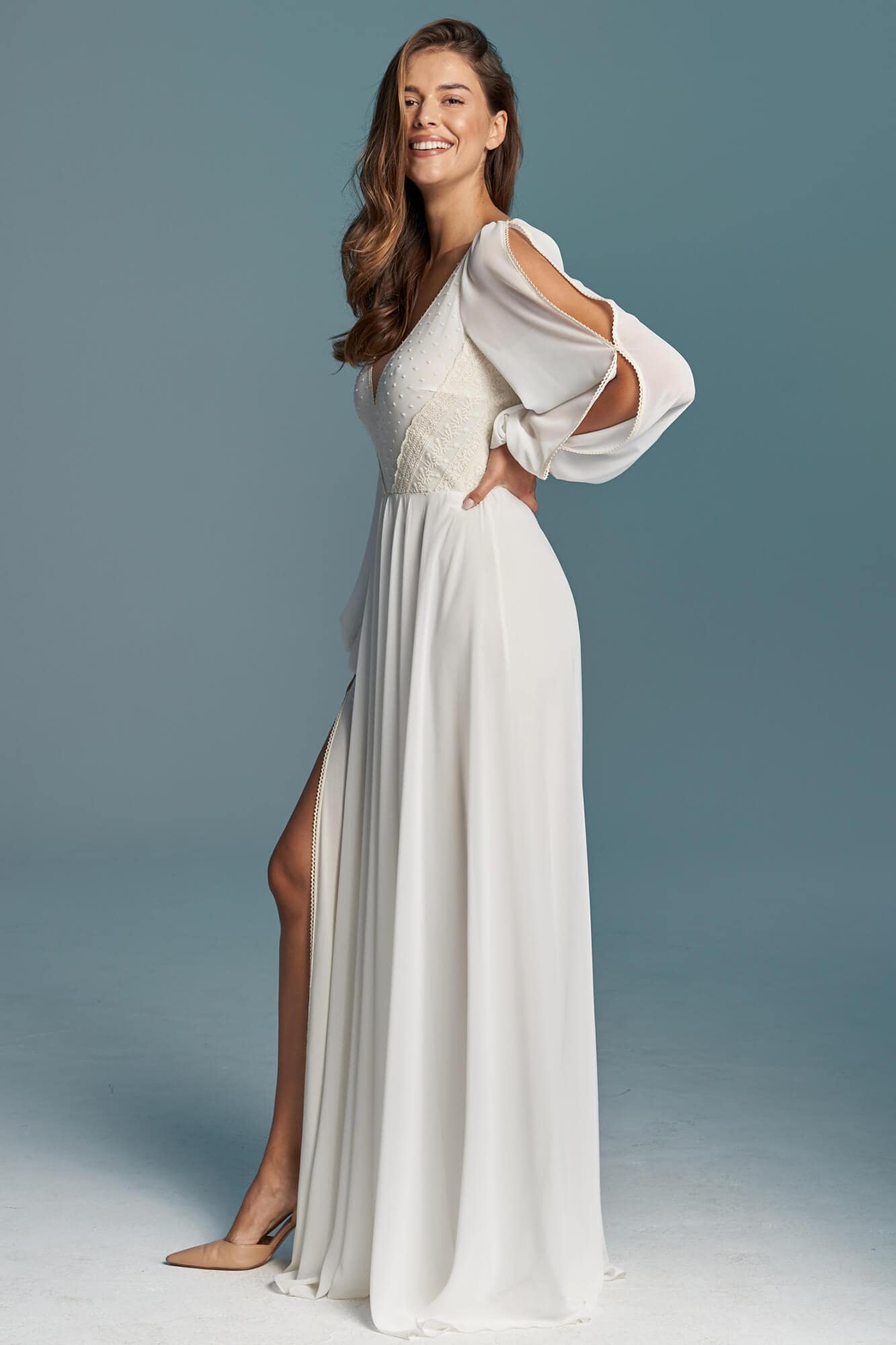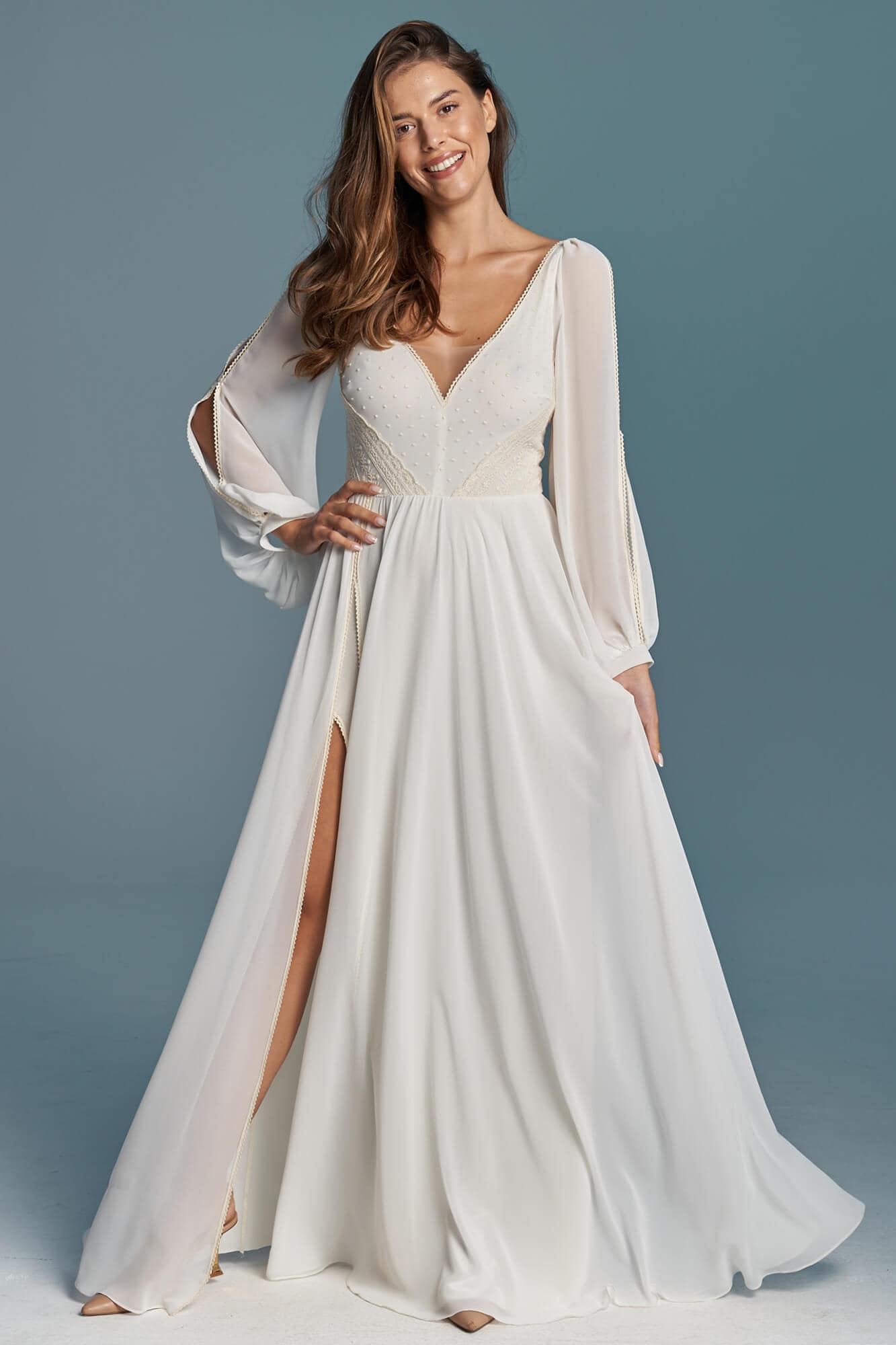 Klasyczna suknia ślubna z szyfonu odcieniu ivory. Niesamowicie zmysłowa, kobieca, lekka i zwiewna. Na nodze znajduje się efektowny rozporek w obu warstwach materiału – szyfonie i miękkiej, elastycznej podszewce. Obie warstwy zostały wykończone cienką, bawełnianą tasiemką w kolorze beżowym, która nawiązuje do góry sukni. Motyw tasiemki jest również powtórzony na lejących rękawach z pęknięciami. Suknia ślubna z długim rękawem to marzenie wielu Panien Młodych. Te luźne, bufiaste rękawy zapewnią Ci swobodę ruchu, będą przewiewne i co równie ważne – bardzo fotogeniczne! Jeśli nie przepadasz za swoimi rękoma lub uważasz, że masz zbyt szerokie ramiona to rękaw tego typu pomoże Ci subtelnie zamaskować to czego nie lubisz, jednocześnie optycznie nie powiększając tych partii (w przeciwieństwie do obcisłego rękawa z gęstej koronki). Góra sukni to barwne i niezwykle ciekawe zestawienie różnych faktur, wzorów oraz kolorów. Okolice biustu zostały pokryte beżowymi kropeczkami na kremowym tle. Po bokach zostały naszyte beżowe paseczki ułożone diagonalnie – ten zabieg niesamowicie podkreśla talię! Dekolt ma kształt subtelnego serduszka, dzięki czemu jest kobiecy a nie wulgarny i bardzo ładnie podkreśla linię biustu. Ta minimalistyczna suknia ślubna jest stworzona dla fanek klasyki i prostoty, ale jednocześnie dla tych kochających oryginalny design! Każdy detal jest przemyślany tak, by pięknie modelował sylwetkę i pięknie wyglądał w ruchu, tańcu.