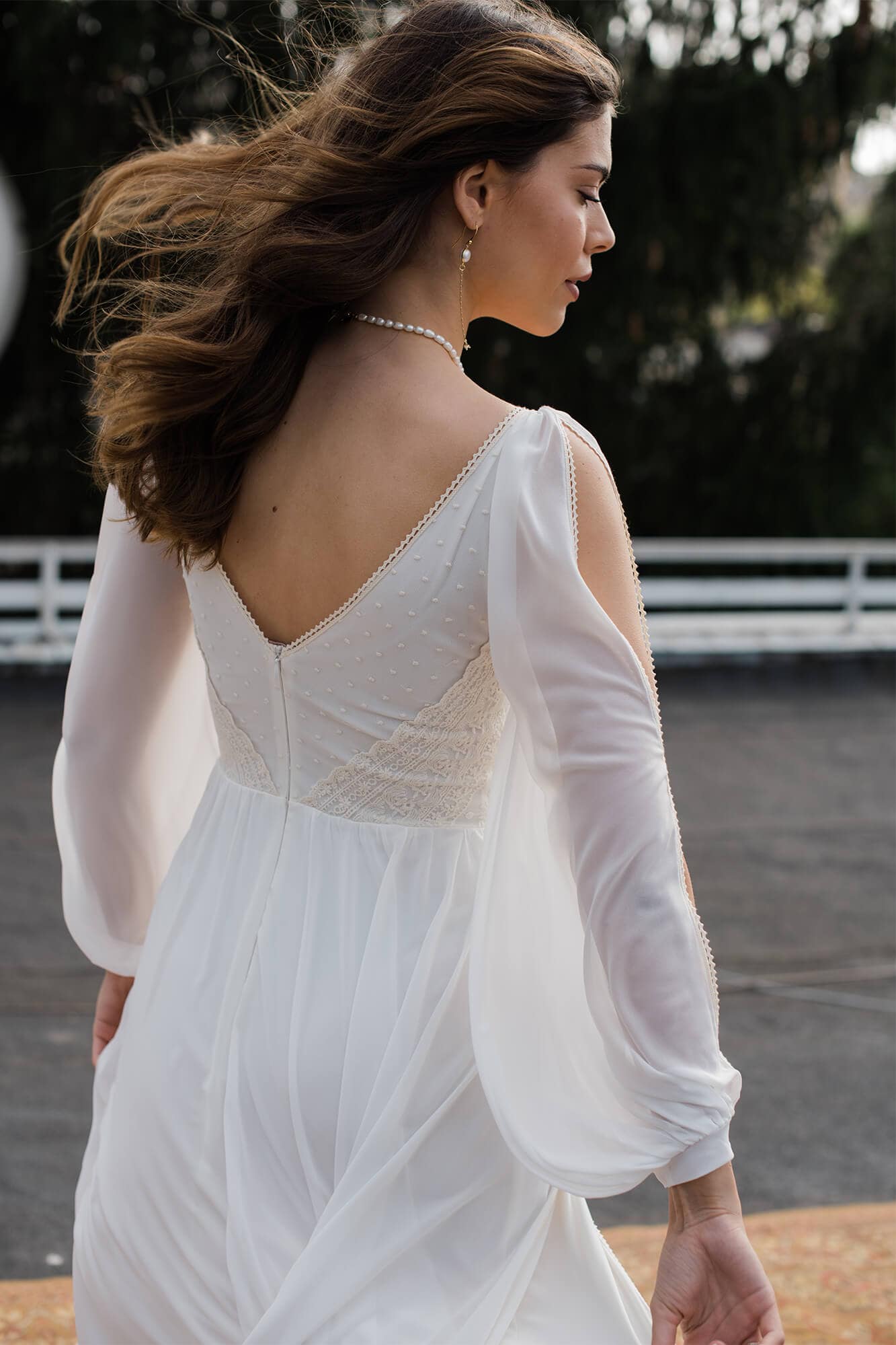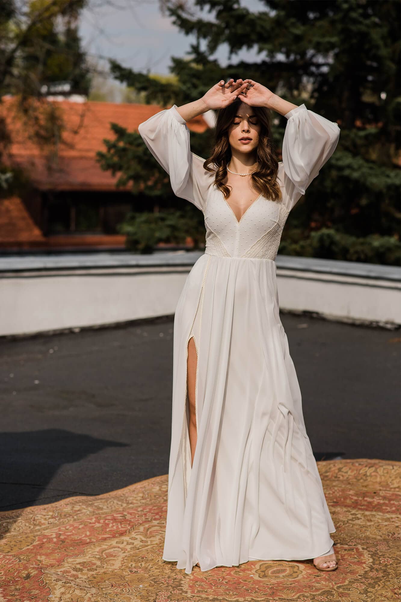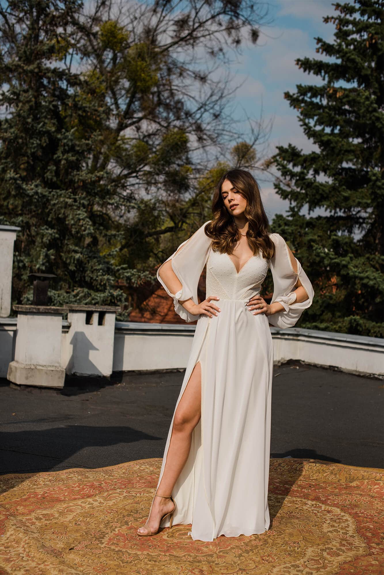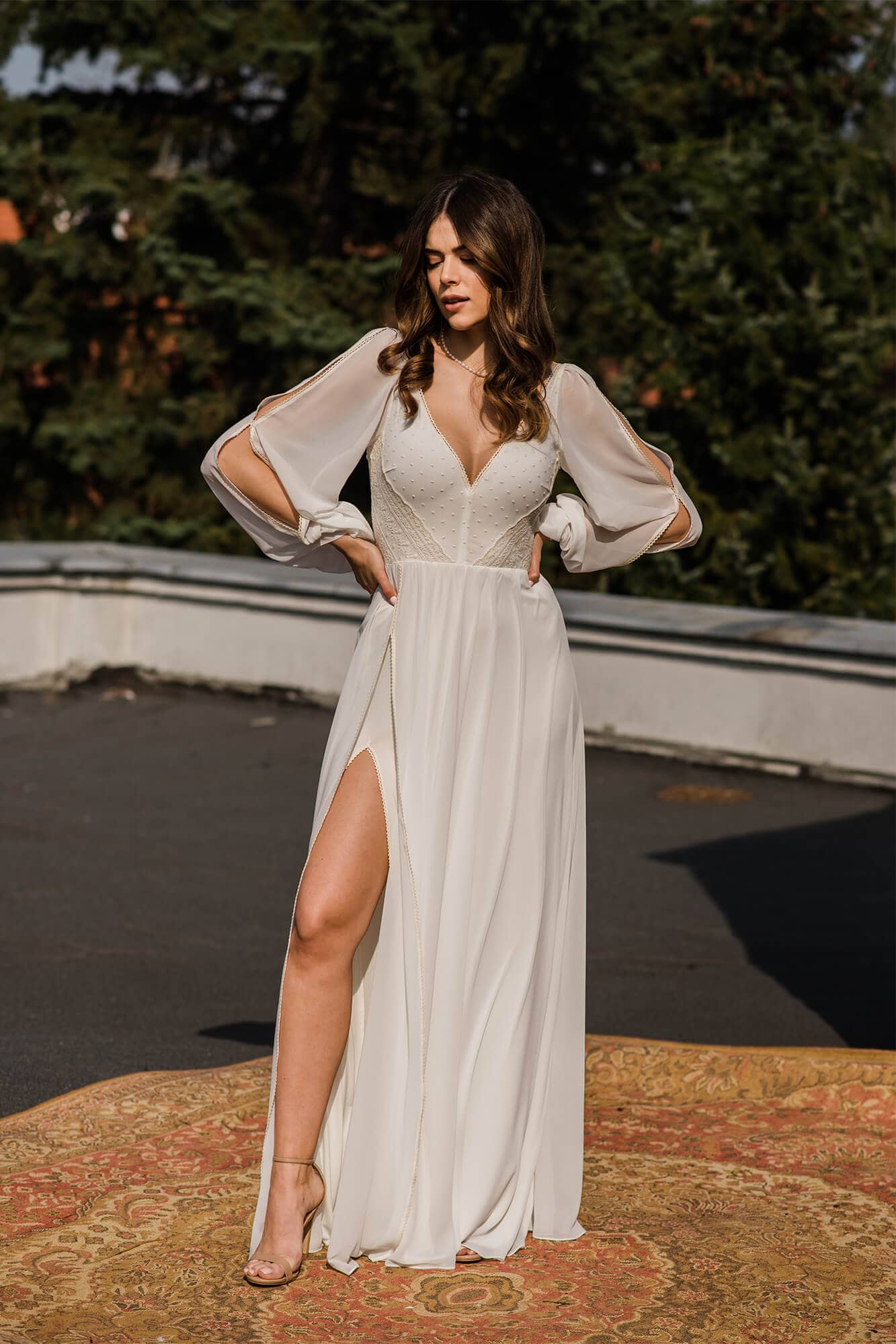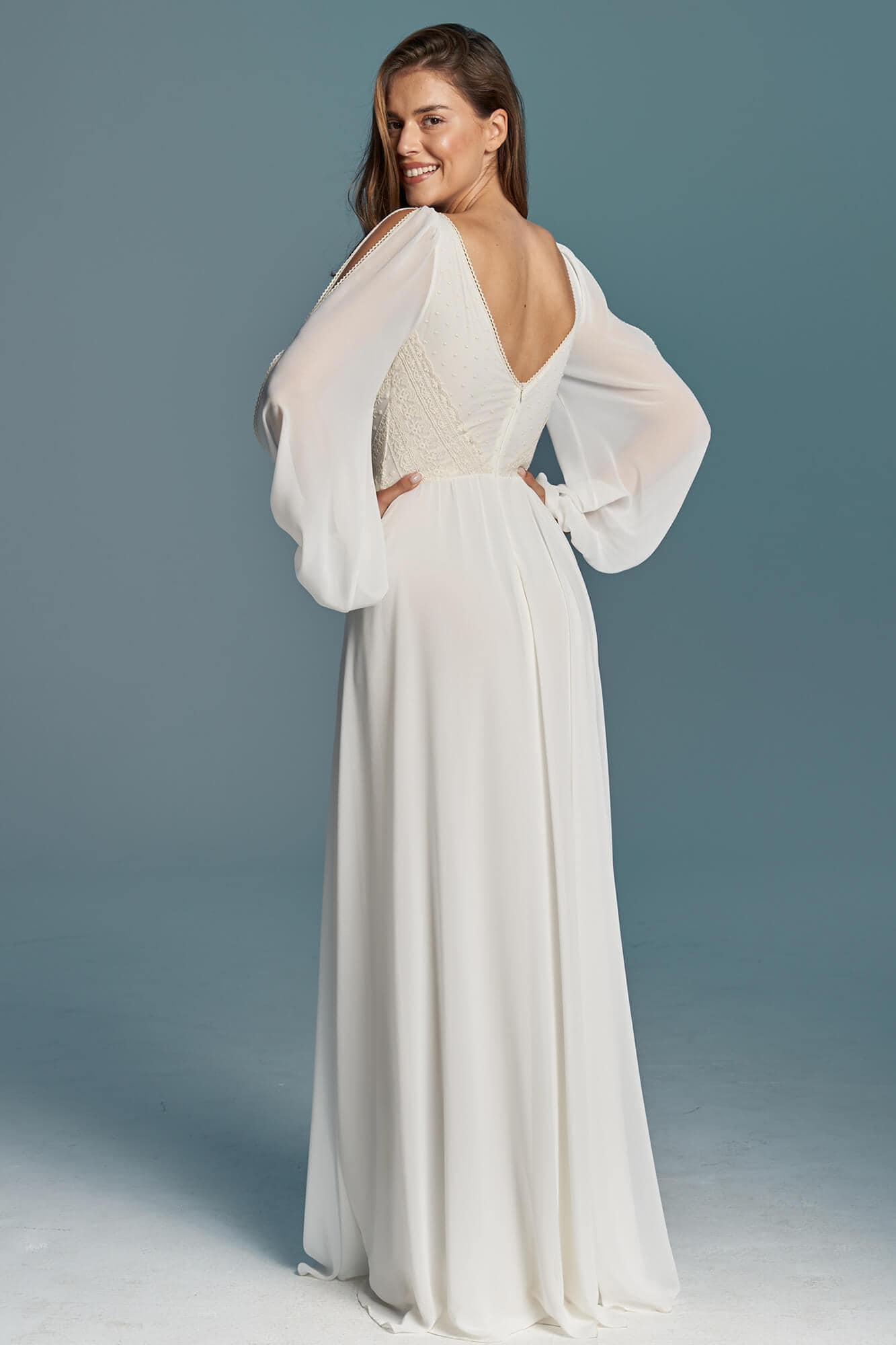 Klasyczna suknia ślubna z szyfonu odcieniu ivory. Niesamowicie zmysłowa, kobieca, lekka i zwiewna. Na nodze znajduje się efektowny rozporek w obu warstwach materiału – szyfonie i miękkiej, elastycznej podszewce. Obie warstwy zostały wykończone cienką, bawełnianą tasiemką w kolorze beżowym, która nawiązuje do góry sukni. Motyw tasiemki jest również powtórzony na lejących rękawach z pęknięciami. Suknia ślubna z długim rękawem to marzenie wielu Panien Młodych. Te luźne, bufiaste rękawy zapewnią Ci swobodę ruchu, będą przewiewne i co równie ważne – bardzo fotogeniczne! Jeśli nie przepadasz za swoimi rękoma lub uważasz, że masz zbyt szerokie ramiona to rękaw tego typu pomoże Ci subtelnie zamaskować to czego nie lubisz, jednocześnie optycznie nie powiększając tych partii (w przeciwieństwie do obcisłego rękawa z gęstej koronki). Góra sukni to barwne i niezwykle ciekawe zestawienie różnych faktur, wzorów oraz kolorów. Okolice biustu zostały pokryte beżowymi kropeczkami na kremowym tle. Po bokach zostały naszyte beżowe paseczki ułożone diagonalnie – ten zabieg niesamowicie podkreśla talię! Dekolt ma kształt subtelnego serduszka, dzięki czemu jest kobiecy a nie wulgarny i bardzo ładnie podkreśla linię biustu. Ta minimalistyczna suknia ślubna jest stworzona dla fanek klasyki i prostoty, ale jednocześnie dla tych kochających oryginalny design! Każdy detal jest przemyślany tak, by pięknie modelował sylwetkę i pięknie wyglądał w ruchu, tańcu.
