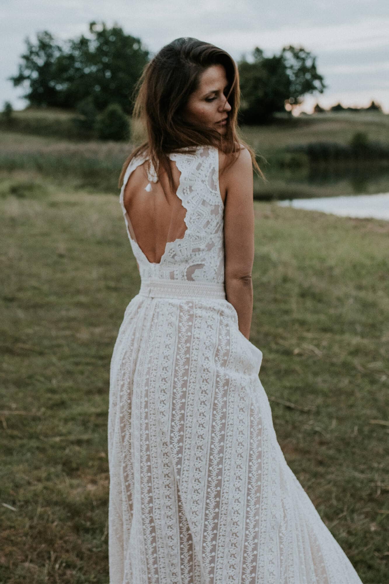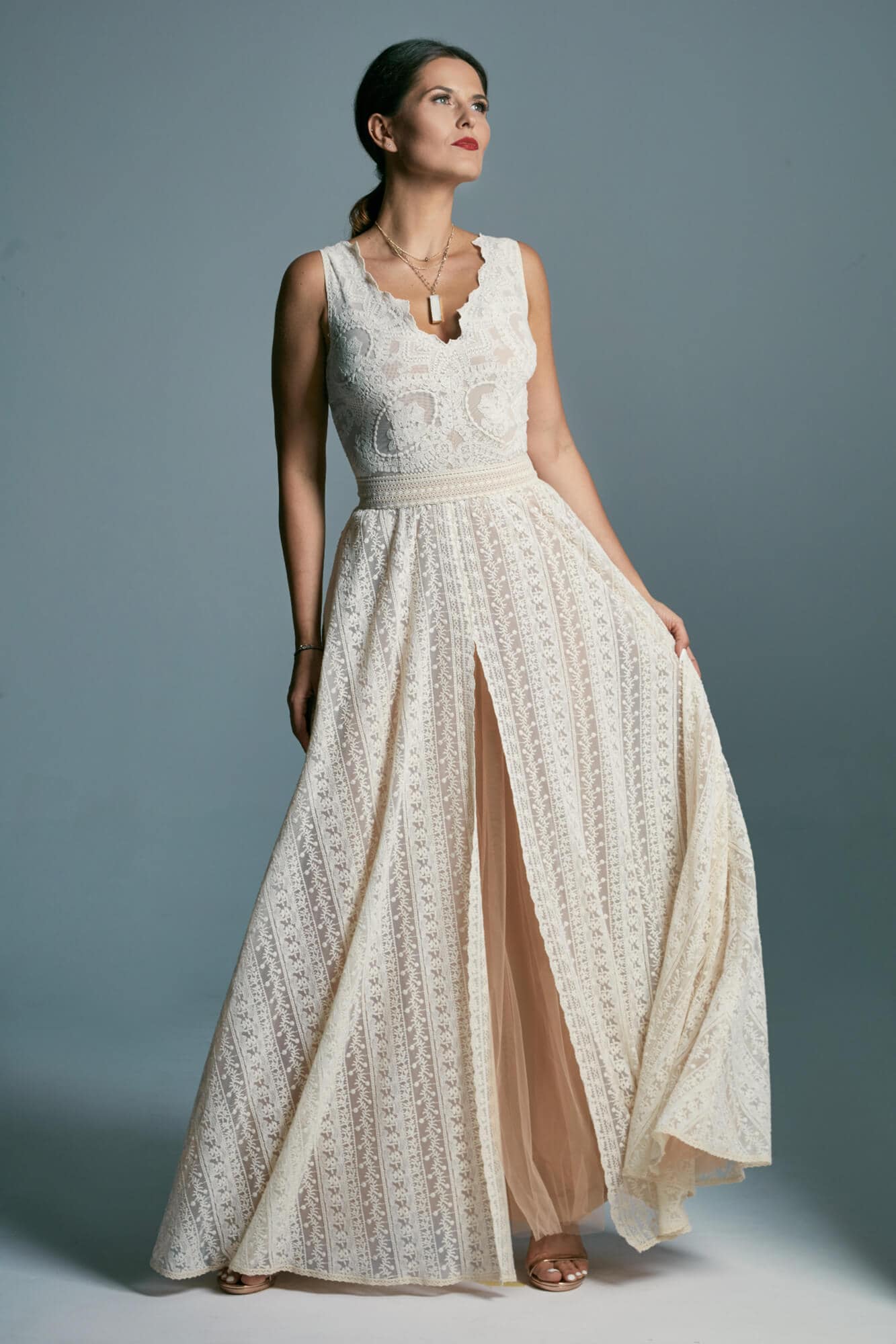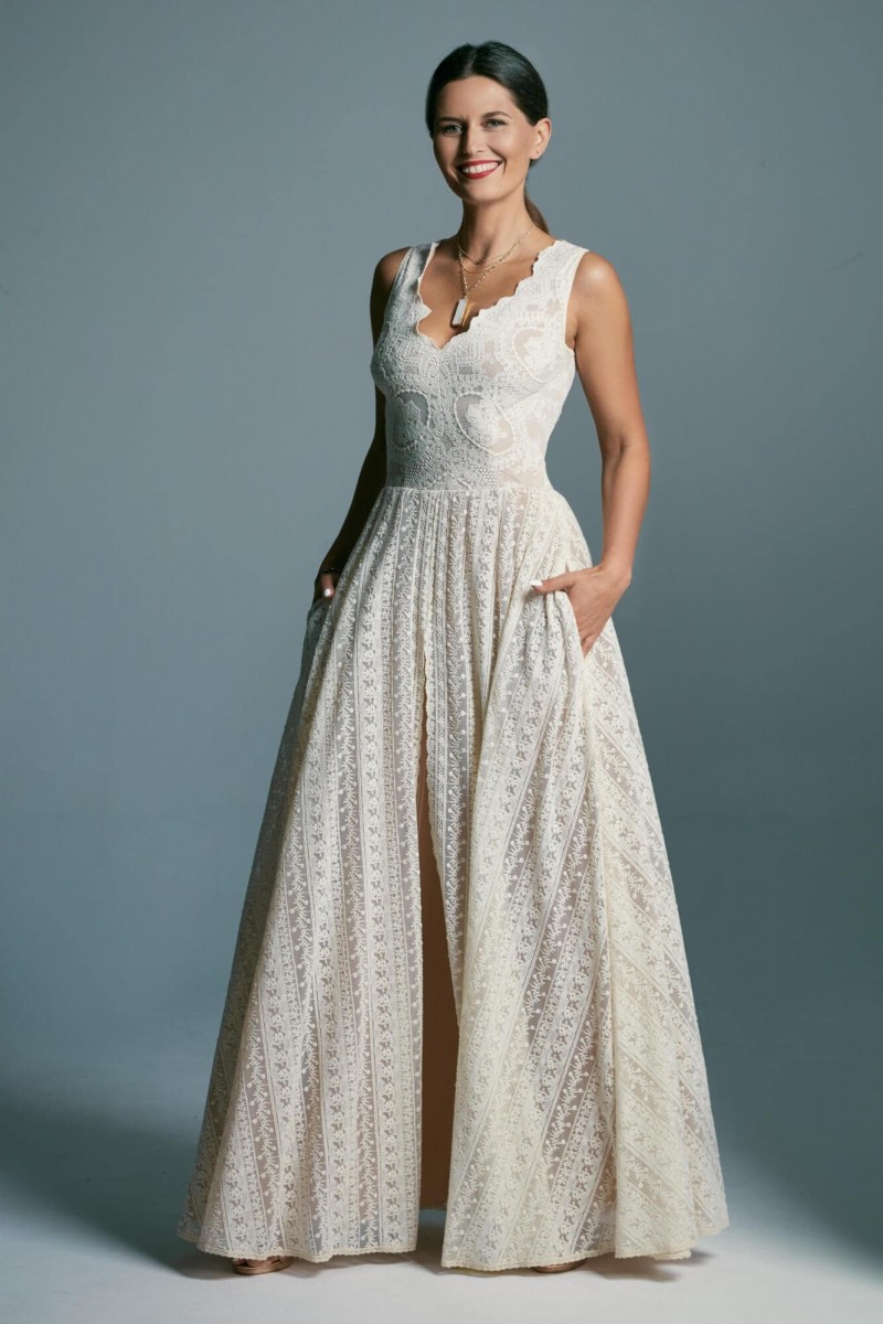 Boho suknia ślubna z bawełnianej, beżowej koronki, z obfitą spódnicą. Idealna propozycja dla dziewczyn, które kochają sielskie klimaty, ale jednocześnie chcą wyglądać elegancko. W oryginale suknia odsłania ramiona, plecy są wycięte, podszewka jest cielista, kontrastowa dla beżowej koronki a spódnica – mimo rozcięcia – nie odsłania nóg. Pamiętaj jednak, że szyjąc ten model dla Ciebie na miarę możemy dodać dowolne rękawy, zmienić objętość spódnicy, dodać rozcięcie w podszewce, po to by pokazać nogi, wymienić kolor podbicia na biały lub piaskowy czy przebudować plecy tak, by dało się założyć biustonosz.