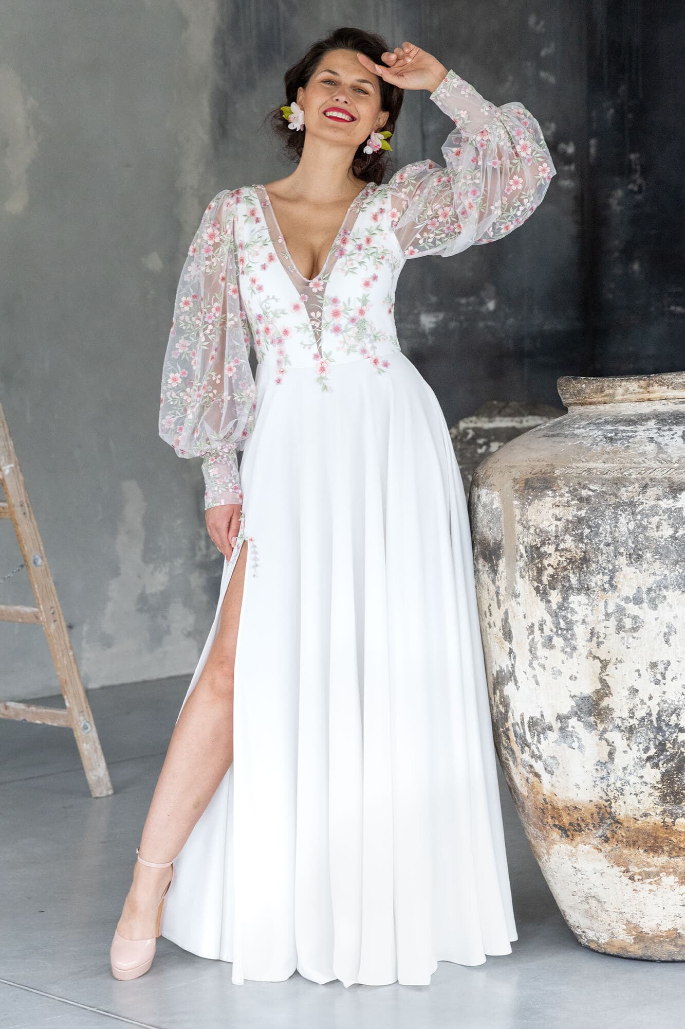 Ta suknia to model wyjściowy - możemy w niej zmienić praktycznie wszystko! Pogłębić lub spłycić dekolt, zmienić jego wykończenie, kształt, dodać lub odjąć falbankę czy frędzle. Rękawy mogą być dłuższe lub krótsze, mieć inny kształt niż te na zdjęciu. Może też nie być ich wcale. Tiul w spódnicy można dodać (lub odjąć) na wierzchu, albo pod spodem. Podszewka może być długa lub krótka w odcieniach bieli i beżu. Rozcięcie na nogę i tren można dodać lub usunąć praktycznie w każdym modelu.