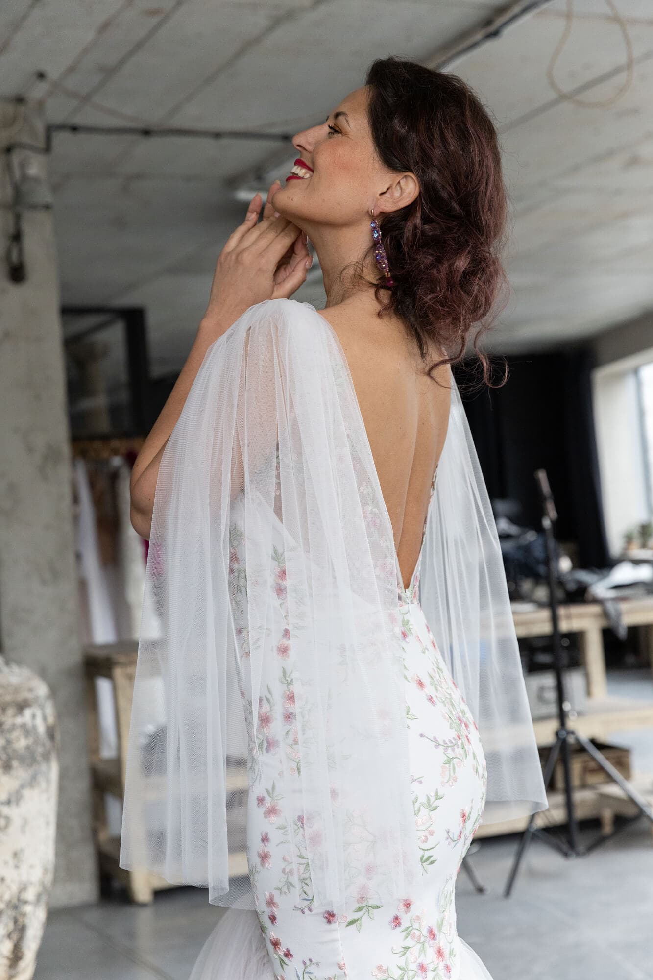 Ta suknia to model wyjściowy - możemy w niej zmienić praktycznie wszystko! Pogłębić lub spłycić dekolt, zmienić jego wykończenie, kształt, dodać lub odjąć falbankę czy frędzle. Rękawy mogą być dłuższe lub krótsze, mieć inny kształt niż te na zdjęciu. Może też nie być ich wcale. Tiul w spódnicy można dodać (lub odjąć) na wierzchu, albo pod spodem. Podszewka może być długa lub krótka w odcieniach bieli i beżu. Rozcięcie na nogę i tren można dodać lub usunąć praktycznie w każdym modelu.