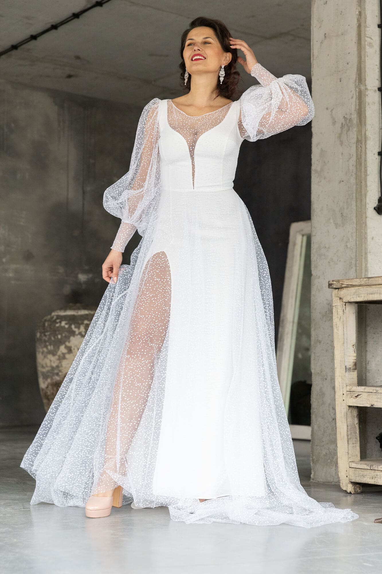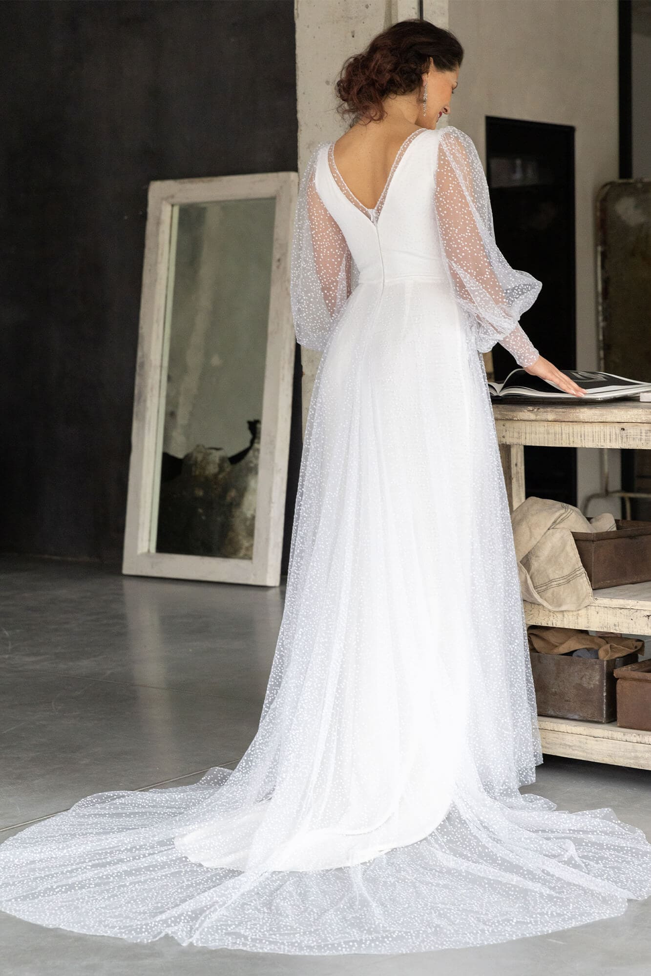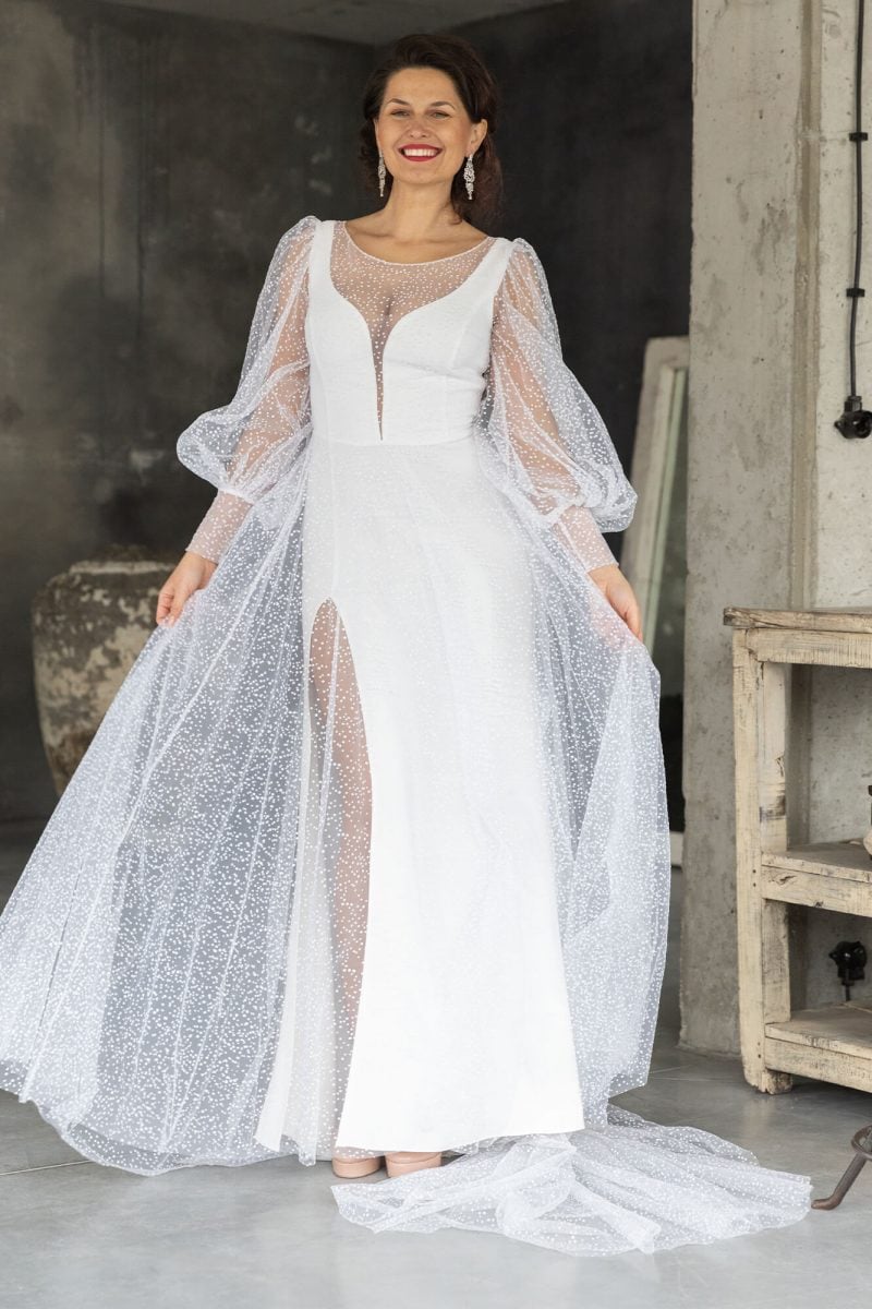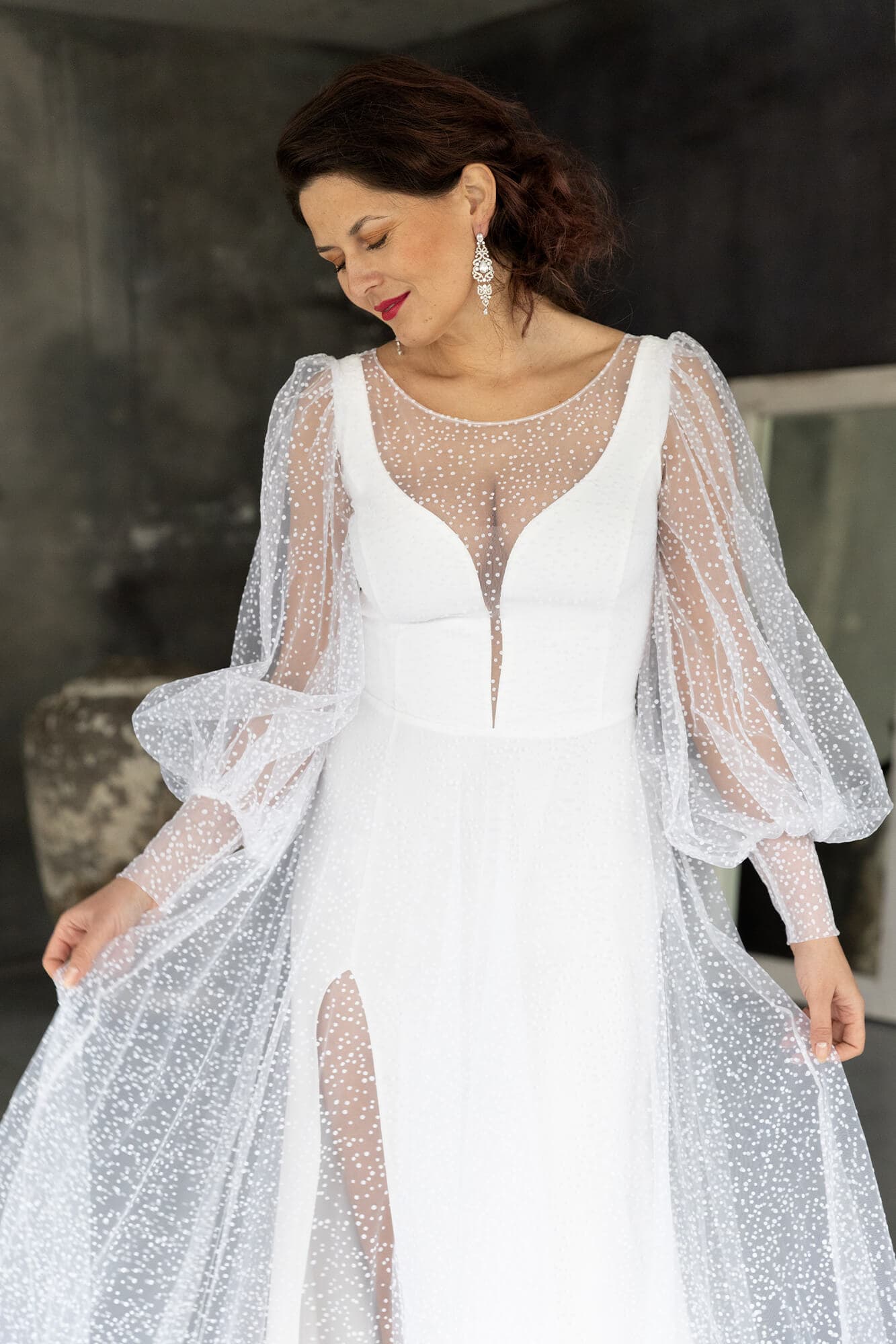 Ta suknia to model wyjściowy - możemy w niej zmienić praktycznie wszystko! Pogłębić lub spłycić dekolt, zmienić jego wykończenie, kształt, dodać lub odjąć falbankę czy frędzle. Rękawy mogą być dłuższe lub krótsze, mieć inny kształt niż te na zdjęciu. Może też nie być ich wcale. Tiul w spódnicy można dodać (lub odjąć) na wierzchu, albo pod spodem. Podszewka może być długa lub krótka w odcieniach bieli i beżu. Rozcięcie na nogę i tren można dodać lub usunąć praktycznie w każdym modelu.
