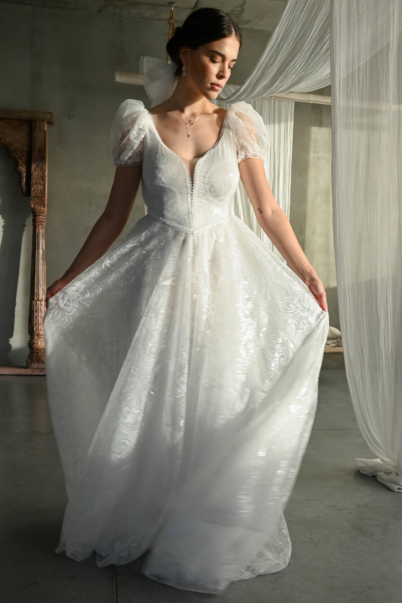 Twoja suknia zostanie uszyta z niesamowicie miękkiego, lekkiego i lejącego szyfonu, który będzie się poruszał nawet przy lekkim ruchu powietrza. Jeśli marzysz o klasycznej sukni ślubnej, ale przeraża Cię jej ciężar lub niewygodny gorset to jest to idealne rozwiązanie dla Ciebie! Ta suknia jest tak lekka, że możesz zapomnieć ją założyć! A podszewka tak elastyczna, że nie będziesz chciała jej zdjąć! Diabeł tkwi w szczegółach - zobacz subtelne wykończenia.