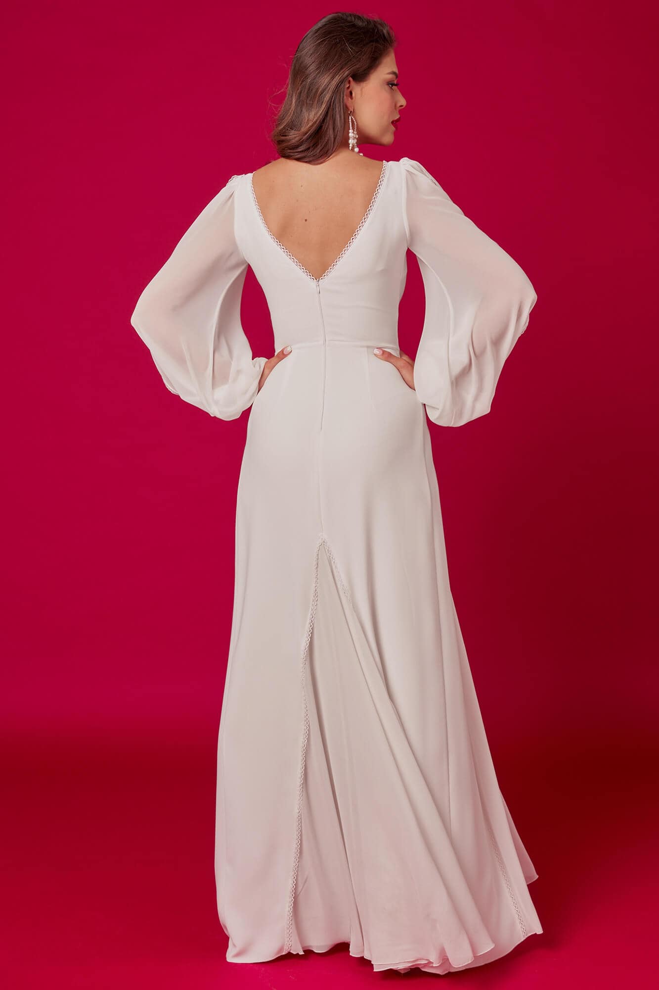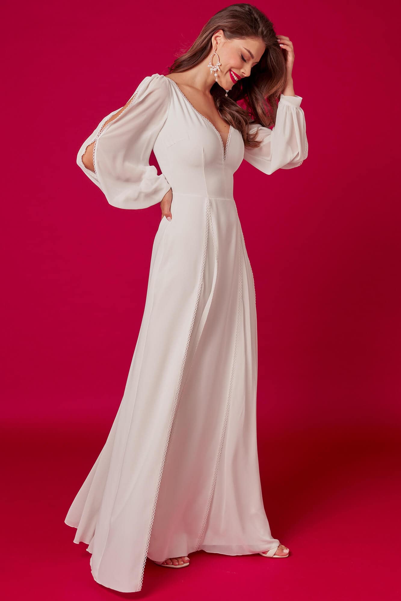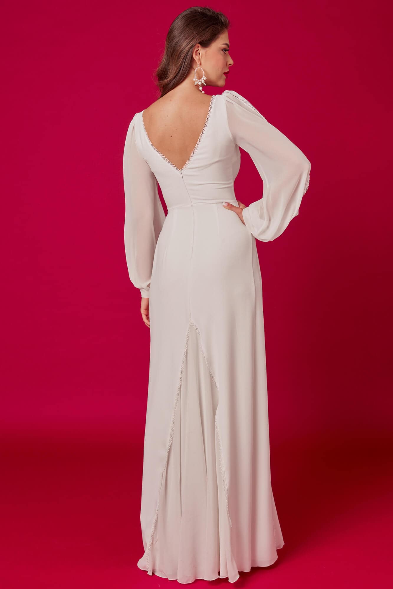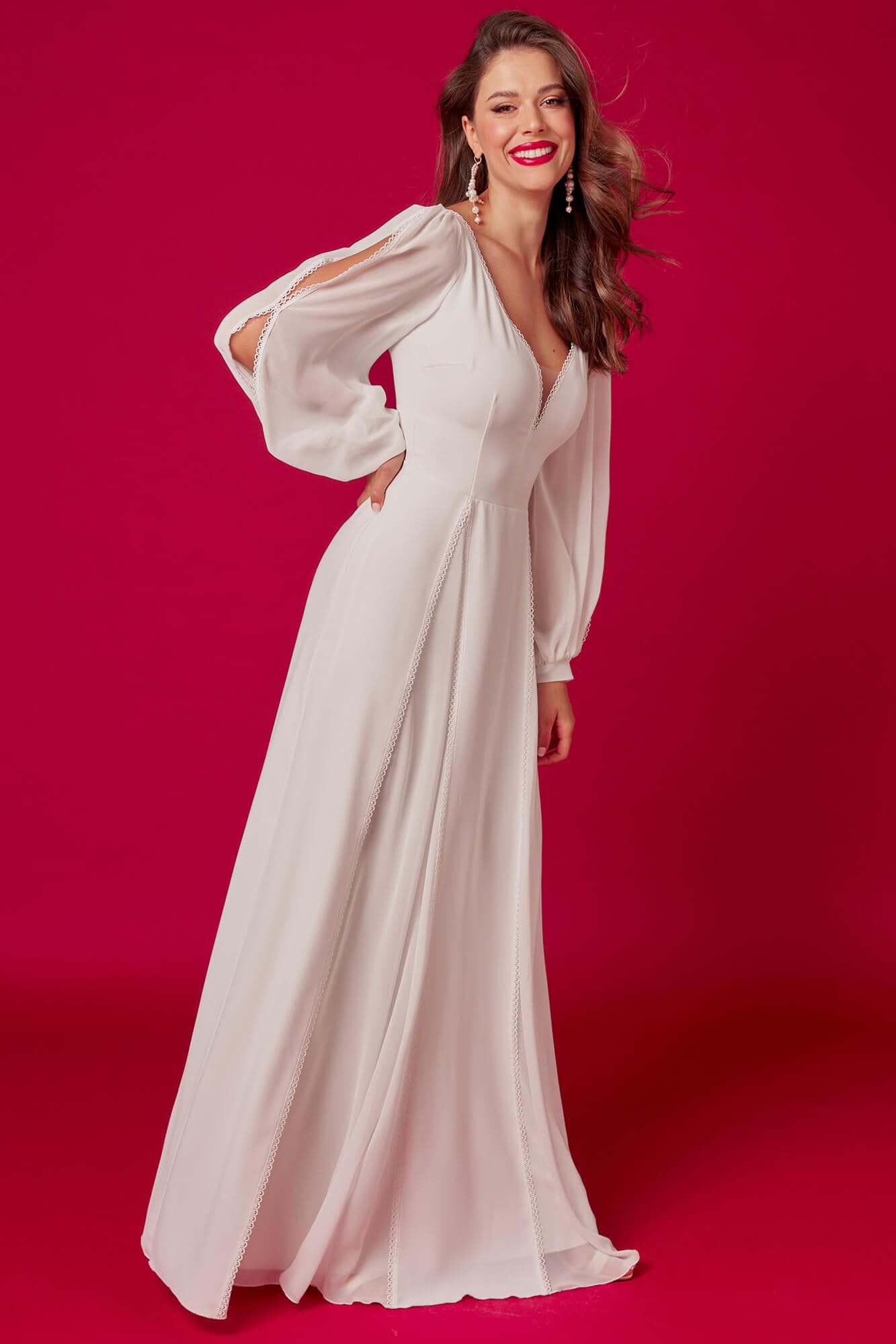 Twoja suknia zostanie uszyta z niesamowicie miękkiego, lekkiego i lejącego szyfonu, który będzie się poruszał nawet przy lekkim ruchu powietrza. Jeśli marzysz o klasycznej sukni ślubnej, ale przeraża Cię jej ciężar lub niewygodny gorset to jest to idealne rozwiązanie dla Ciebie! Ta suknia jest tak lekka, że możesz zapomnieć ją założyć! A podszewka tak elastyczna, że nie będziesz chciała jej zdjąć! Diabeł tkwi w szczegółach - zobacz subtelne wykończenia.