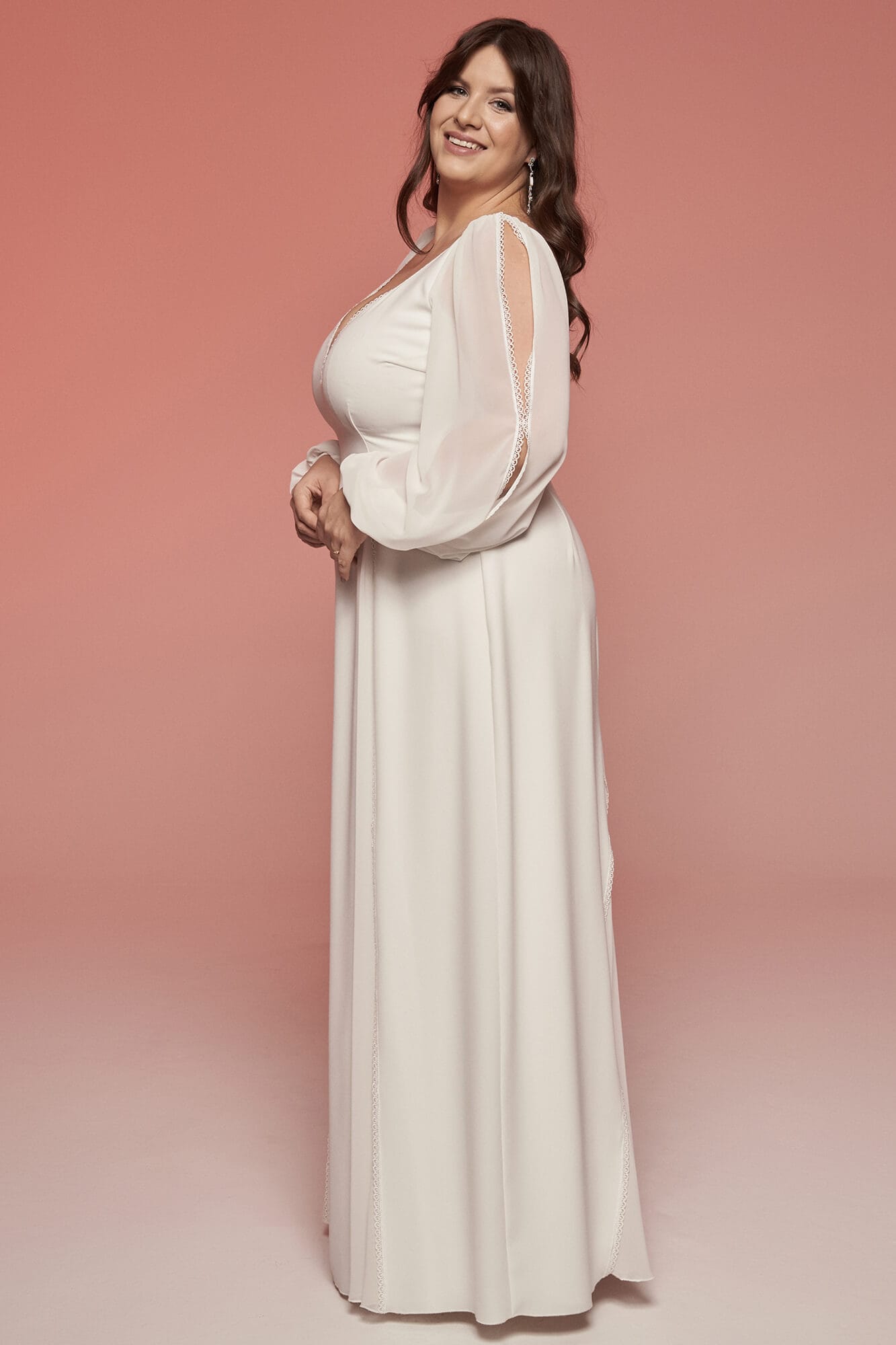 Twoja suknia zostanie uszyta z niesamowicie miękkiego, lekkiego i lejącego szyfonu, który będzie się poruszał nawet przy lekkim ruchu powietrza. Jeśli marzysz o klasycznej sukni ślubnej, ale przeraża Cię jej ciężar lub niewygodny gorset to jest to idealne rozwiązanie dla Ciebie! Ta suknia jest tak lekka, że możesz zapomnieć ją założyć! A podszewka tak elastyczna, że nie będziesz chciała jej zdjąć! Diabeł tkwi w szczegółach - zobacz subtelne wykończenia.