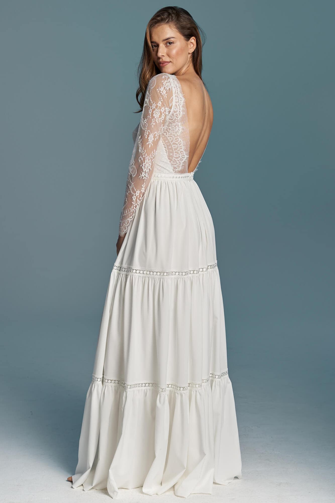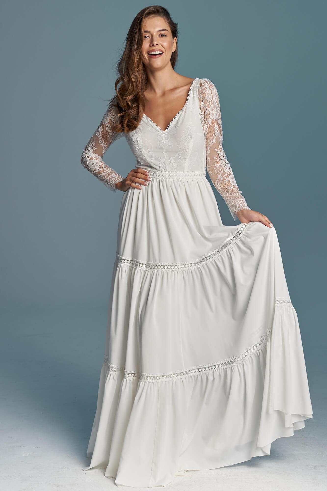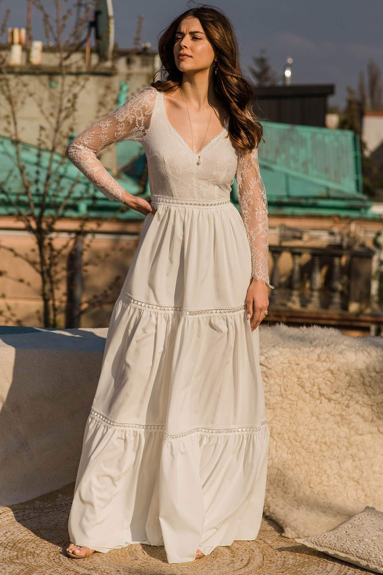 Ta suknia to model wyjściowy - możemy w niej zmienić praktycznie wszystko! Pogłębić lub spłycić dekolt, zmienić jego wykończenie, kształt, dodać lub odjąć falbankę czy frędzle. Rękawy mogą być dłuższe lub krótsze, mieć inny kształt niż te na zdjęciu. Może też nie być ich wcale. Tiul w spódnicy można dodać (lub odjąć) na wierzchu, albo pod spodem. Podszewka może być długa lub krótka w odcieniach bieli i beżu. Rozcięcie na nogę i tren można dodać lub usunąć praktycznie w każdym modelu.