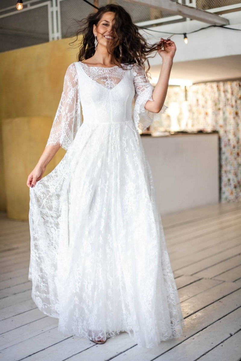 Ta suknia to model wyjściowy - możemy w niej zmienić praktycznie wszystko! Pogłębić lub spłycić dekolt, zmienić jego wykończenie, kształt, dodać lub odjąć falbankę czy frędzle. Rękawy mogą być dłuższe lub krótsze, mieć inny kształt niż te na zdjęciu. Może też nie być ich wcale. Tiul w spódnicy można dodać (lub odjąć) na wierzchu, albo pod spodem. Podszewka może być długa lub krótka w odcieniach bieli i beżu. Rozcięcie na nogę i tren można dodać lub usunąć praktycznie w każdym modelu.