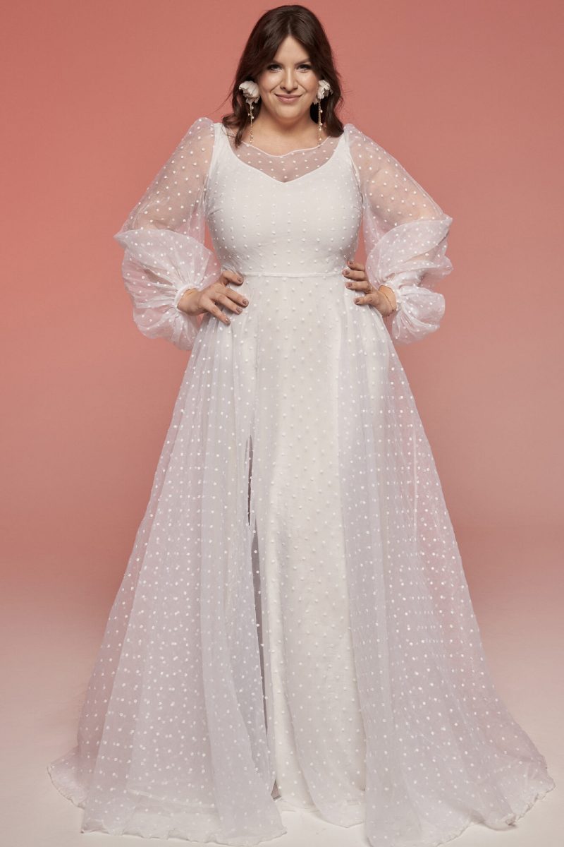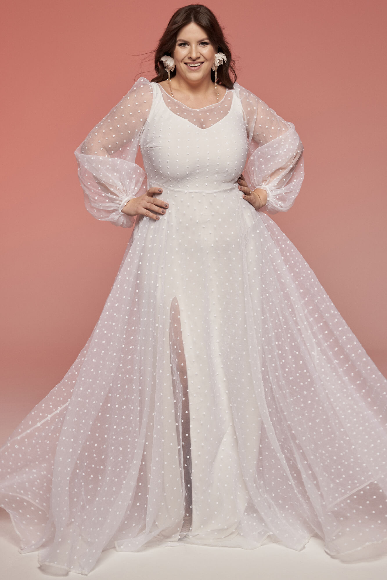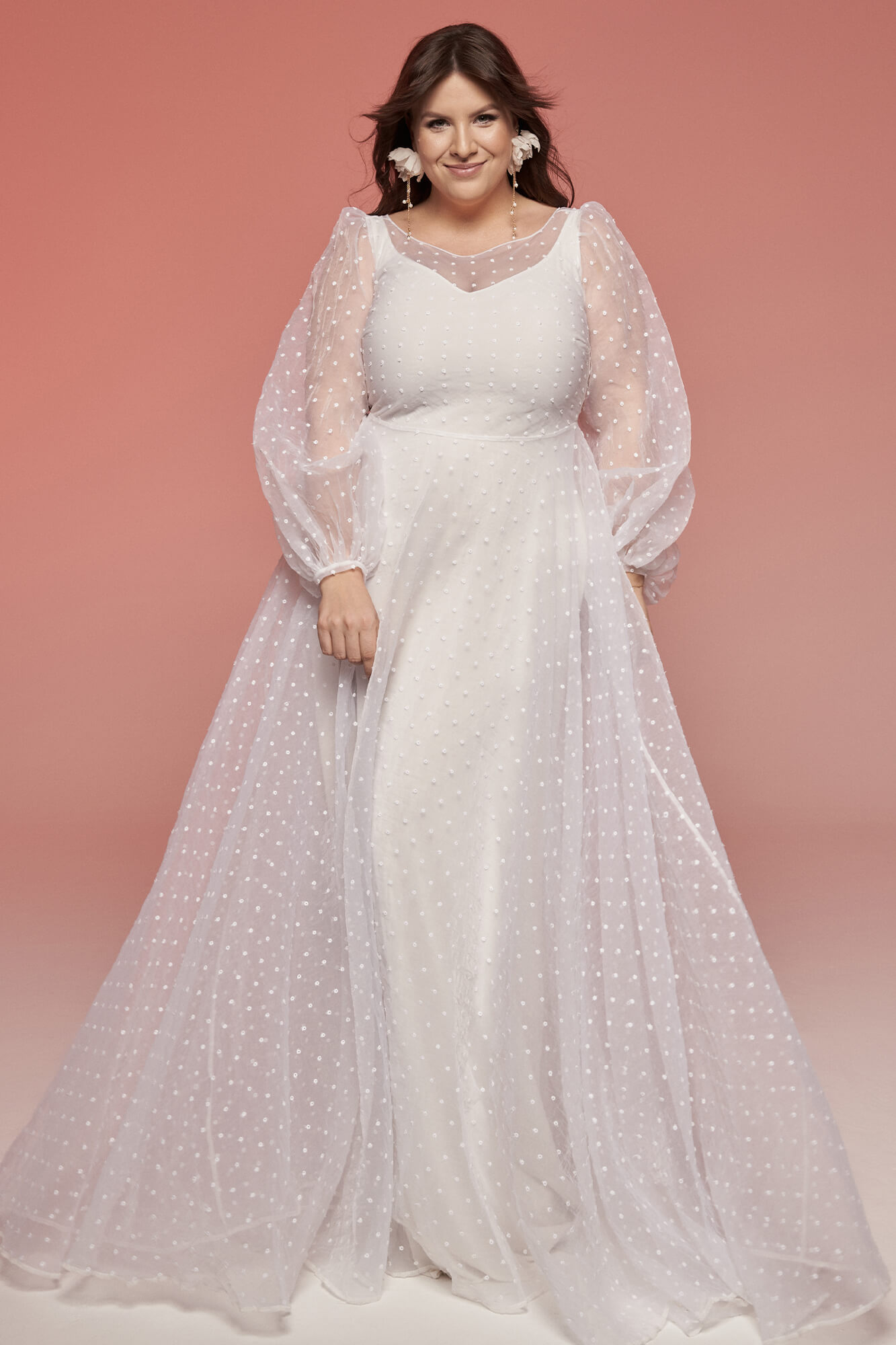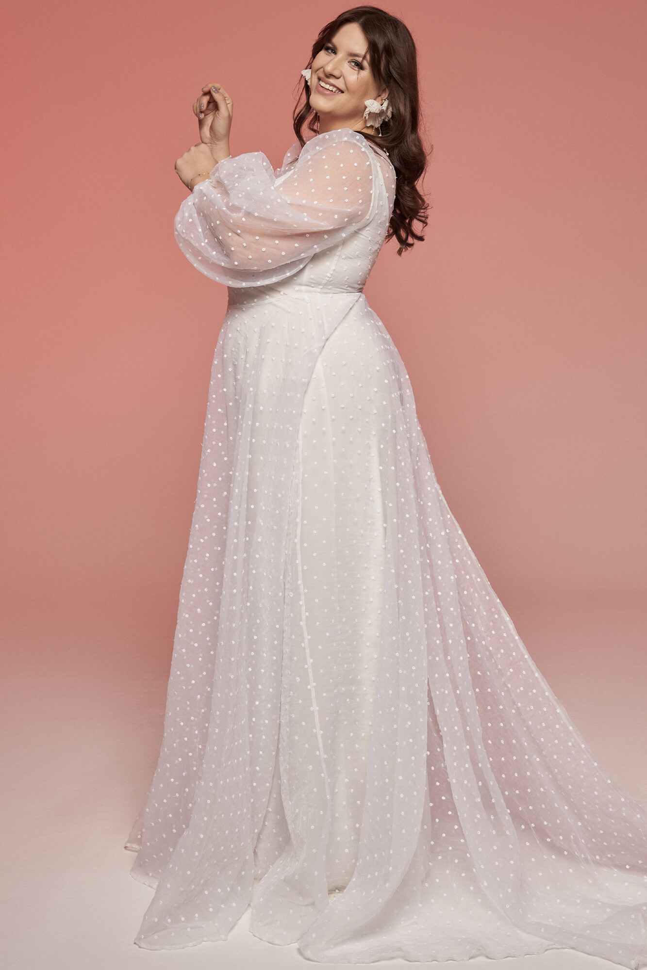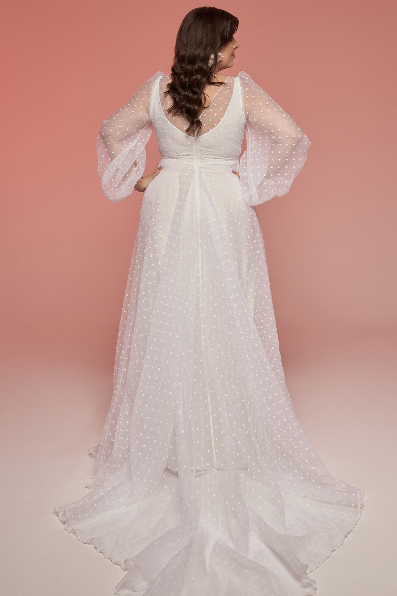 Jeżeli szukasz ślubnej kreacji, obok której nikt nie przejdzie obojętnie to sprawdź czy nie znalazłaś! Ta biała suknia ślubna w kropki to połączenie dziewczęcego uroku i seksapilu! Nie wyobrażasz sobie wystąpić w tym dniu w kolorze innym niż biały, ale to jedyny pożądany przez Ciebie element klasyki i chciałabyś znaleźć suknię piękną, a jednocześnie oryginalną? Ta kreacja przepięknie będzie prezentować się podczas ślubów w zimowe miesiące. Tylko wyobraź sobie ten wzór w połączeniu z płatkami śniegu w tle na ślubnej pamiątce! Wierzchnia warstwa z organzy jest mocno zabudowana, jednak dzięki mocniej wyciętej podszewce w dekolcie, zarówno z przodu jak i z tyłu oraz braku podszewki w rękawach, całość nie wygląda ciężko. Dekolt z tyłu eksponuje plecy oraz umożliwia założenia klasycznego biustonosza, co zapewni komfort podczas uroczystości. Charakterystycznym i przyciągającym wzrok elementem tej białej sukni ślubnej plus size kropki są bez wątpienia duże, luźne, bufiaste rękawy, które nadają iście bajkowego charakteru całej stylizacji. Niezwykle eleganckim akcentem jest tren – pamiętaj jednak, że nie będzie on najlepszym wyborem, jeżeli zamierzasz tańczyć do białego rana, ale spokojnie – pamiętaj, że w naszych sukniach możemy wszystko zmienić, więc możesz z niego zrezygnować. Dzięki spódnicy uszytej z całego koła, kreacja będzie prezentować się bajecznie podczas tańca! Seksowny rozporek w podszewce sprawia, że suknia nabiera lekkości i delikatności, a dodatkowo cała sylwetka wygląda smuklej.