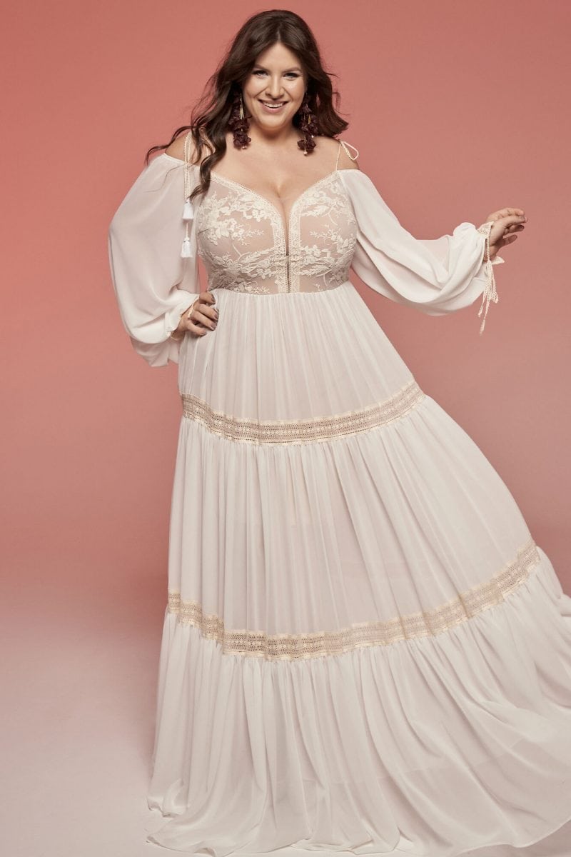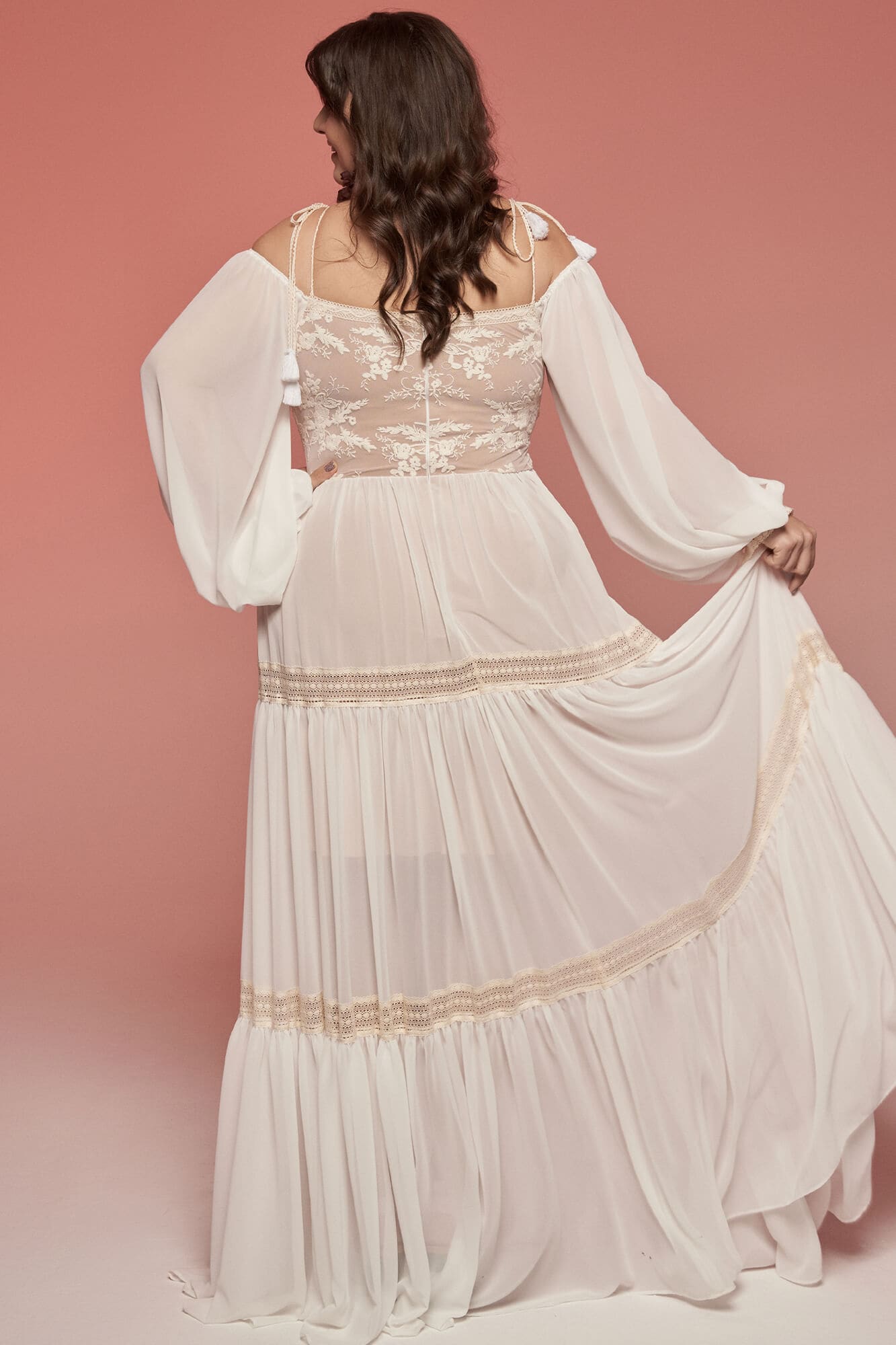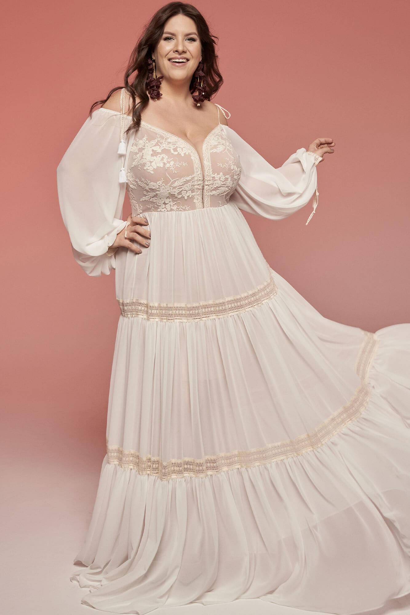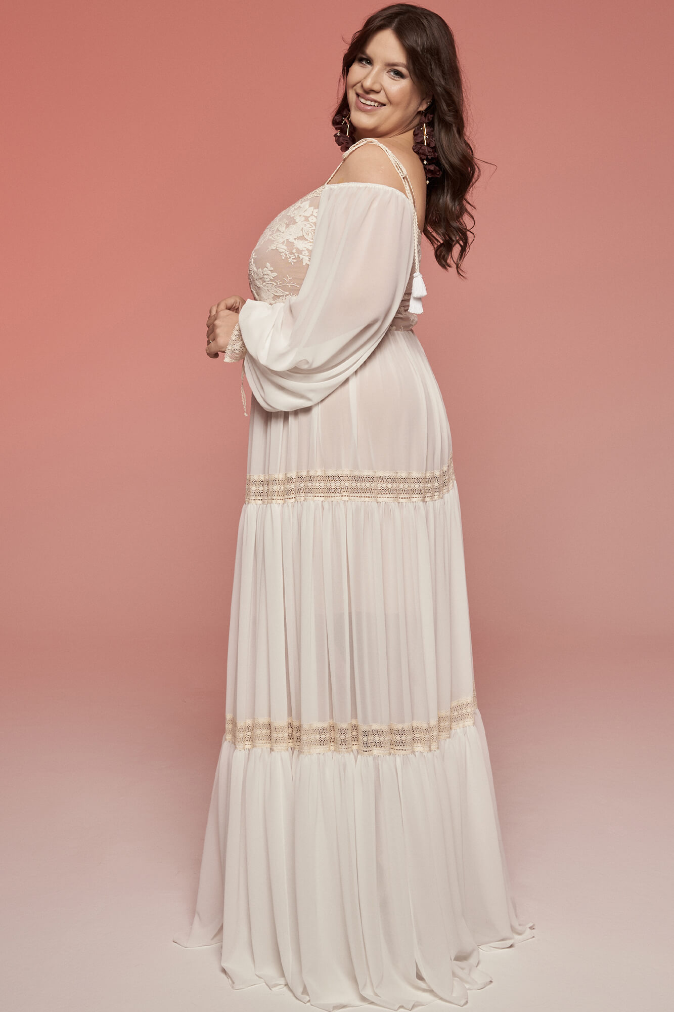 Uszyta z bawełnianej koronki i tiulu suknia ślubna w stylu boho z głębokim dekoltem, odkrytymi ramionami i długimi, luźnymi rękawami. Spódnica składa się z trzech pięter szyfonu połączonych koronkowymi taśmami. Jeśli jednak którykolwiek z tych elementów nie podoba Ci się lub nie służy Twojej sylwetce to możemy go zmienić! Podczas szycia miarowego tego modelu dla Ciebie możemy przerobić spódnicę na gładką, z rozcięciem na nogę lub bez niego, zabudować dekolt, zmienić rękaw tak, by osłonić ramiona czy zmienić kolor podszewki (we wzorze jest cielista).