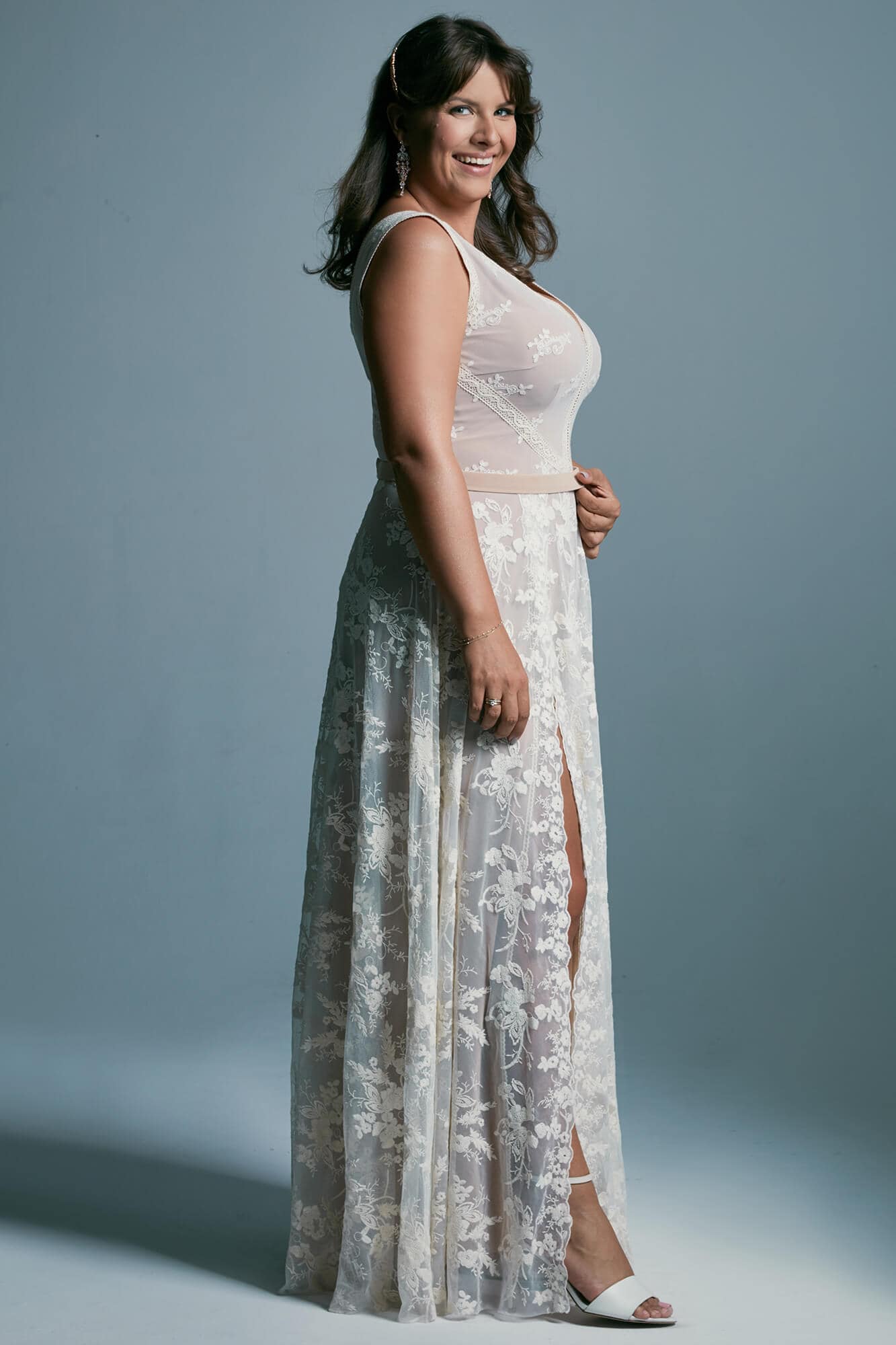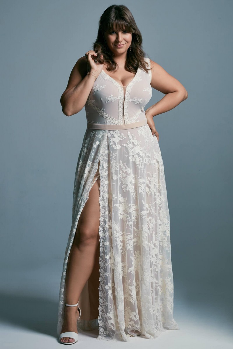 Romantyczna suknia ślubna plus size o klasycznym kroju to idealny model dla kobiet, które pragną podkreślić piękne walory swojego ciała. Beżowa kreacja to połączenie zjawiskowego fasonu z delikatną kwiatową fakturą koronki, która zachwyca swym oryginalnym i niezwykle subtelnym stylem. Dekolt sukni ślubnej plus size jest głęboko wycięty i obszyty kremową tasiemką zwężającą się i sięgającą do talii. Dzięki możliwości założenia stanika, biust jest pięknie podkreślony, a Panna Młoda ma zapewniony pełen komfort podczas poruszania się. Ta sama tasiemka zdobi też boki kreacji, która dzięki ukośnemu ułożeniu cudownie akcentuje linię piersi i wysmukla talię, pomagając przy tym ukryć drobne, ewentualne niedoskonałości. Dół projektu tworzy spódnica z niezwykle kobiecym i kokieteryjnym rozporkiem ukazującym nogę. Długie rozcięcie wydłuża całą sylwetkę zapewniając oryginalny wygląd sukni ślubnej plus size, która przepięknie prezentuje się w tańcu. Kreacja, dzięki miękkiej beżowej koronce oraz cielistej podszewce nie tylko świetnie podkreśla figurę, ale też rozświetla i ociepla karnację. Zwiewny szyk sukni nadający uroku i zmysłowego charakteru Pannie Młodej idealnie wpasuje się w każdą uroczystość – od mniejszych plenerowych imprez po wystawne i eleganckie gale.