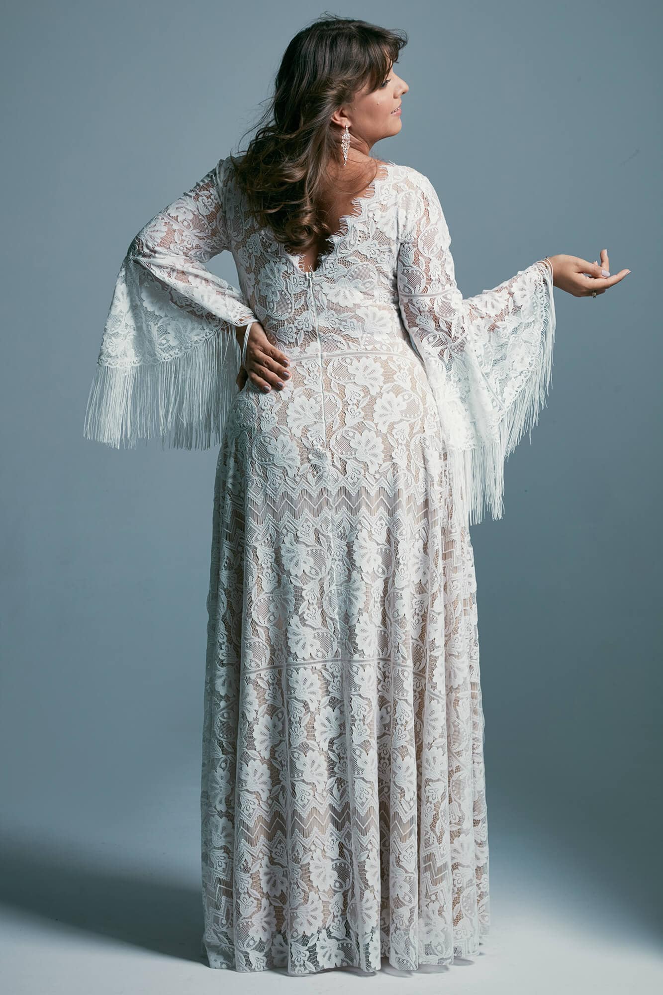 Ta suknia to model wyjściowy - możemy w niej zmienić praktycznie wszystko! Pogłębić lub spłycić dekolt, zmienić jego wykończenie, kształt, dodać lub odjąć falbankę czy frędzle. Rękawy mogą być dłuższe lub krótsze, mieć inny kształt niż te na zdjęciu. Może też nie być ich wcale. Tiul w spódnicy można dodać (lub odjąć) na wierzchu, albo pod spodem. Podszewka może być długa lub krótka w odcieniach bieli i beżu. Rozcięcie na nogę i tren można dodać lub usunąć praktycznie w każdym modelu.