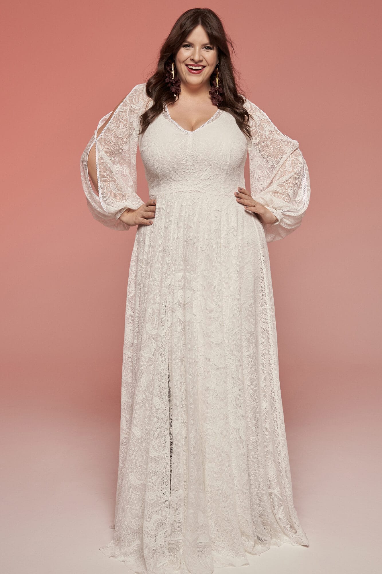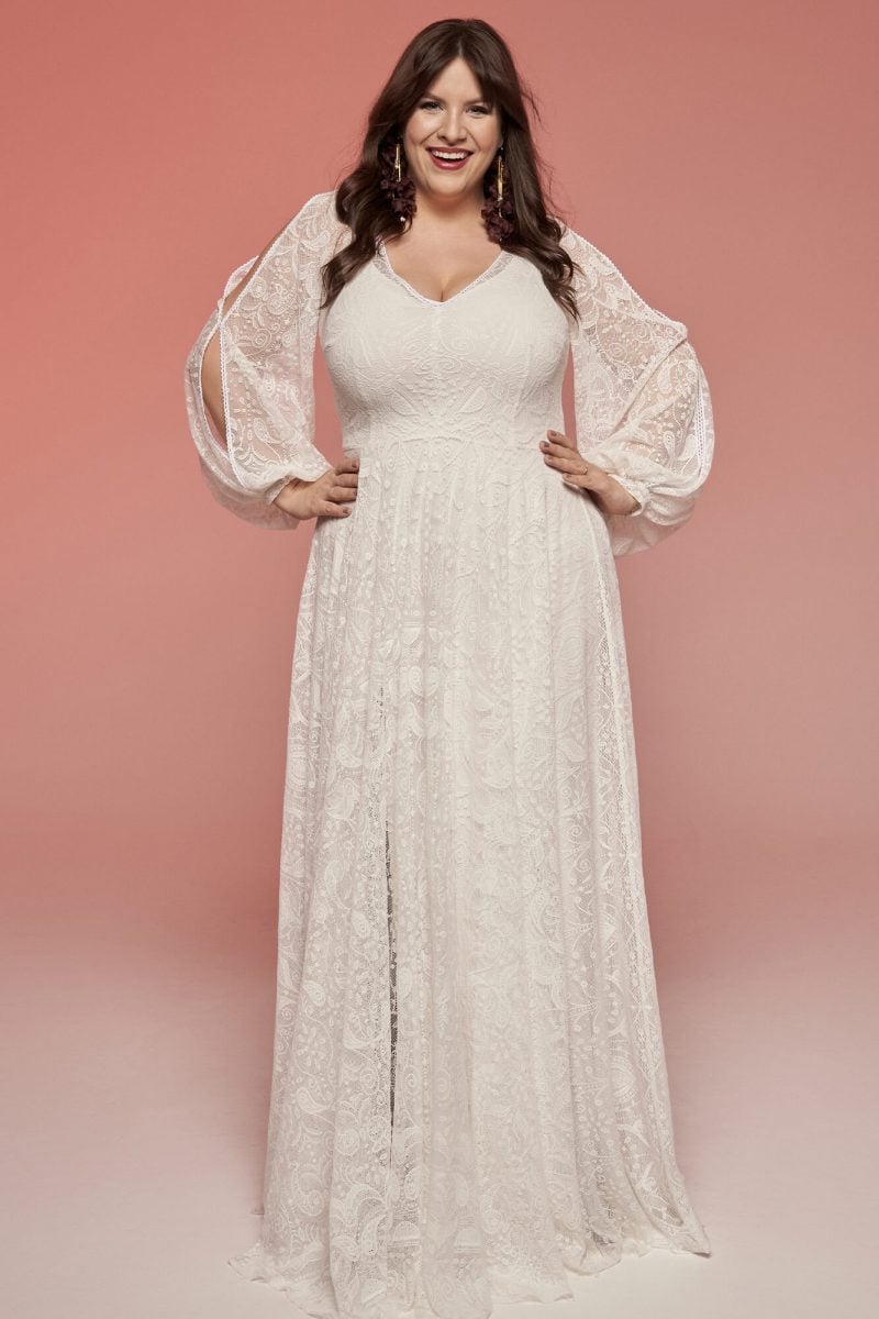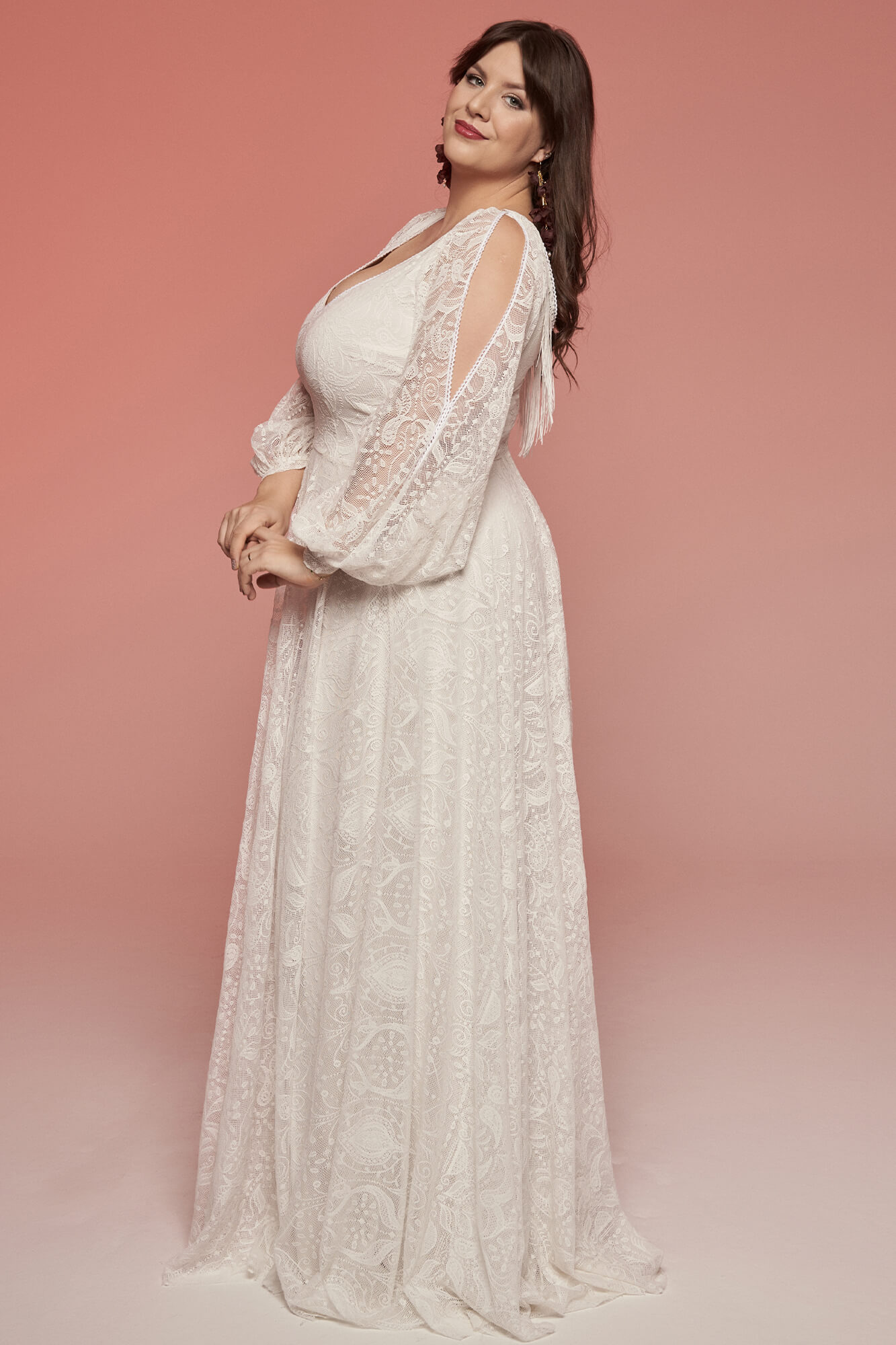 Ta suknia to model wyjściowy - możemy w niej zmienić praktycznie wszystko! Pogłębić lub spłycić dekolt, zmienić jego wykończenie, kształt, dodać lub odjąć falbankę czy frędzle. Rękawy mogą być dłuższe lub krótsze, mieć inny kształt niż te na zdjęciu. Może też nie być ich wcale. Tiul w spódnicy można dodać (lub odjąć) na wierzchu, albo pod spodem. Podszewka może być długa lub krótka w odcieniach bieli i beżu. Rozcięcie na nogę i tren można dodać lub usunąć praktycznie w każdym modelu.