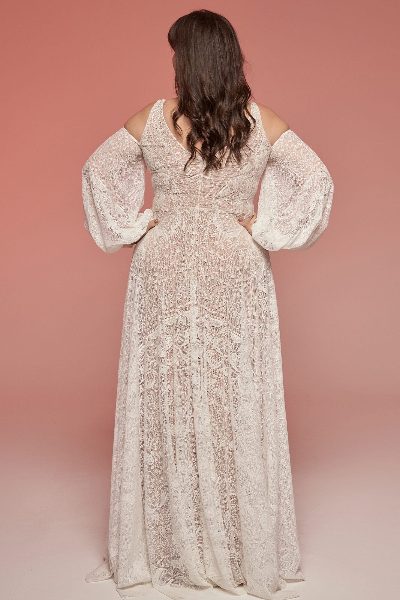 Ta suknia to model wyjściowy - możemy w niej zmienić praktycznie wszystko! Pogłębić lub spłycić dekolt, zmienić jego wykończenie, kształt, dodać lub odjąć falbankę czy frędzle. Rękawy mogą być dłuższe lub krótsze, mieć inny kształt niż te na zdjęciu. Może też nie być ich wcale. Tiul w spódnicy można dodać (lub odjąć) na wierzchu, albo pod spodem. Podszewka może być długa lub krótka w odcieniach bieli i beżu. Rozcięcie na nogę i tren można dodać lub usunąć praktycznie w każdym modelu.