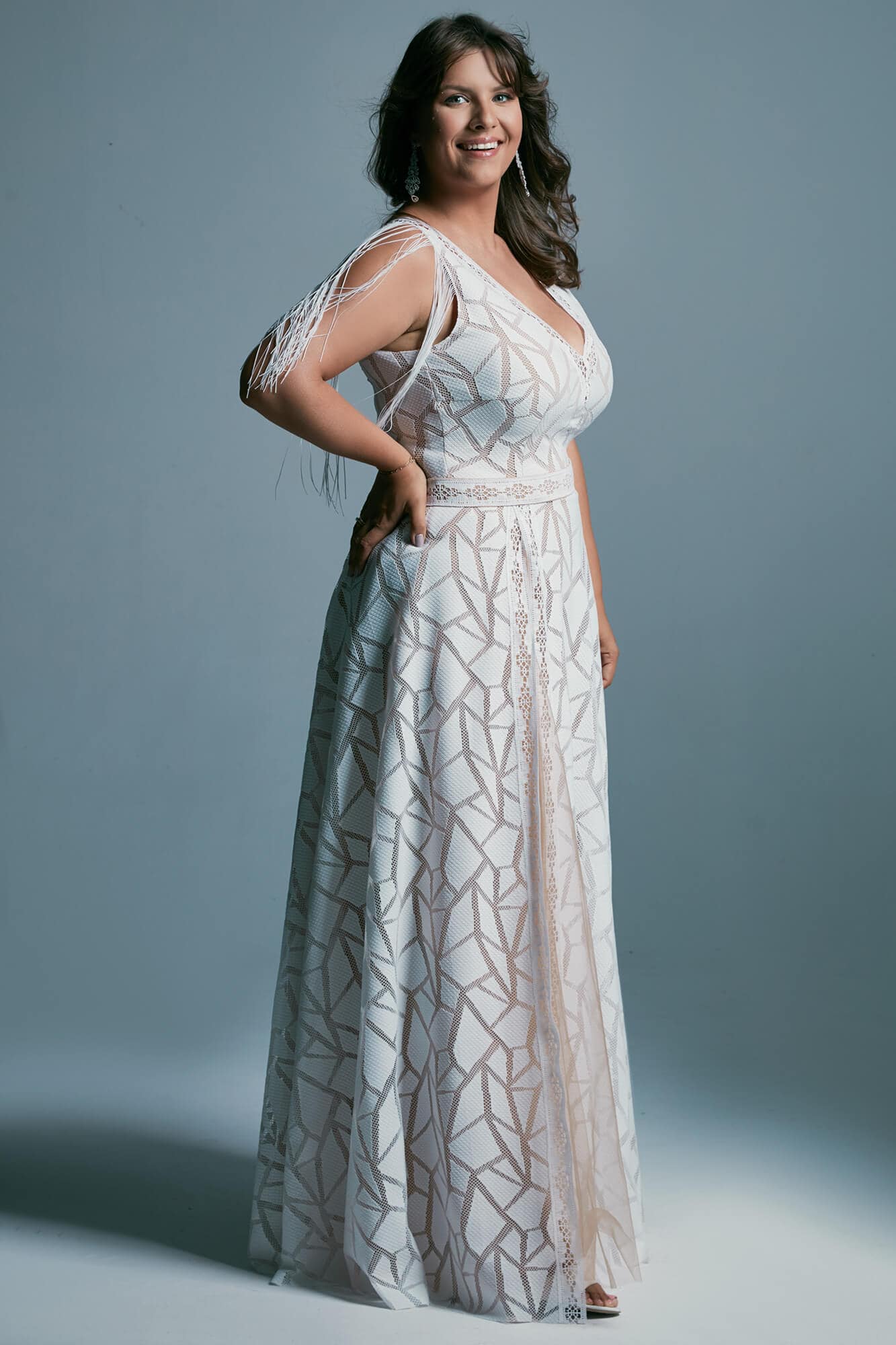 Ta suknia to model wyjściowy - możemy w niej zmienić praktycznie wszystko! Pogłębić lub spłycić dekolt, zmienić jego wykończenie, kształt, dodać lub odjąć falbankę czy frędzle. Rękawy mogą być dłuższe lub krótsze, mieć inny kształt niż te na zdjęciu. Może też nie być ich wcale. Tiul w spódnicy można dodać (lub odjąć) na wierzchu, albo pod spodem. Podszewka może być długa lub krótka w odcieniach bieli i beżu. Rozcięcie na nogę i tren można dodać lub usunąć praktycznie w każdym modelu.