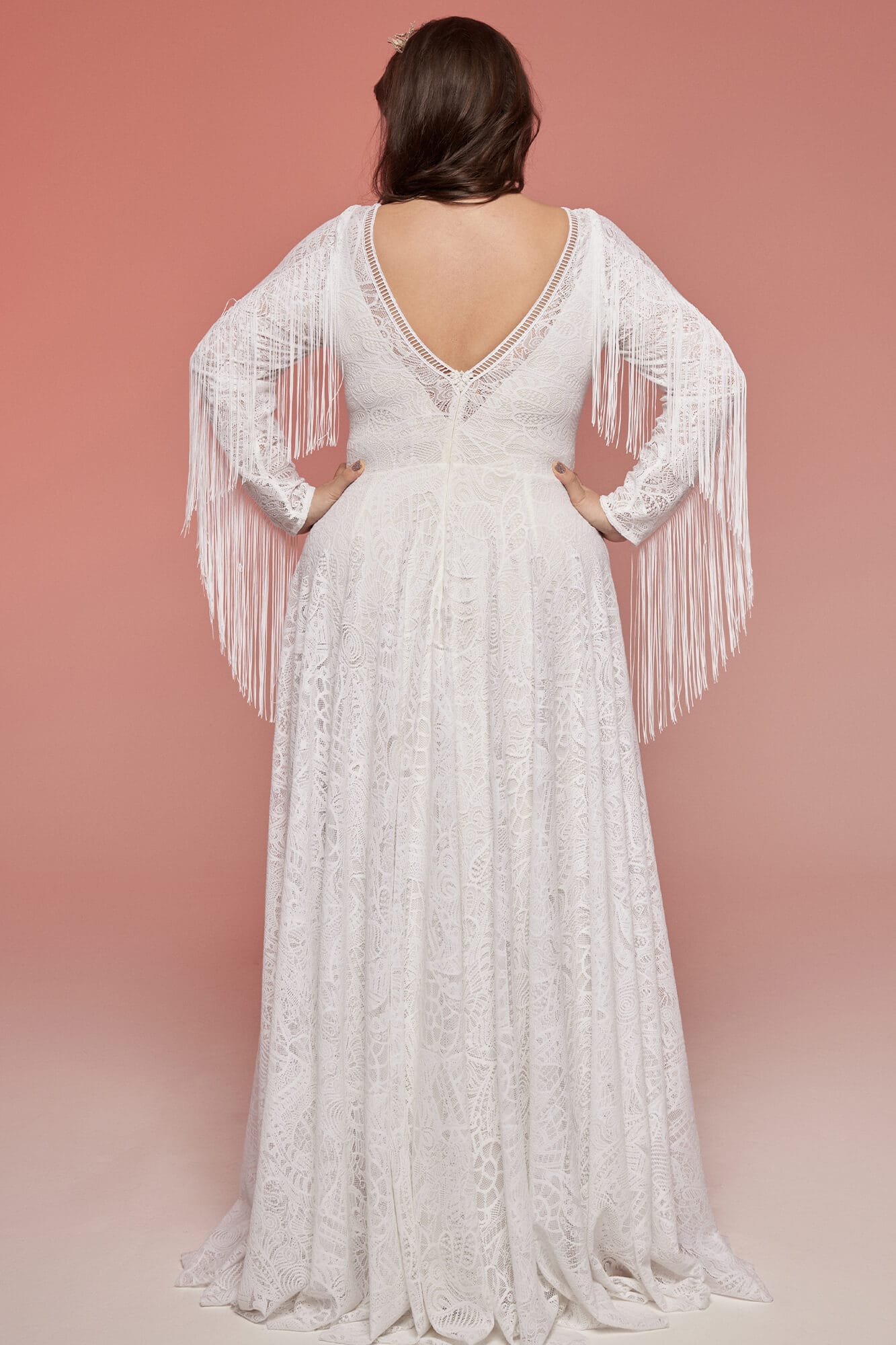 Ta suknia to model wyjściowy - możemy w niej zmienić praktycznie wszystko! Pogłębić lub spłycić dekolt, zmienić jego wykończenie, kształt, dodać lub odjąć falbankę czy frędzle. Rękawy mogą być dłuższe lub krótsze, mieć inny kształt niż te na zdjęciu. Może też nie być ich wcale. Tiul w spódnicy można dodać (lub odjąć) na wierzchu, albo pod spodem. Podszewka może być długa lub krótka w odcieniach bieli i beżu. Rozcięcie na nogę i tren można dodać lub usunąć praktycznie w każdym modelu.