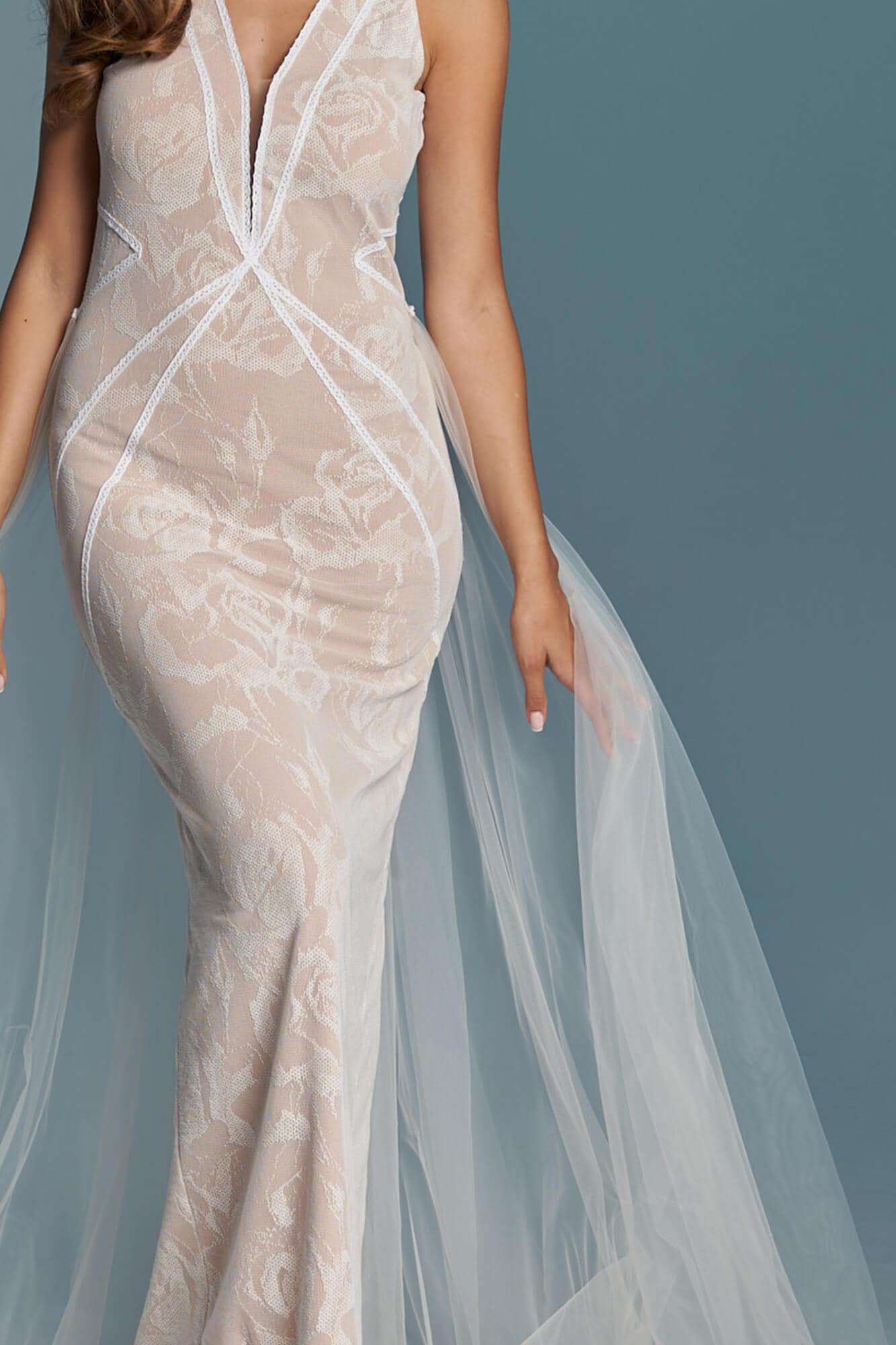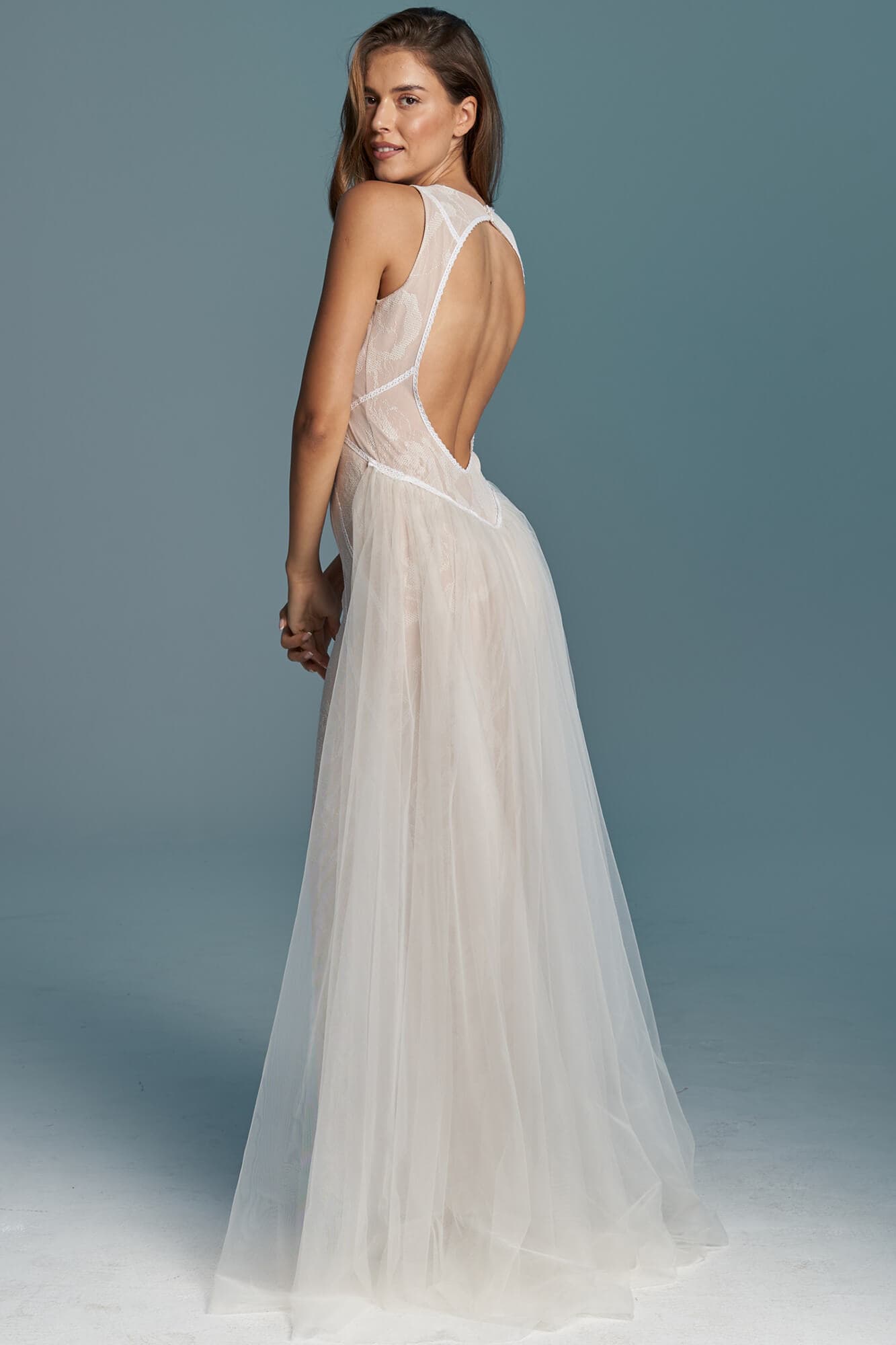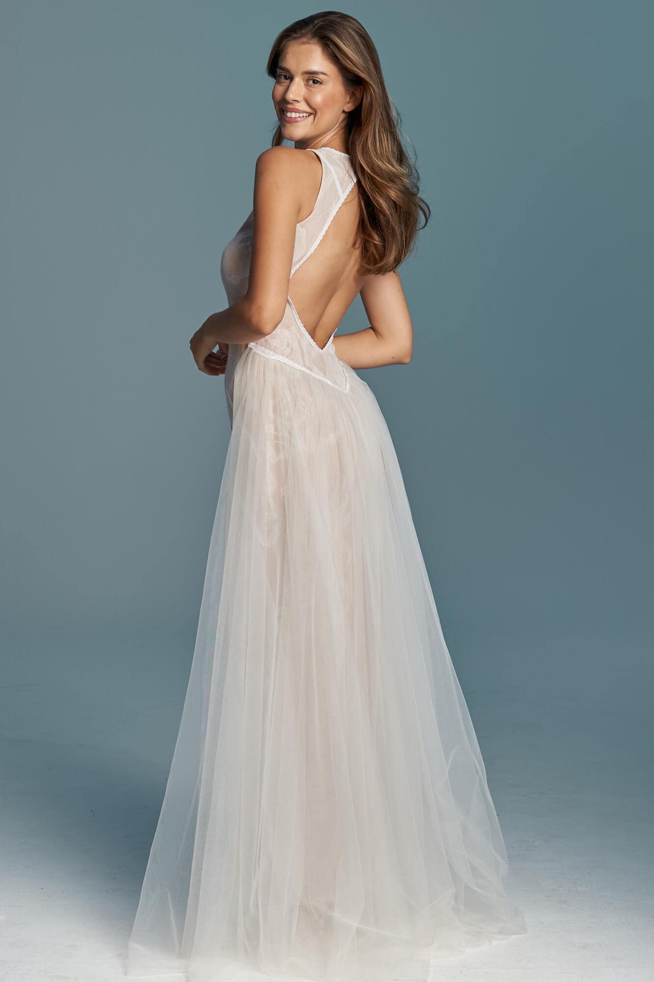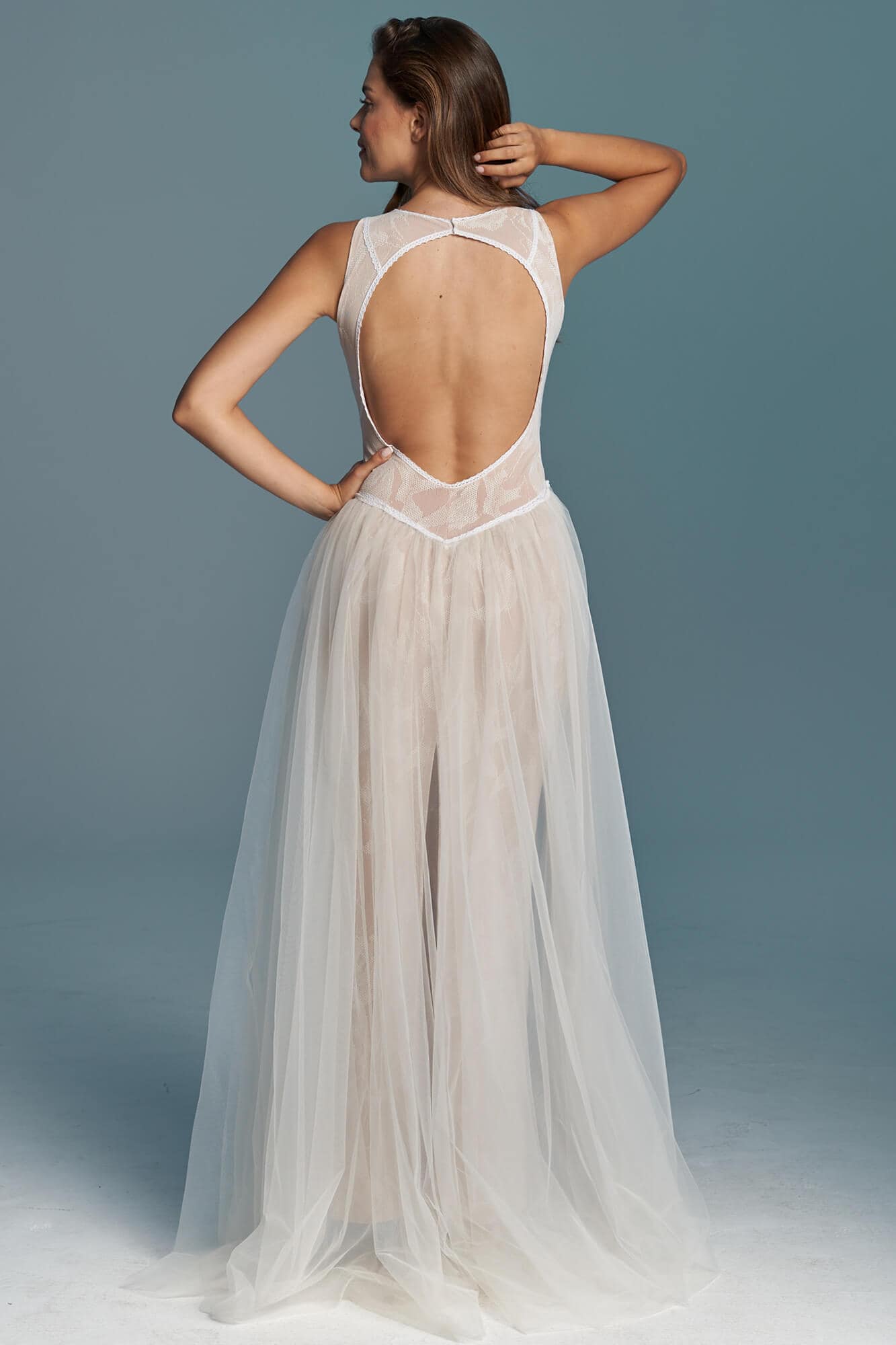 Ta suknia to model wyjściowy - możemy w niej zmienić praktycznie wszystko! Pogłębić lub spłycić dekolt, zmienić jego wykończenie, kształt, dodać lub odjąć falbankę czy frędzle. Rękawy mogą być dłuższe lub krótsze, mieć inny kształt niż te na zdjęciu. Może też nie być ich wcale. Tiul w spódnicy można dodać (lub odjąć) na wierzchu, albo pod spodem. Podszewka może być długa lub krótka w odcieniach bieli i beżu. Rozcięcie na nogę i tren można dodać lub usunąć praktycznie w każdym modelu.