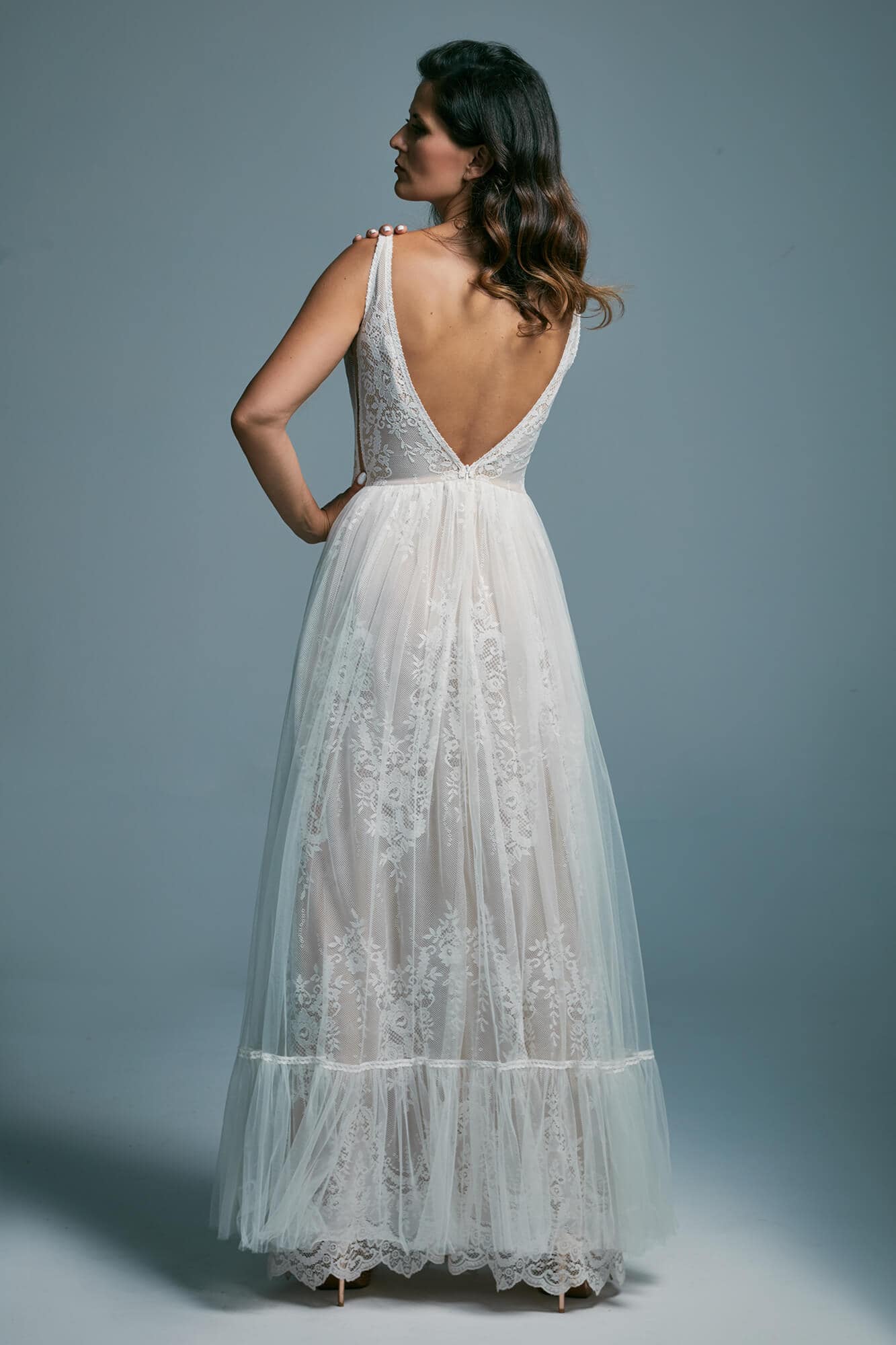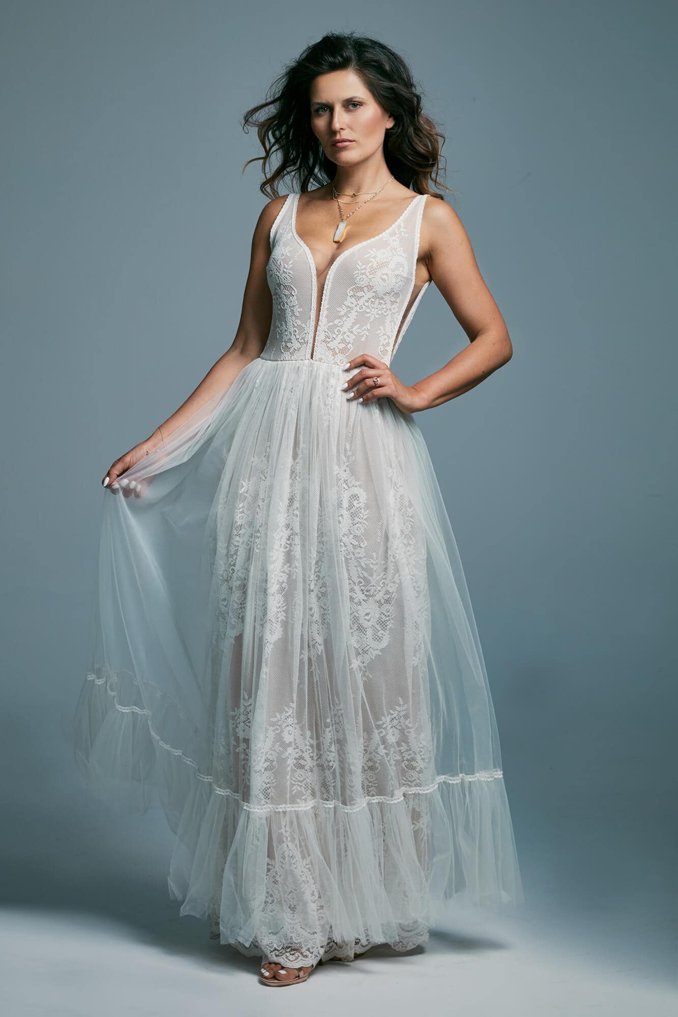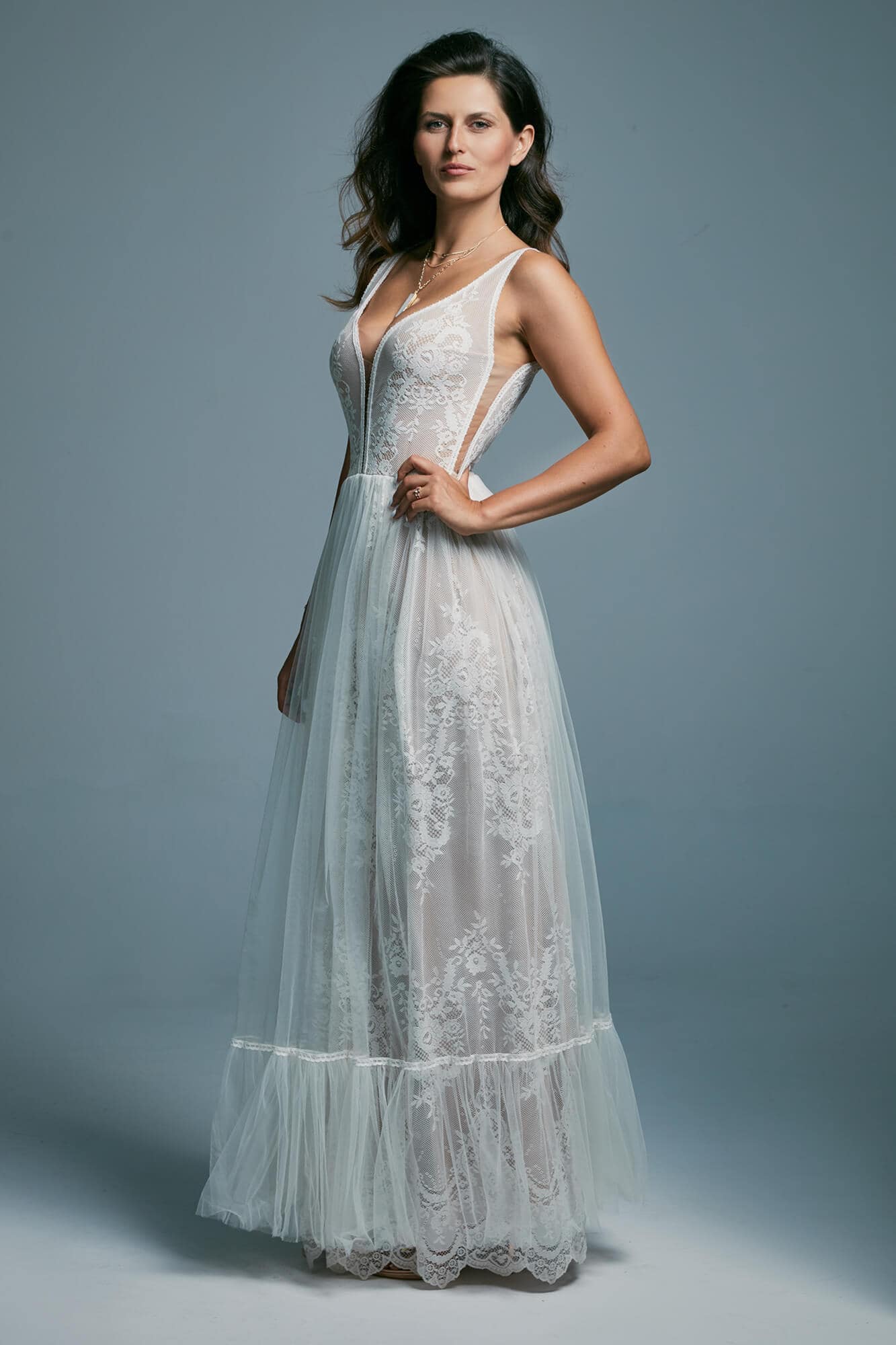 Uszyta ze sprawdzonych i przetestowanych przez nas materiałów. Używane przez nas koronki są mięciutkie, a dzięki swej lekkości cudownie układają się na sylwetce i pięknie wirują w tańcu. Ich elastyczność sprawia, że pracują z Twoim ciałem. Zapewniają komfort rosnącemu ciążowemu brzuszkowi. Praktycznie wszystkie nasze koronki są łatwe do prania w domowej pralce i niegniotące, dzięki czemu swoją suknię spokojnie możesz spakować do walizki i zabrać na romantyczną sesję poślubną.