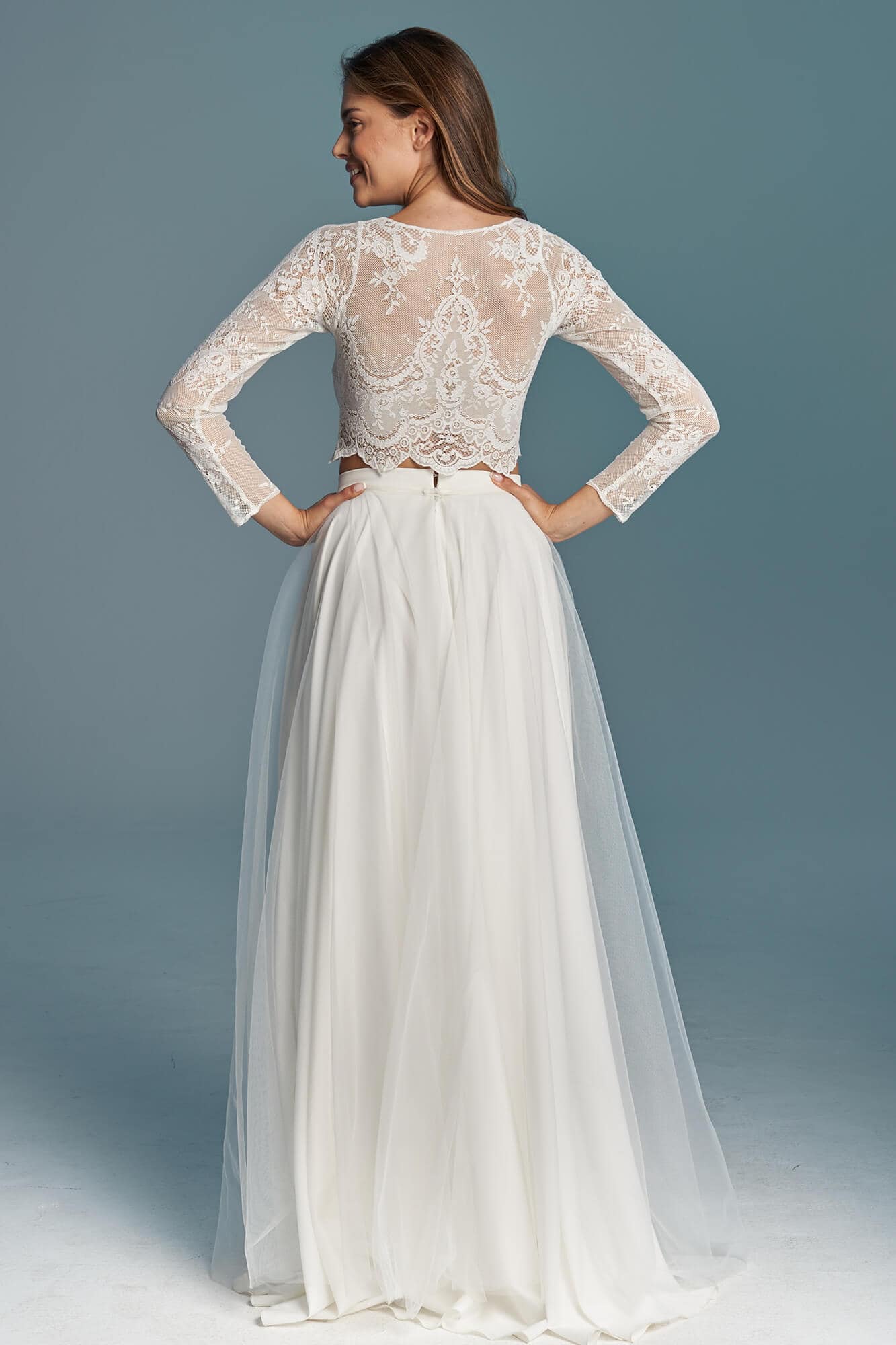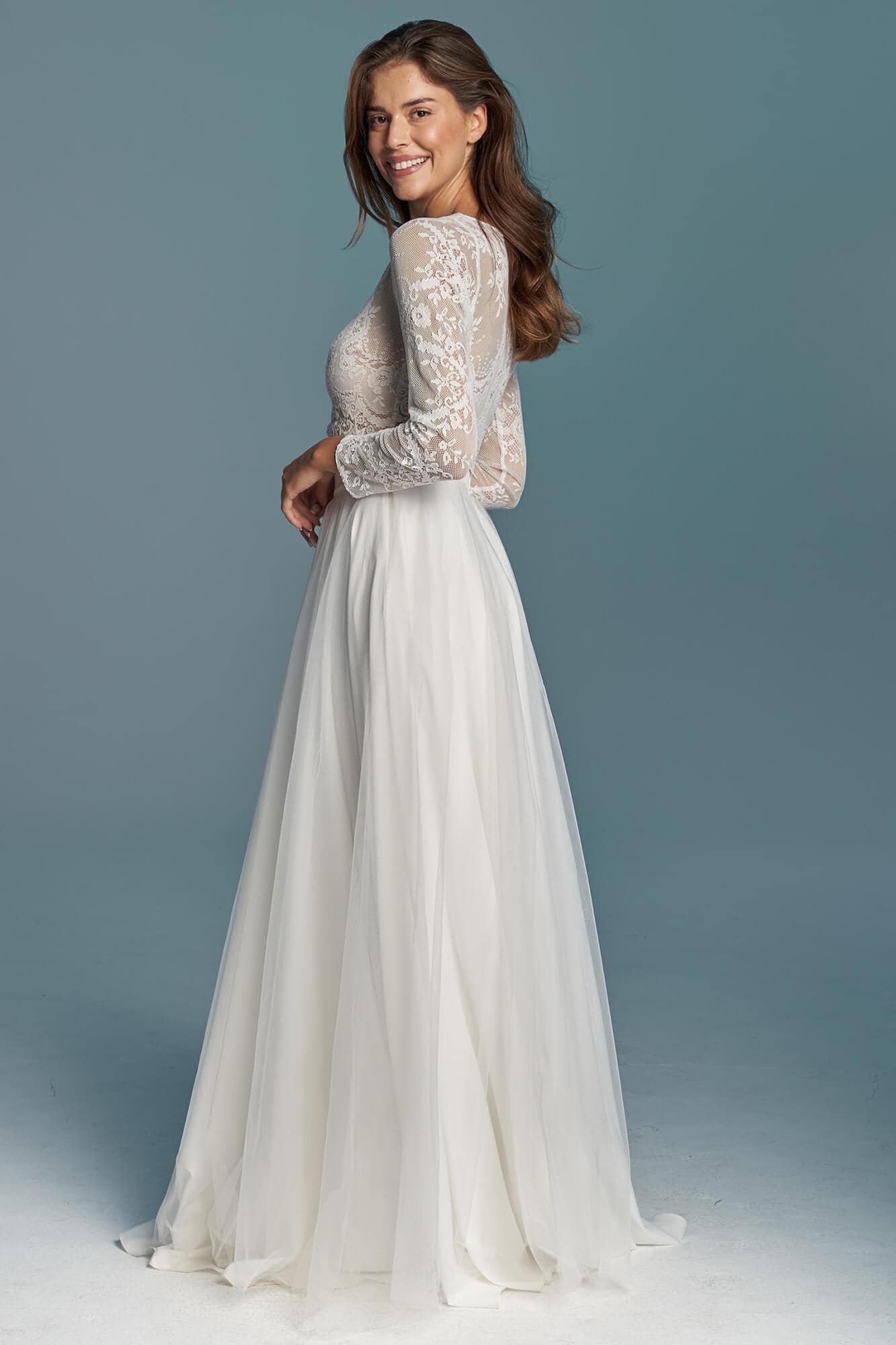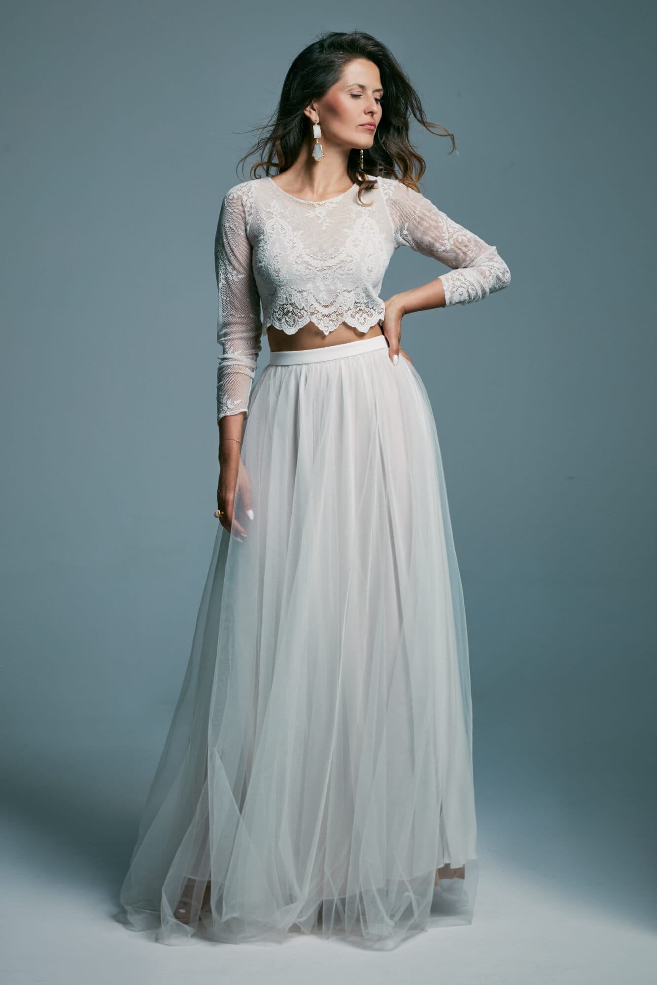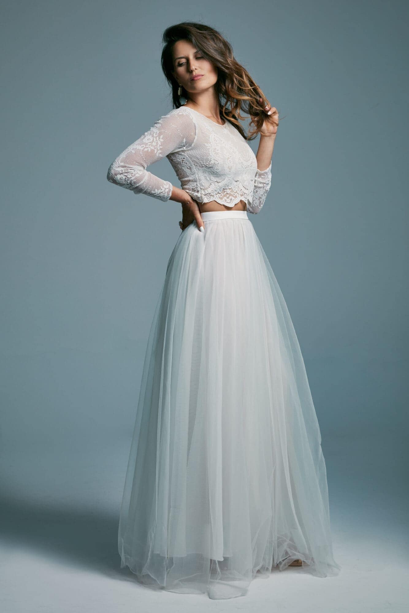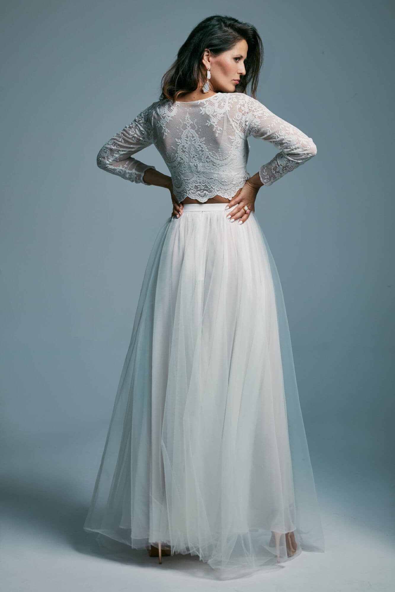 Ta suknia to model wyjściowy - możemy w niej zmienić praktycznie wszystko! Pogłębić lub spłycić dekolt, zmienić jego wykończenie, kształt, dodać lub odjąć falbankę czy frędzle. Rękawy mogą być dłuższe lub krótsze, mieć inny kształt niż te na zdjęciu. Może też nie być ich wcale. Tiul w spódnicy można dodać (lub odjąć) na wierzchu, albo pod spodem. Podszewka może być długa lub krótka w odcieniach bieli i beżu. Rozcięcie na nogę i tren można dodać lub usunąć praktycznie w każdym modelu.
