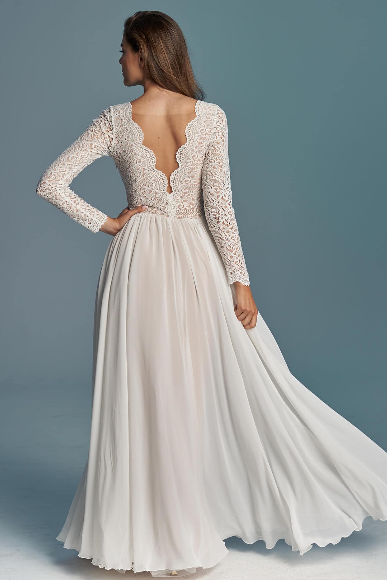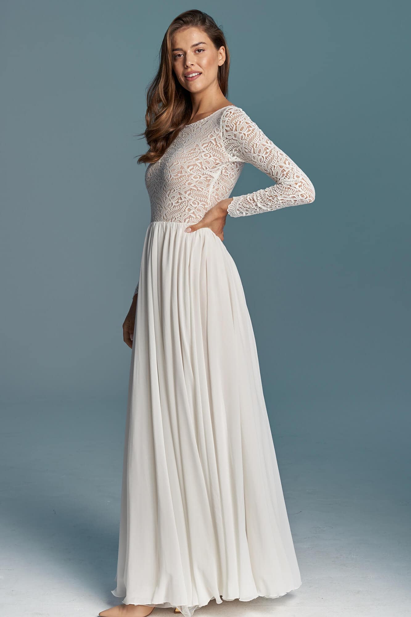 Ta suknia to model wyjściowy - możemy w niej zmienić praktycznie wszystko! Pogłębić lub spłycić dekolt, zmienić jego wykończenie, kształt, dodać lub odjąć falbankę czy frędzle. Rękawy mogą być dłuższe lub krótsze, mieć inny kształt niż te na zdjęciu. Może też nie być ich wcale. Tiul w spódnicy można dodać (lub odjąć) na wierzchu, albo pod spodem. Podszewka może być długa lub krótka w odcieniach bieli i beżu. Rozcięcie na nogę i tren można dodać lub usunąć praktycznie w każdym modelu.
