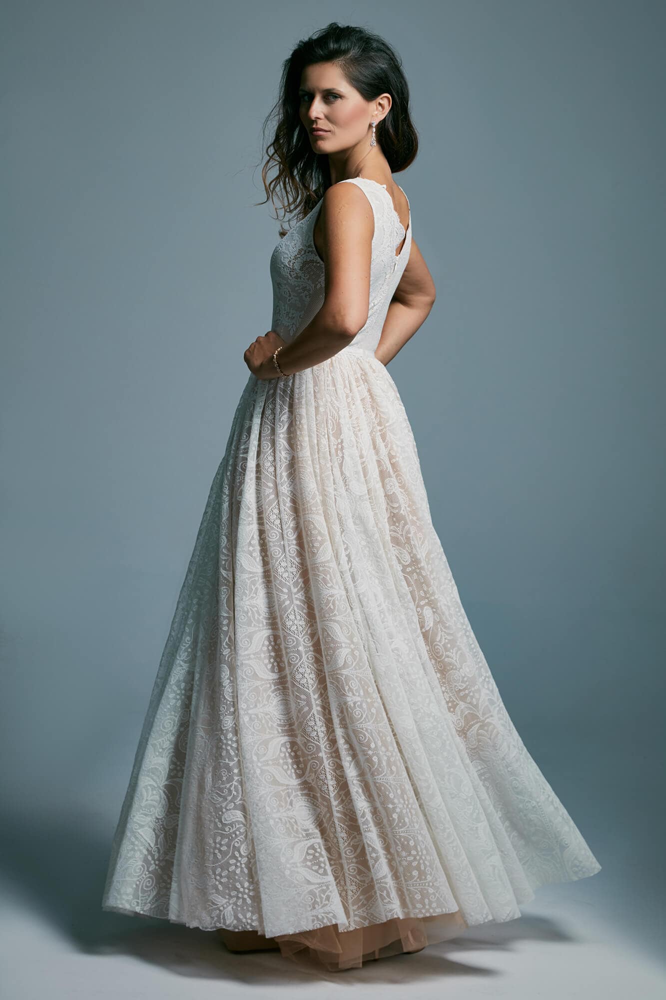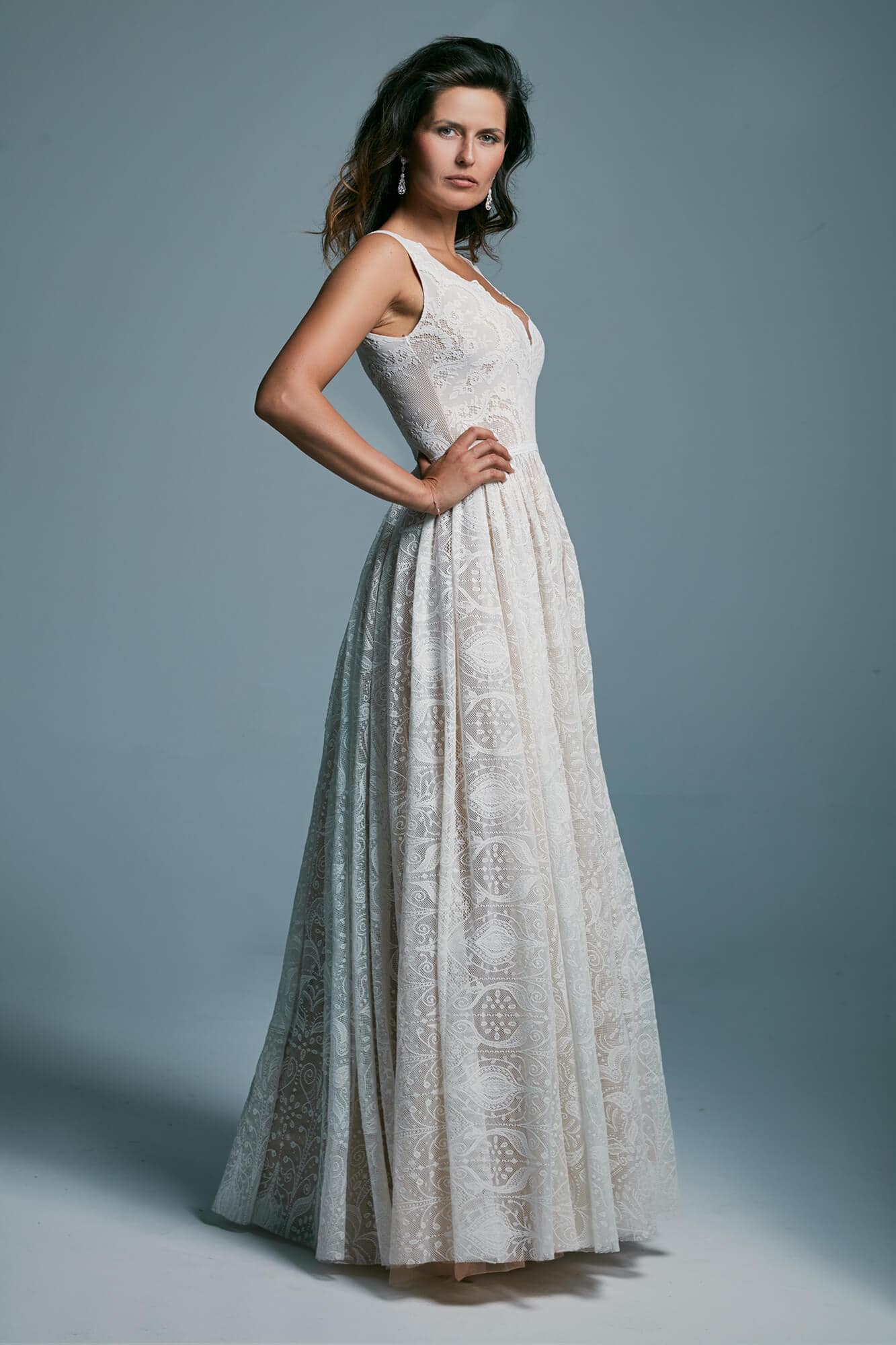 Ta suknia to model wyjściowy - możemy w niej zmienić praktycznie wszystko! Pogłębić lub spłycić dekolt, zmienić jego wykończenie, kształt, dodać lub odjąć falbankę czy frędzle. Rękawy mogą być dłuższe lub krótsze, mieć inny kształt niż te na zdjęciu. Może też nie być ich wcale. Tiul w spódnicy można dodać (lub odjąć) na wierzchu, albo pod spodem. Podszewka może być długa lub krótka w odcieniach bieli i beżu. Rozcięcie na nogę i tren można dodać lub usunąć praktycznie w każdym modelu.