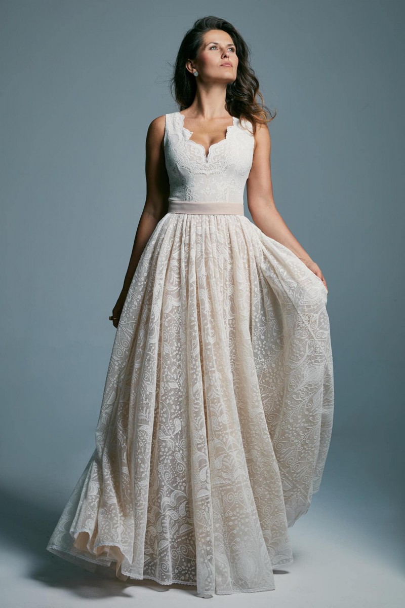 Ta suknia to model wyjściowy - możemy w niej zmienić praktycznie wszystko! Pogłębić lub spłycić dekolt, zmienić jego wykończenie, kształt, dodać lub odjąć falbankę czy frędzle. Rękawy mogą być dłuższe lub krótsze, mieć inny kształt niż te na zdjęciu. Może też nie być ich wcale. Tiul w spódnicy można dodać (lub odjąć) na wierzchu, albo pod spodem. Podszewka może być długa lub krótka w odcieniach bieli i beżu. Rozcięcie na nogę i tren można dodać lub usunąć praktycznie w każdym modelu.