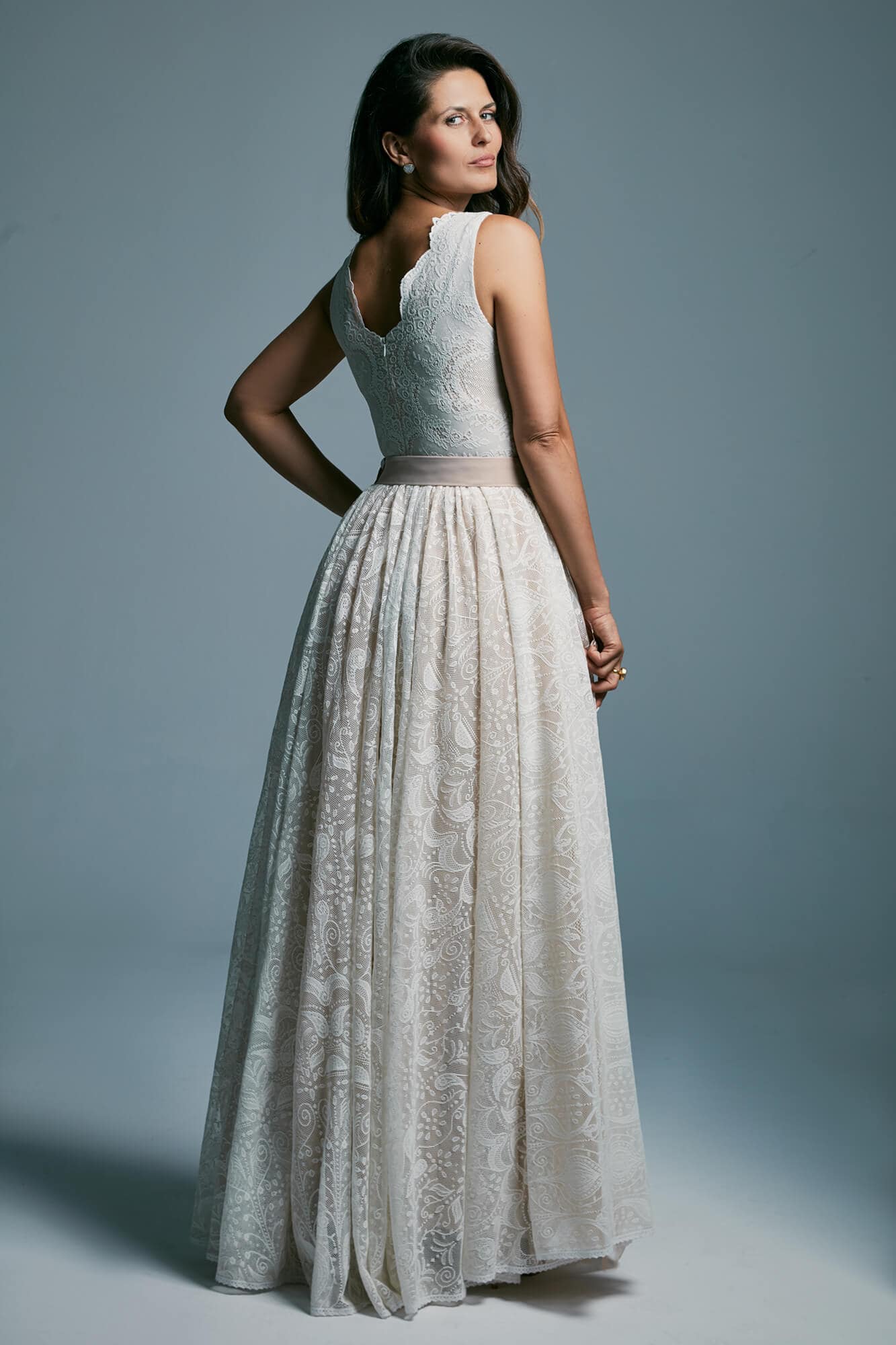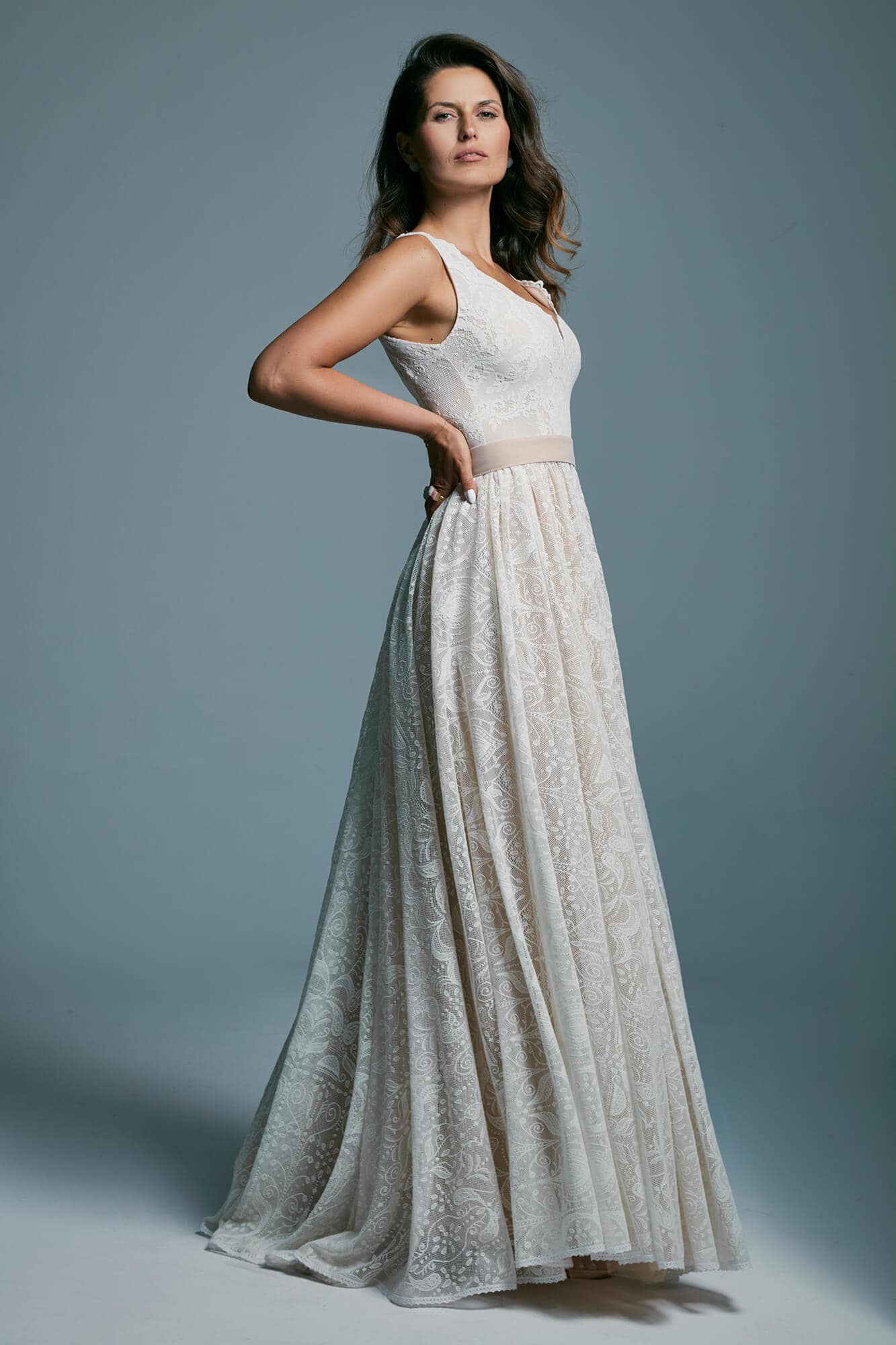 Uszyta ze sprawdzonych i przetestowanych przez nas materiałów. Używane przez nas koronki są mięciutkie, a dzięki swej lekkości cudownie układają się na sylwetce i pięknie wirują w tańcu. Ich elastyczność sprawia, że pracują z Twoim ciałem. Zapewniają komfort rosnącemu ciążowemu brzuszkowi. Praktycznie wszystkie nasze koronki są łatwe do prania w domowej pralce i niegniotące, dzięki czemu swoją suknię spokojnie możesz spakować do walizki i zabrać na romantyczną sesję poślubną.