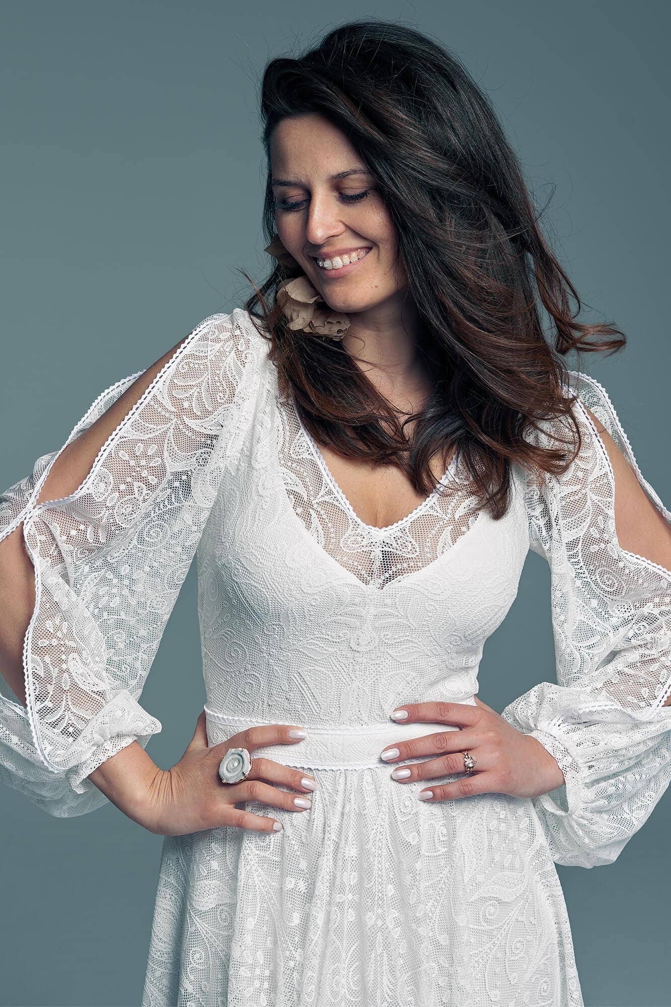 Uszyta ze sprawdzonych i przetestowanych przez nas materiałów. Używane przez nas koronki są mięciutkie, a dzięki swej lekkości cudownie układają się na sylwetce i pięknie wirują w tańcu. Ich elastyczność sprawia, że pracują z Twoim ciałem. Zapewniają komfort rosnącemu ciążowemu brzuszkowi. Praktycznie wszystkie nasze koronki są łatwe do prania w domowej pralce i niegniotące, dzięki czemu swoją suknię spokojnie możesz spakować do walizki i zabrać na romantyczną sesję poślubną.