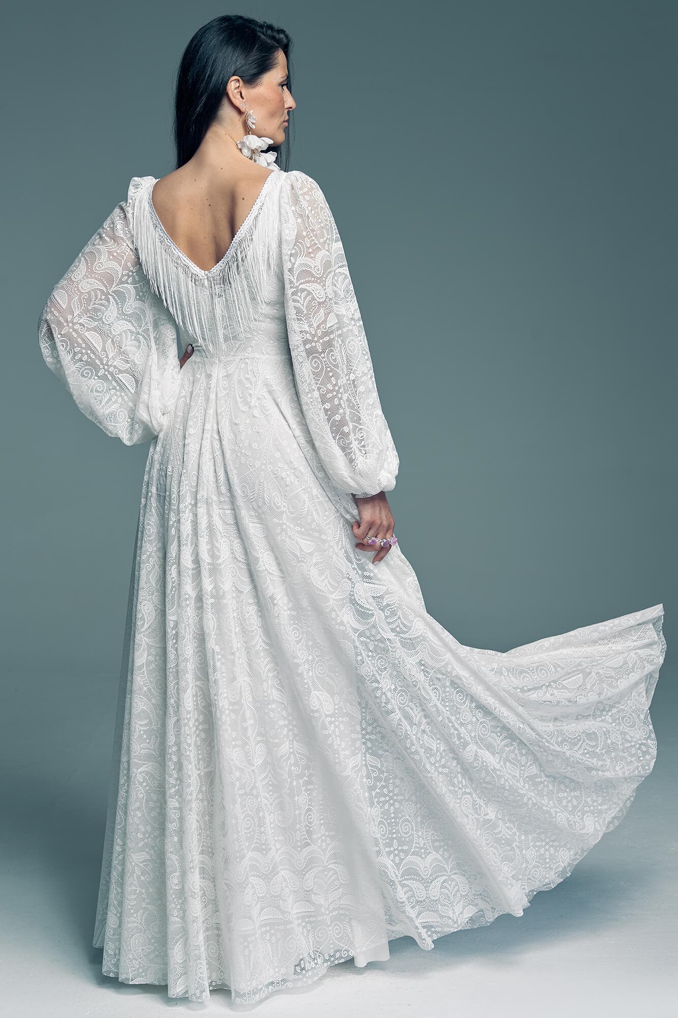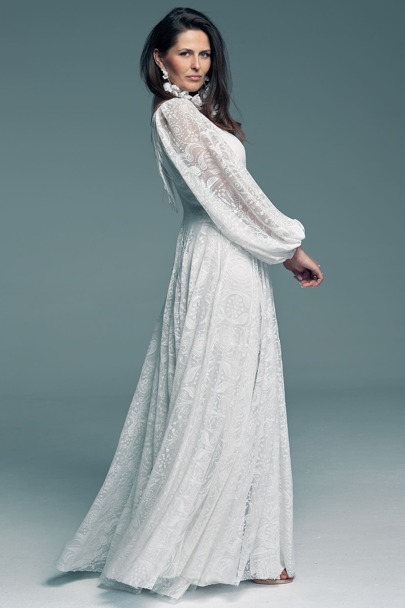 Ta suknia to model wyjściowy - możemy w niej zmienić praktycznie wszystko! Pogłębić lub spłycić dekolt, zmienić jego wykończenie, kształt, dodać lub odjąć falbankę czy frędzle. Rękawy mogą być dłuższe lub krótsze, mieć inny kształt niż te na zdjęciu. Może też nie być ich wcale. Tiul w spódnicy można dodać (lub odjąć) na wierzchu, albo pod spodem. Podszewka może być długa lub krótka w odcieniach bieli i beżu. Rozcięcie na nogę i tren można dodać lub usunąć praktycznie w każdym modelu.