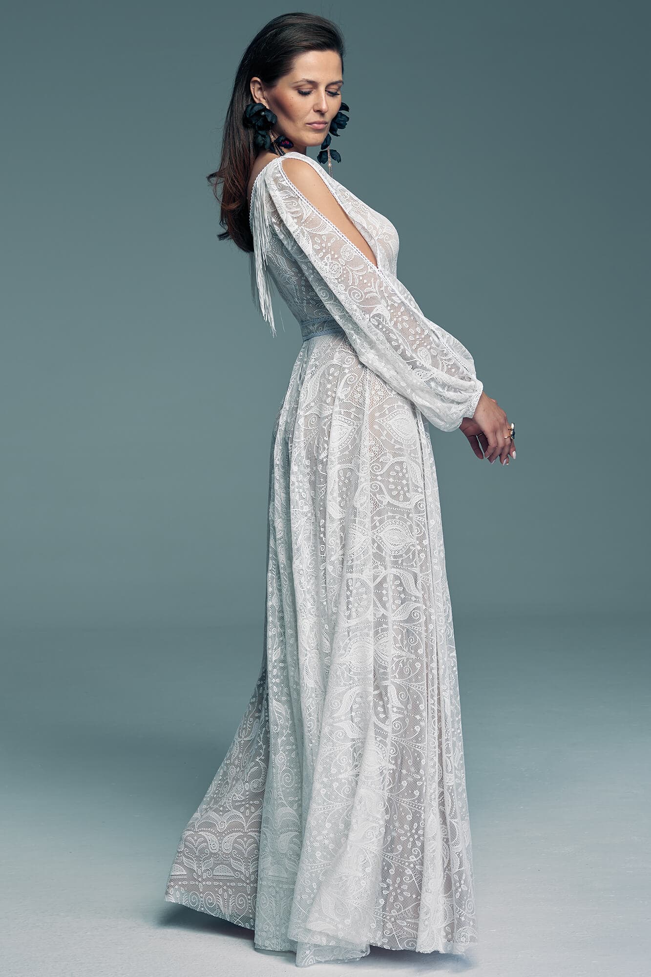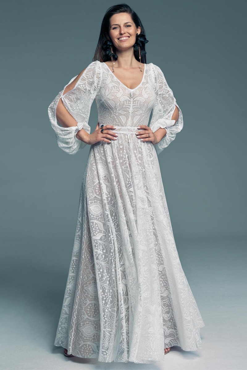 Ta suknia to model wyjściowy - możemy w niej zmienić praktycznie wszystko! Pogłębić lub spłycić dekolt, zmienić jego wykończenie, kształt, dodać lub odjąć falbankę czy frędzle. Rękawy mogą być dłuższe lub krótsze, mieć inny kształt niż te na zdjęciu. Może też nie być ich wcale. Tiul w spódnicy można dodać (lub odjąć) na wierzchu, albo pod spodem. Podszewka może być długa lub krótka w odcieniach bieli i beżu. Rozcięcie na nogę i tren można dodać lub usunąć praktycznie w każdym modelu.