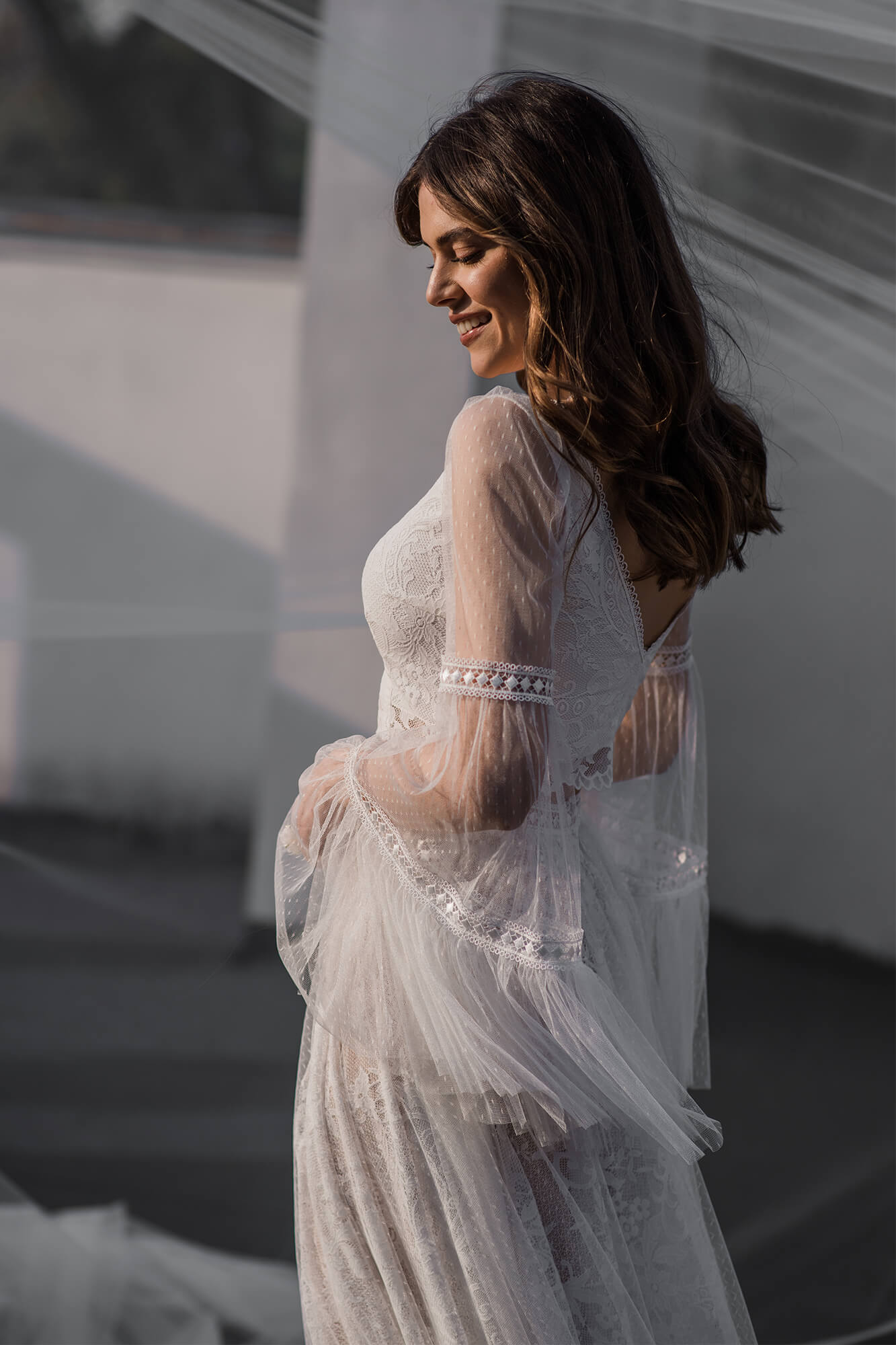 Uszyta ze sprawdzonych i przetestowanych przez nas materiałów. Używane przez nas koronki są mięciutkie, a dzięki swej lekkości cudownie układają się na sylwetce i pięknie wirują w tańcu. Ich elastyczność sprawia, że pracują z Twoim ciałem. Zapewniają komfort rosnącemu ciążowemu brzuszkowi. Praktycznie wszystkie nasze koronki są łatwe do prania w domowej pralce i niegniotące, dzięki czemu swoją suknię spokojnie możesz spakować do walizki i zabrać na romantyczną sesję poślubną.
