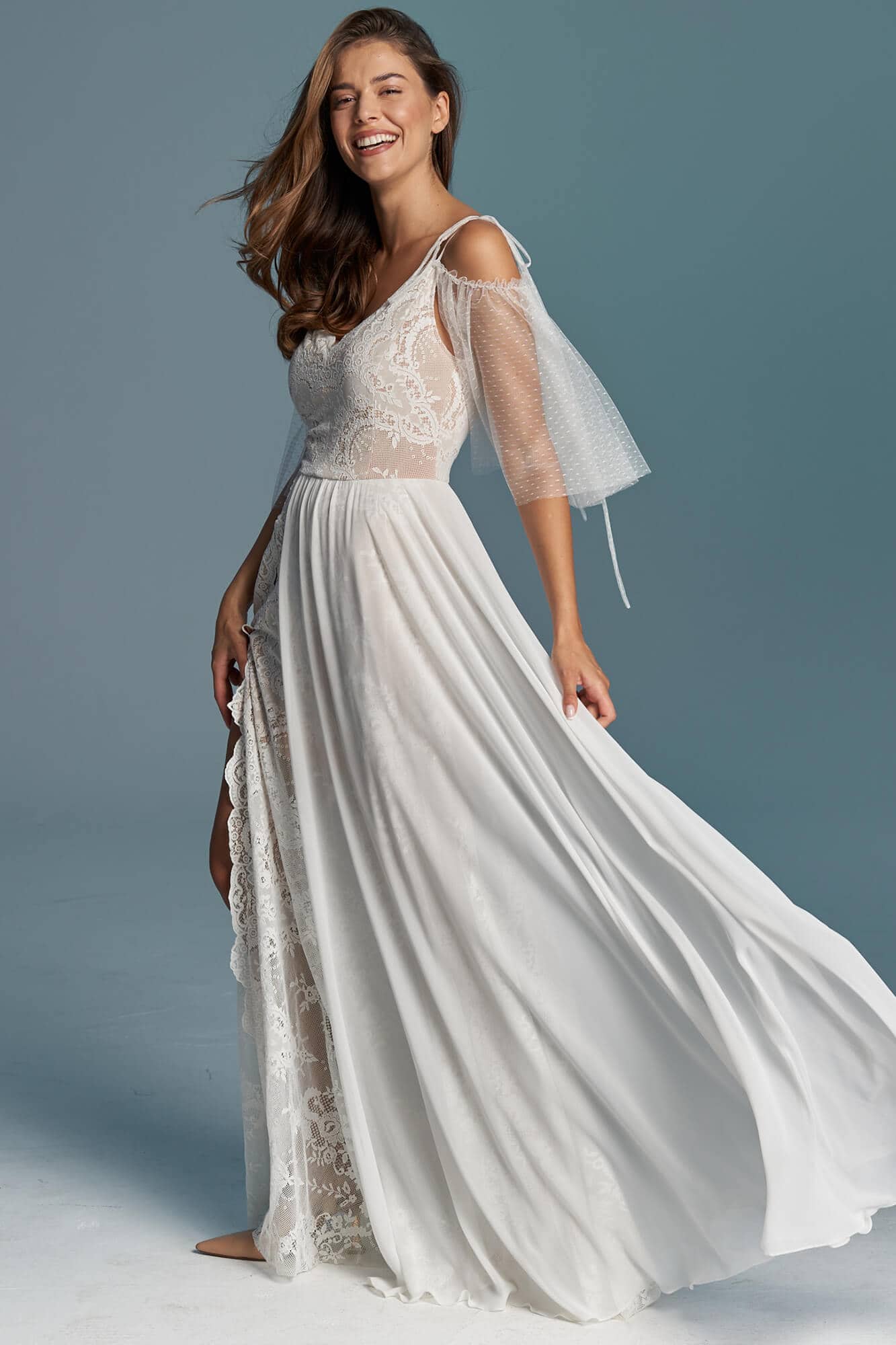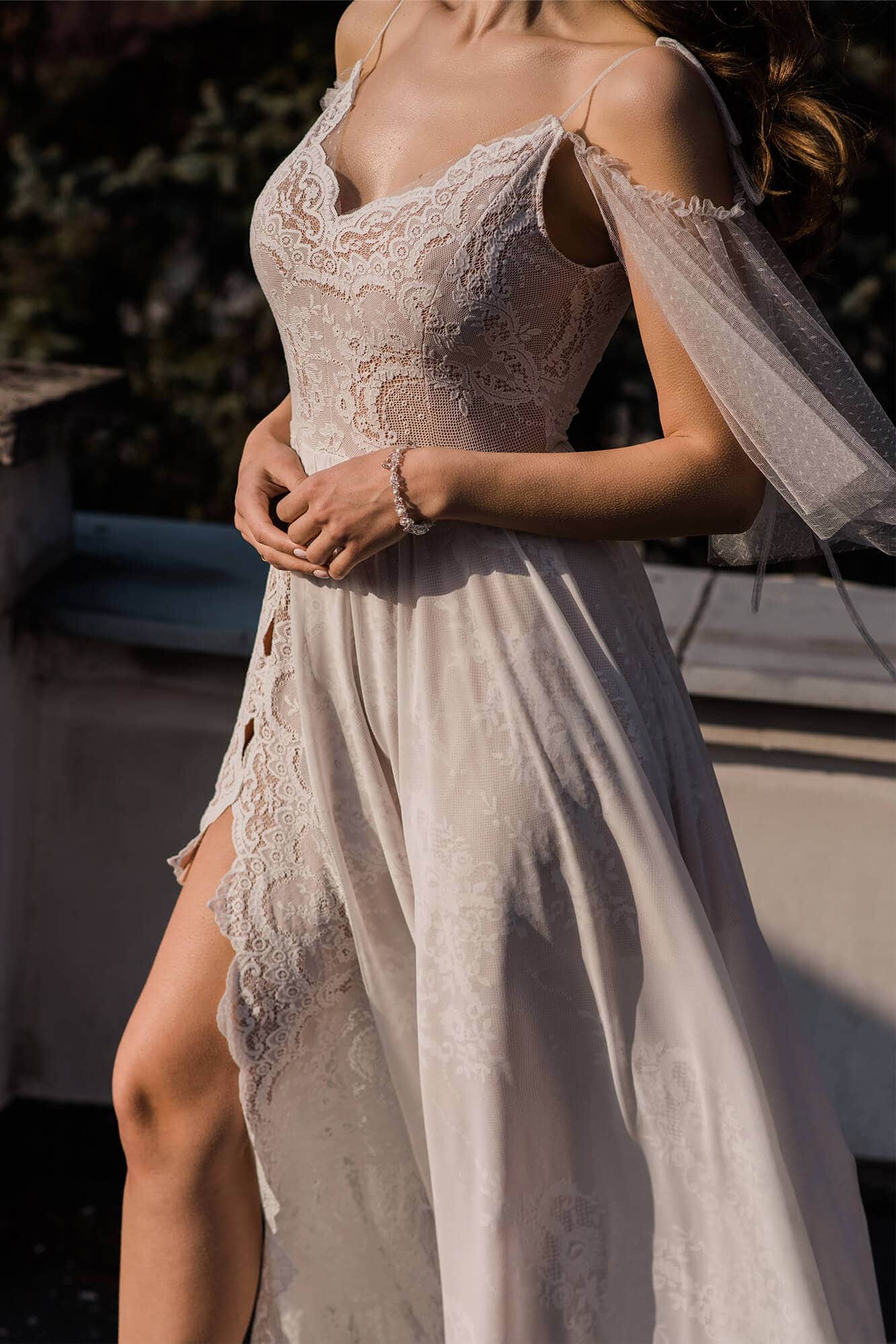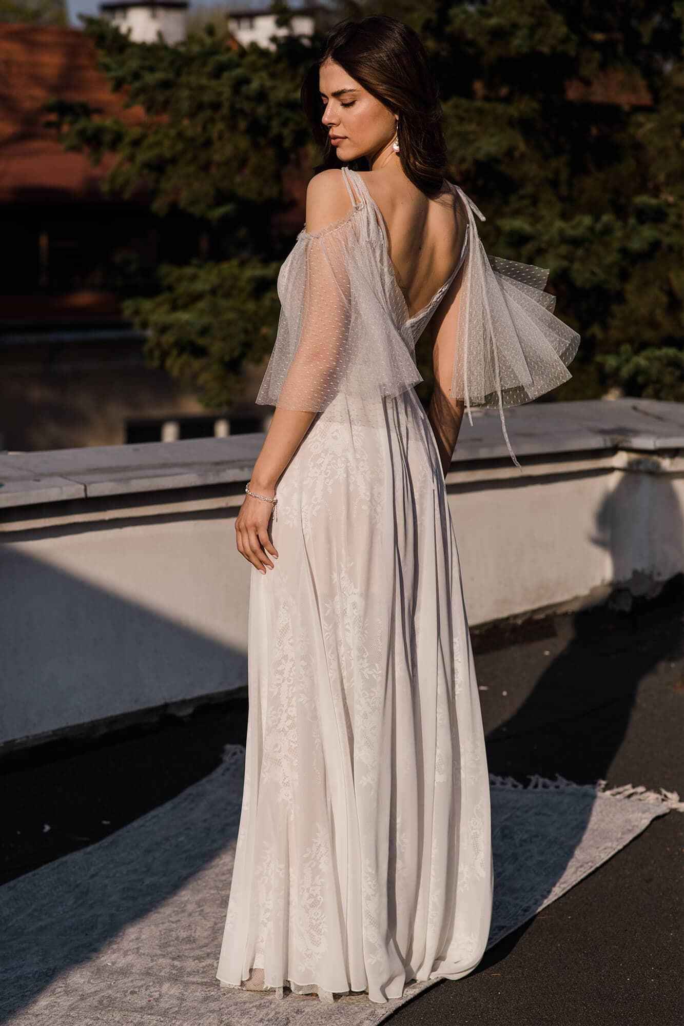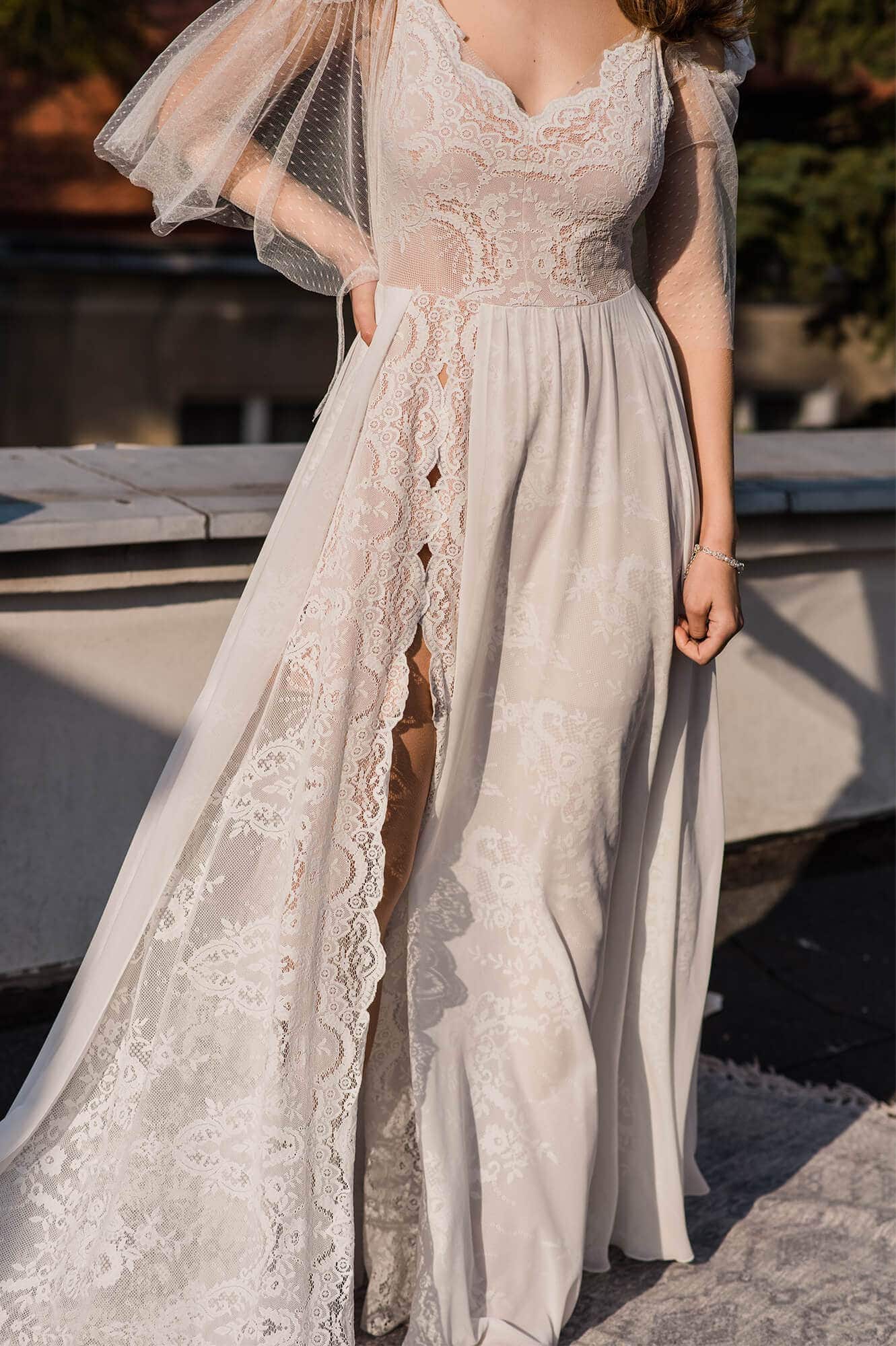 Twoja suknia zostanie uszyta z niesamowicie miękkiego, lekkiego i lejącego szyfonu, który będzie się poruszał nawet przy lekkim ruchu powietrza. Jeśli marzysz o klasycznej sukni ślubnej, ale przeraża Cię jej ciężar lub niewygodny gorset to jest to idealne rozwiązanie dla Ciebie! Ta suknia jest tak lekka, że możesz zapomnieć ją założyć! A podszewka tak elastyczna, że nie będziesz chciała jej zdjąć! Diabeł tkwi w szczegółach - zobacz subtelne wykończenia.