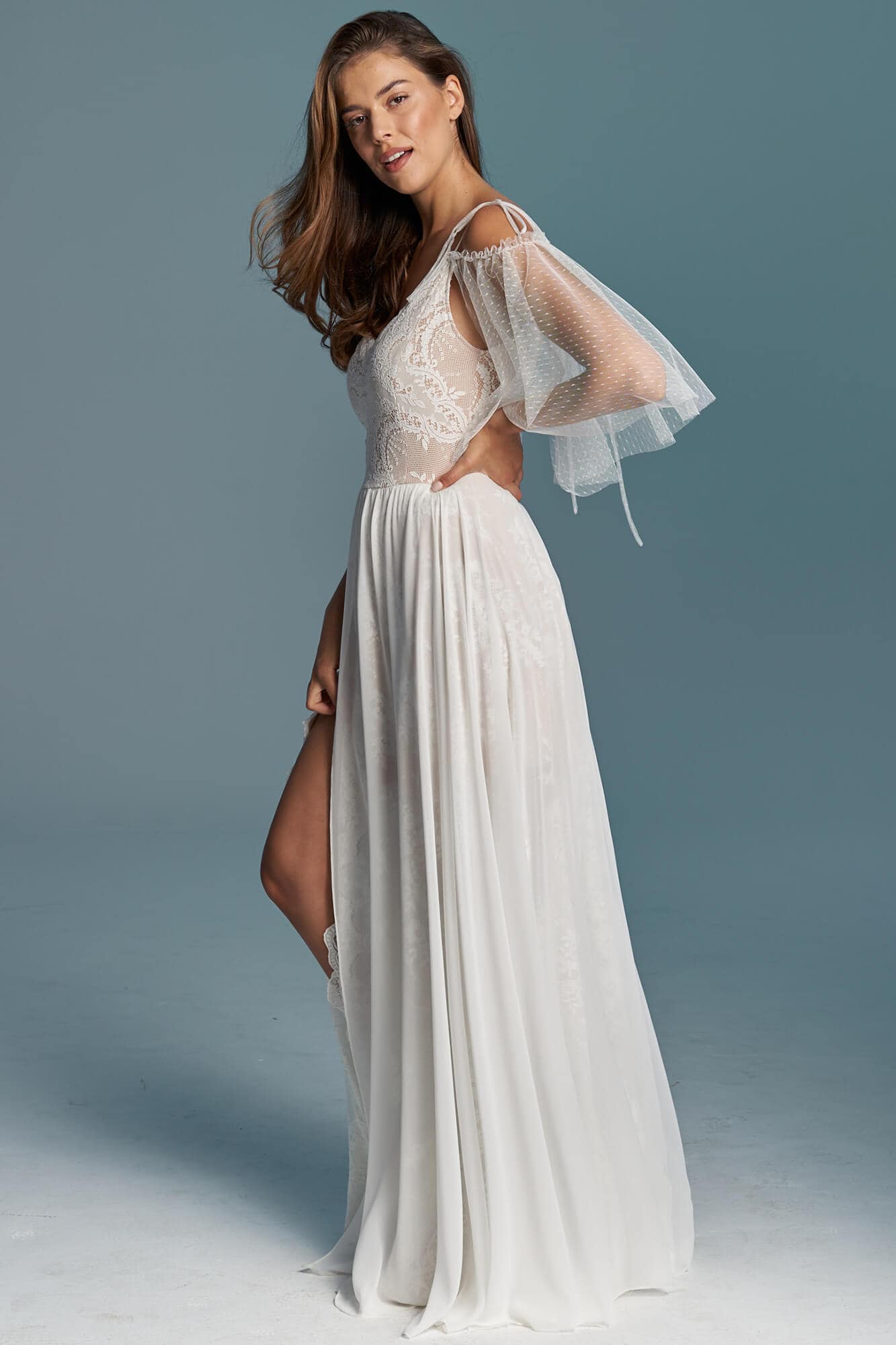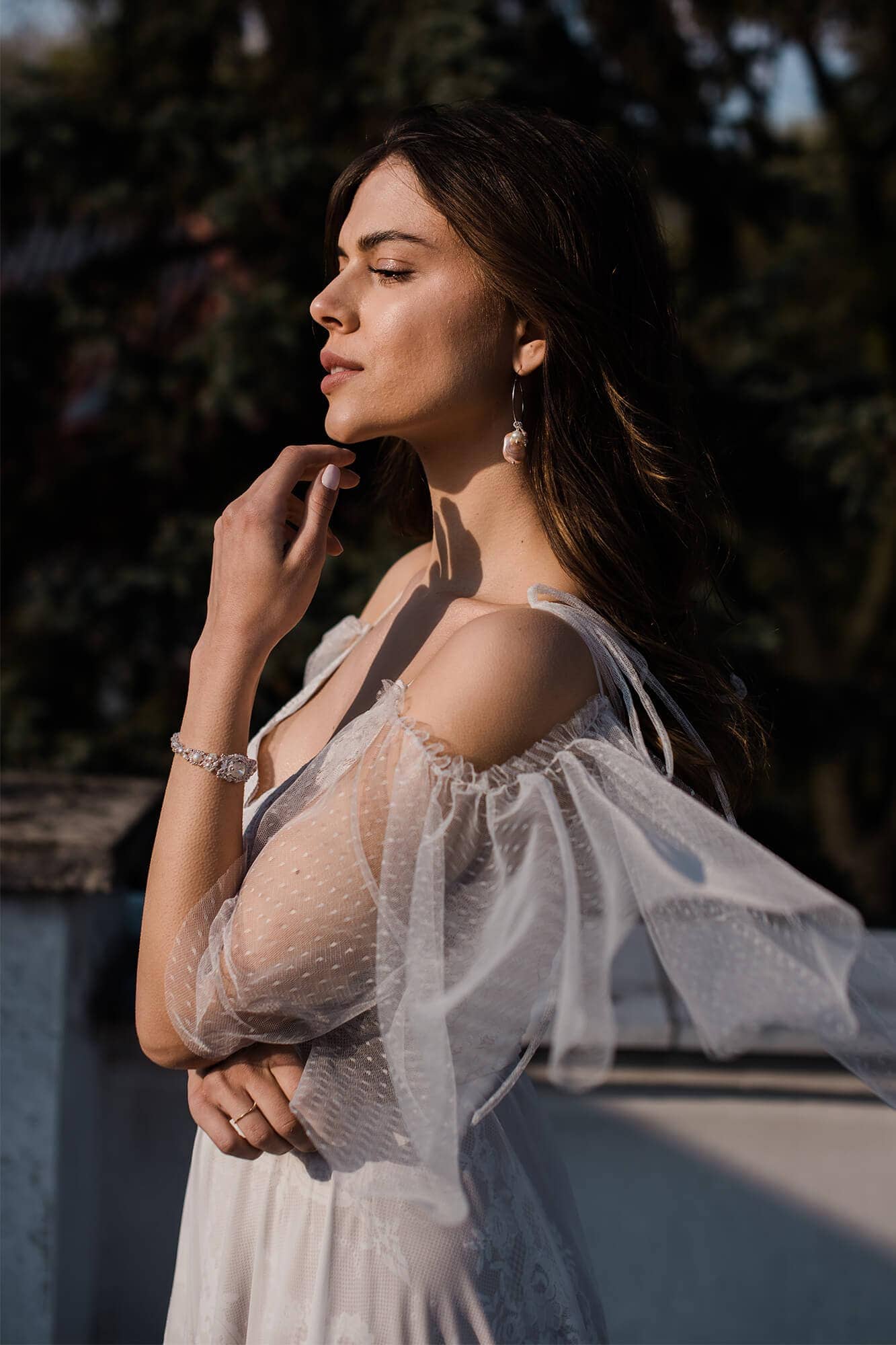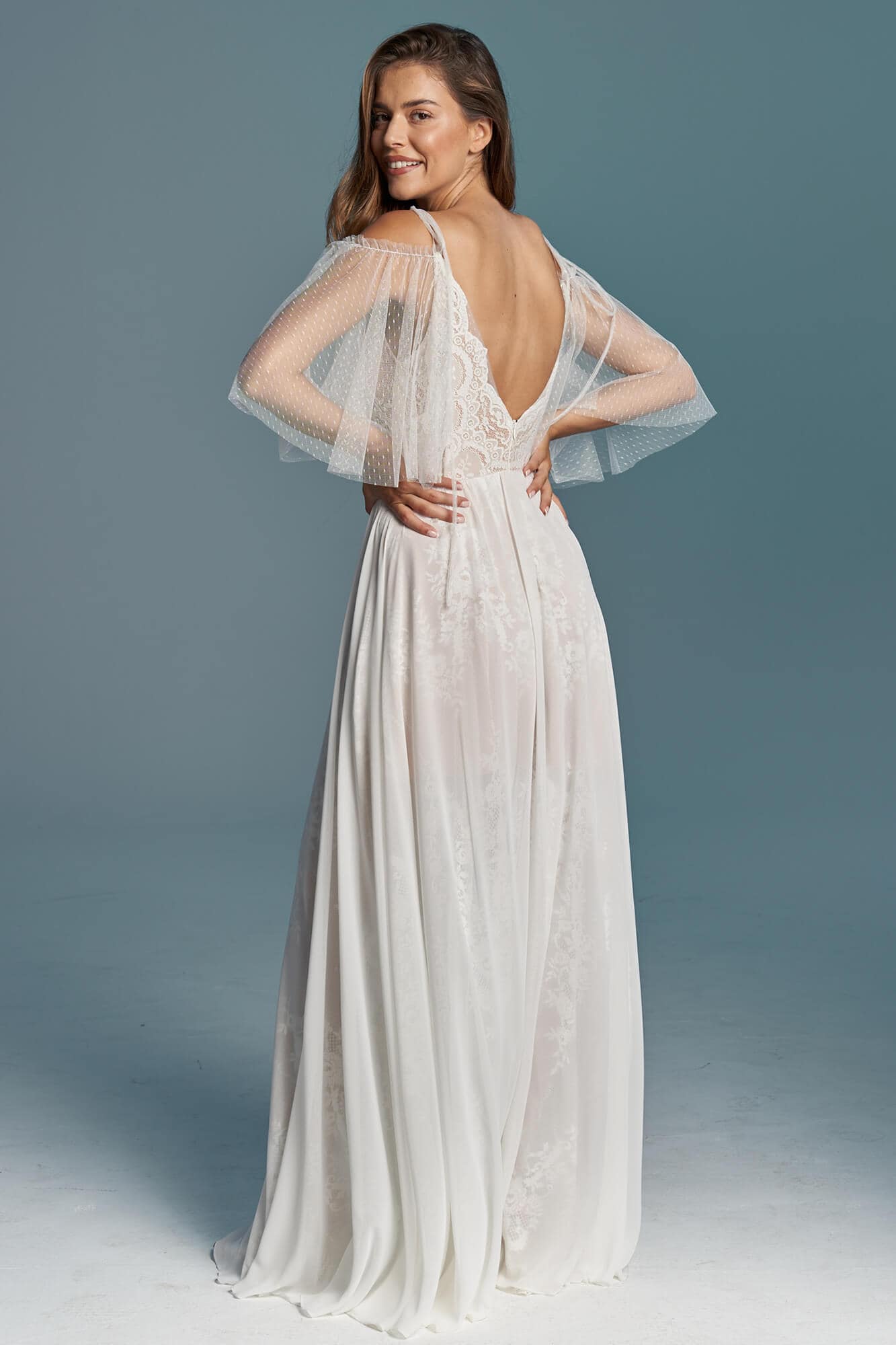 Twoja suknia zostanie uszyta z niesamowicie miękkiego, lekkiego i lejącego szyfonu, który będzie się poruszał nawet przy lekkim ruchu powietrza. Jeśli marzysz o klasycznej sukni ślubnej, ale przeraża Cię jej ciężar lub niewygodny gorset to jest to idealne rozwiązanie dla Ciebie! Ta suknia jest tak lekka, że możesz zapomnieć ją założyć! A podszewka tak elastyczna, że nie będziesz chciała jej zdjąć! Diabeł tkwi w szczegółach - zobacz subtelne wykończenia.