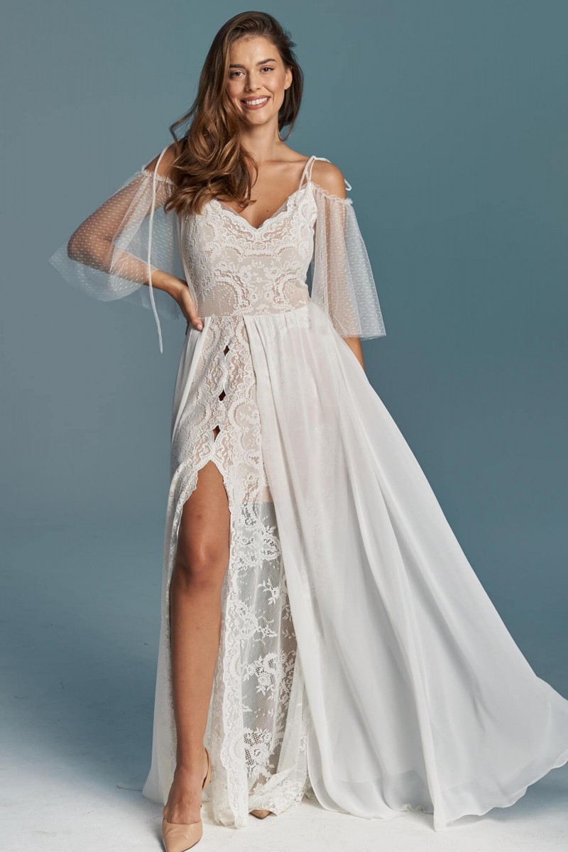 Ta suknia to model wyjściowy - możemy w niej zmienić praktycznie wszystko! Pogłębić lub spłycić dekolt, zmienić jego wykończenie, kształt, dodać lub odjąć falbankę czy frędzle. Rękawy mogą być dłuższe lub krótsze, mieć inny kształt niż te na zdjęciu. Może też nie być ich wcale. Tiul w spódnicy można dodać (lub odjąć) na wierzchu, albo pod spodem. Podszewka może być długa lub krótka w odcieniach bieli i beżu. Rozcięcie na nogę i tren można dodać lub usunąć praktycznie w każdym modelu.