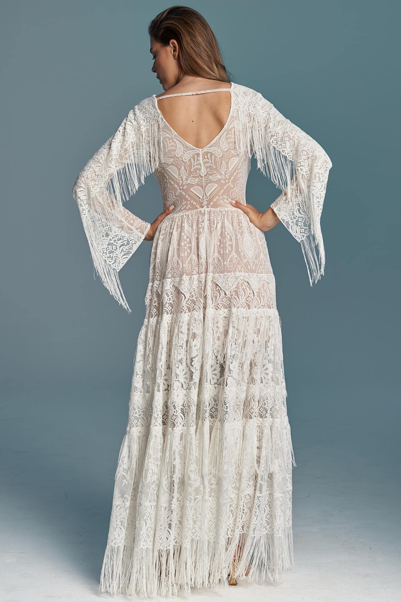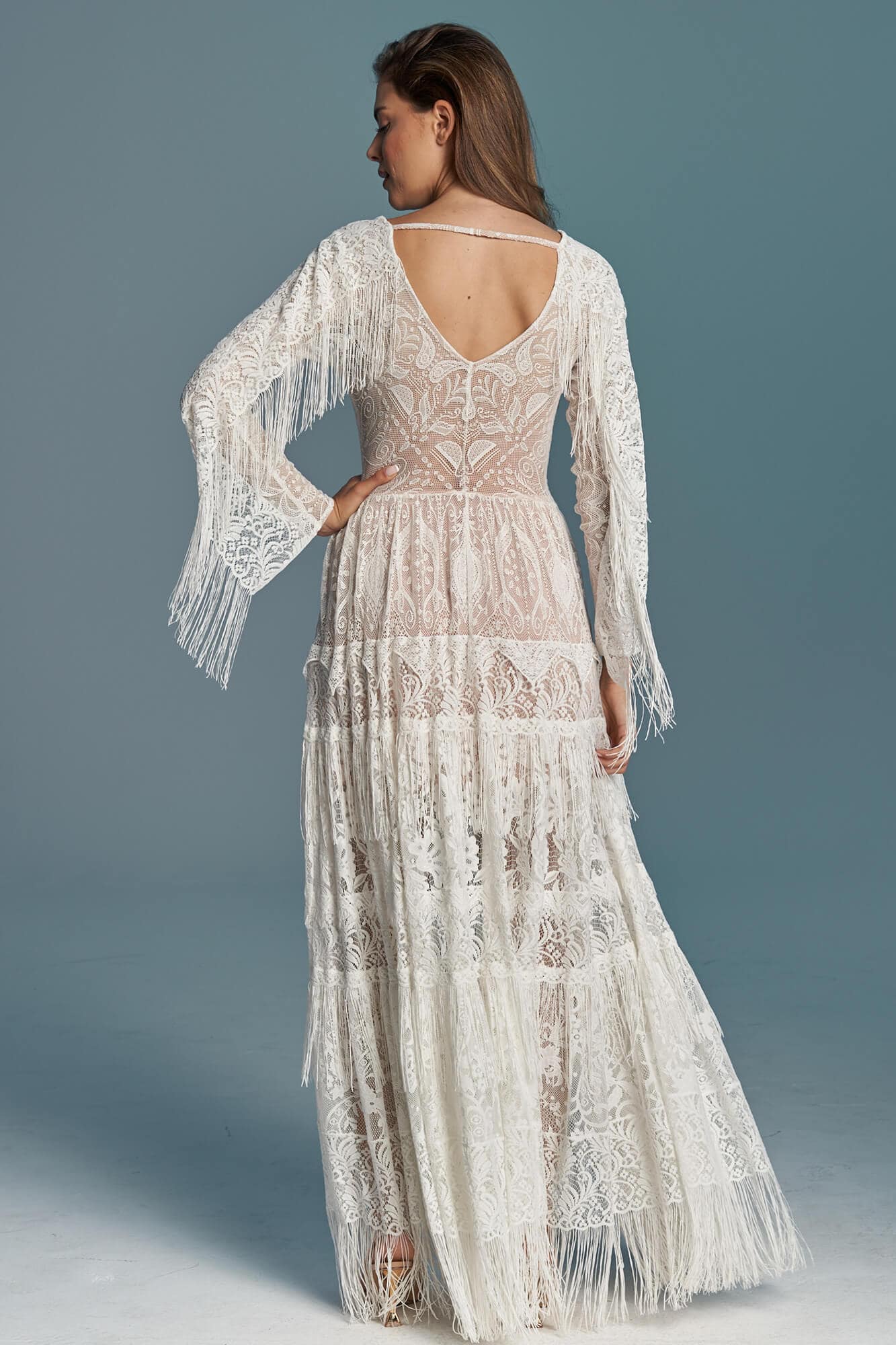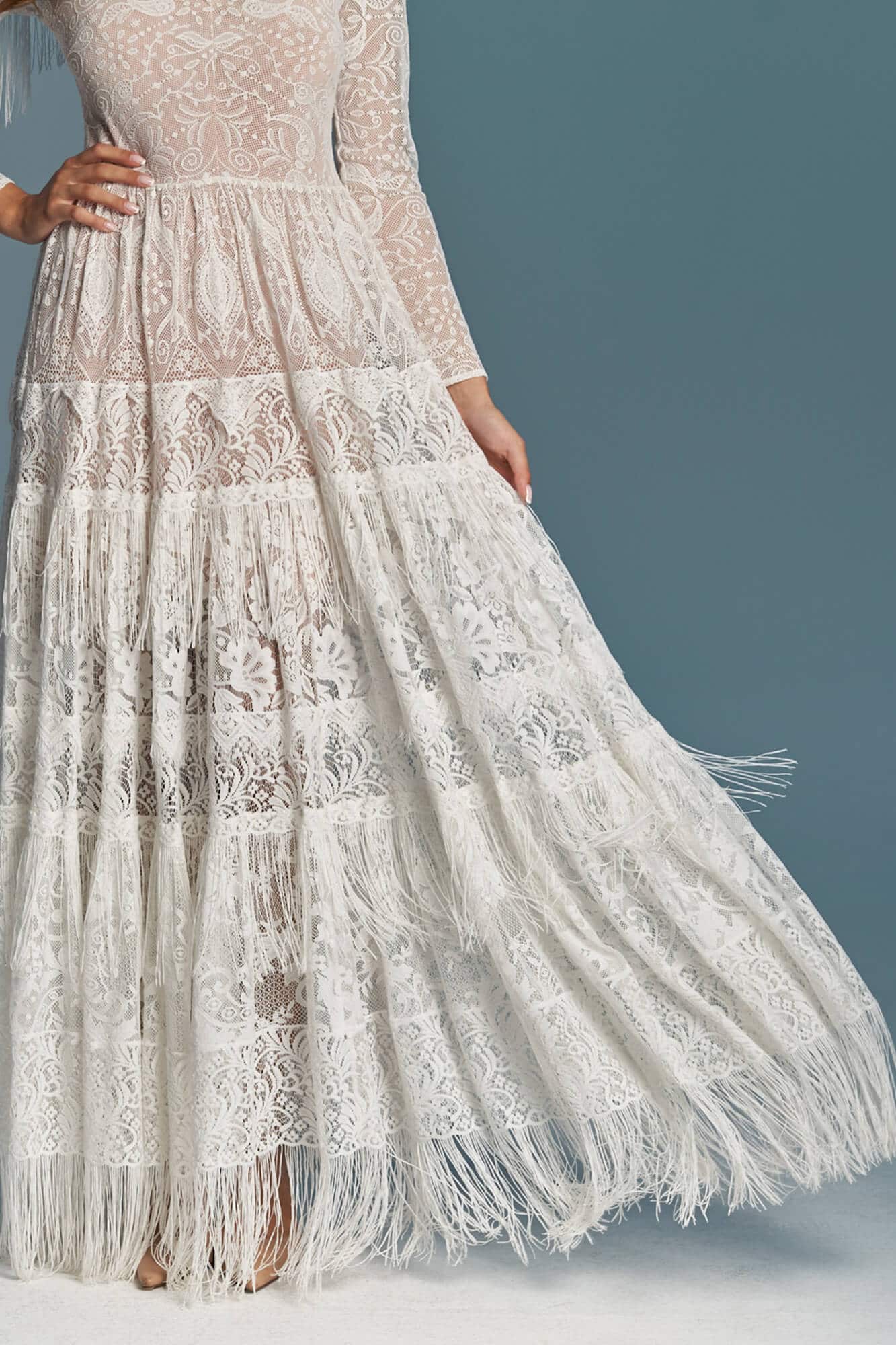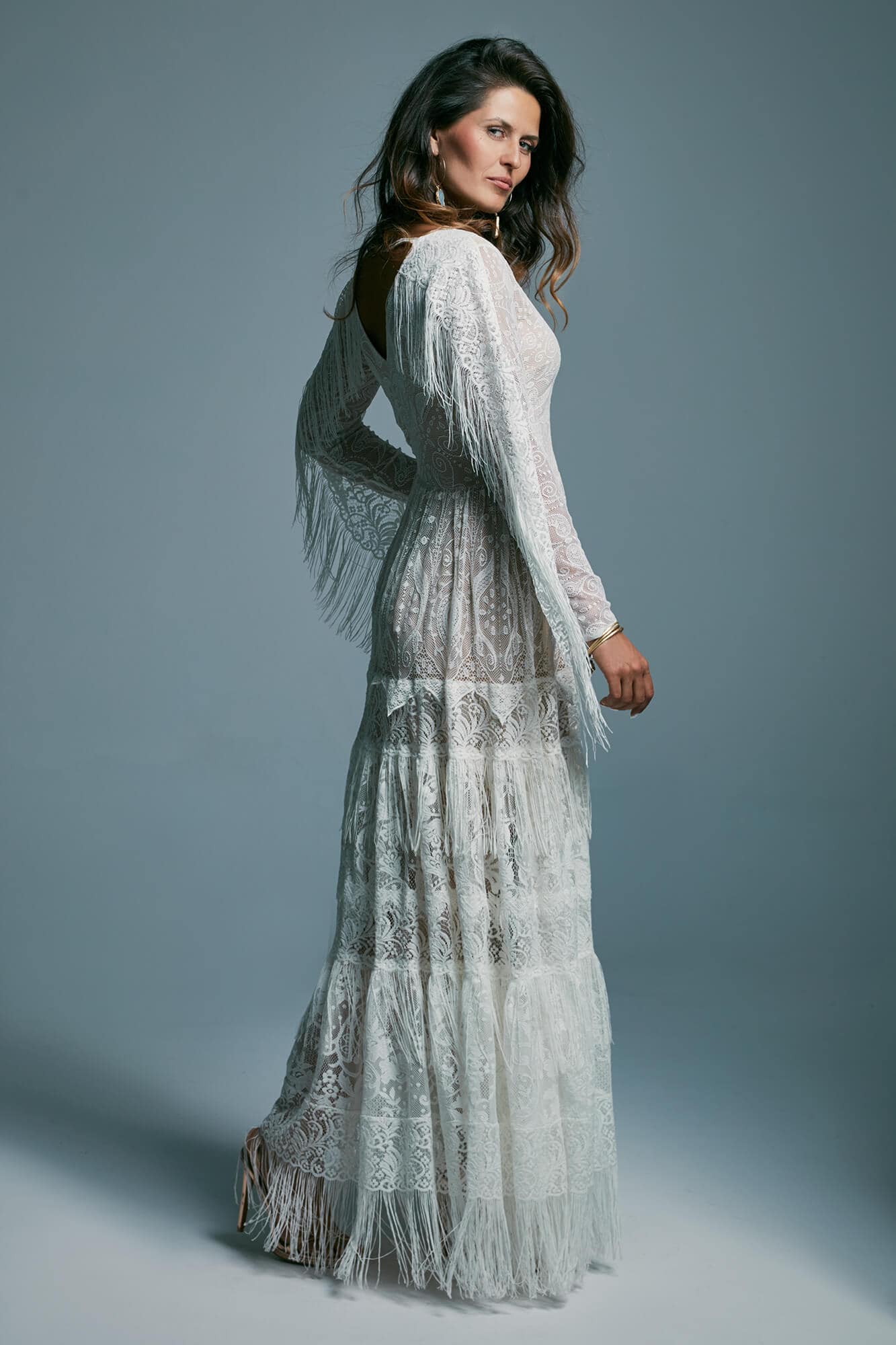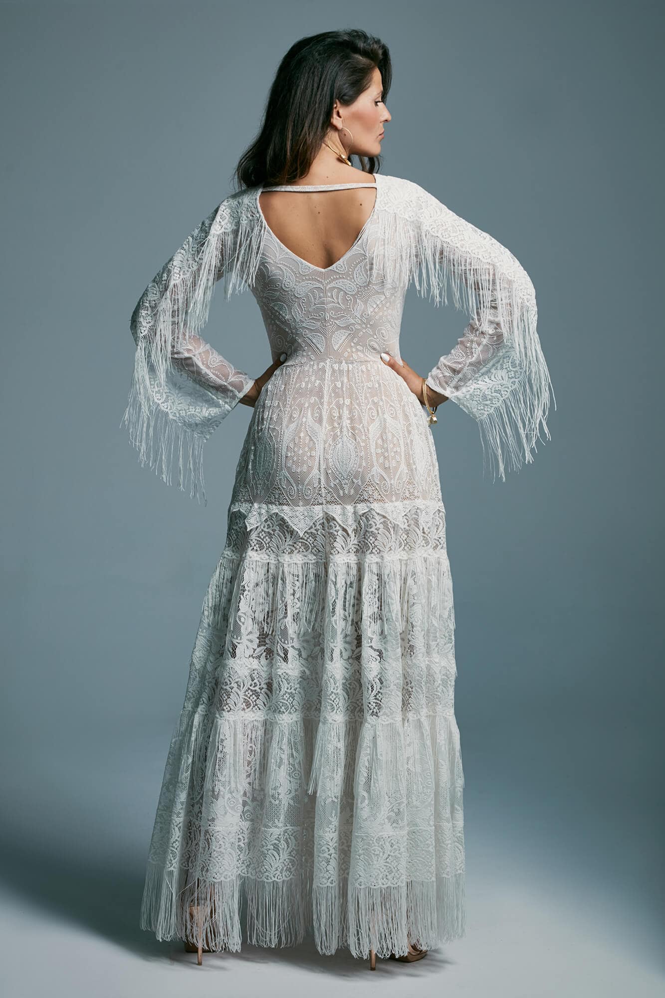 Ta suknia to model wyjściowy - możemy w niej zmienić praktycznie wszystko! Pogłębić lub spłycić dekolt, zmienić jego wykończenie, kształt, dodać lub odjąć falbankę czy frędzle. Rękawy mogą być dłuższe lub krótsze, mieć inny kształt niż te na zdjęciu. Może też nie być ich wcale. Tiul w spódnicy można dodać (lub odjąć) na wierzchu, albo pod spodem. Podszewka może być długa lub krótka w odcieniach bieli i beżu. Rozcięcie na nogę i tren można dodać lub usunąć praktycznie w każdym modelu.