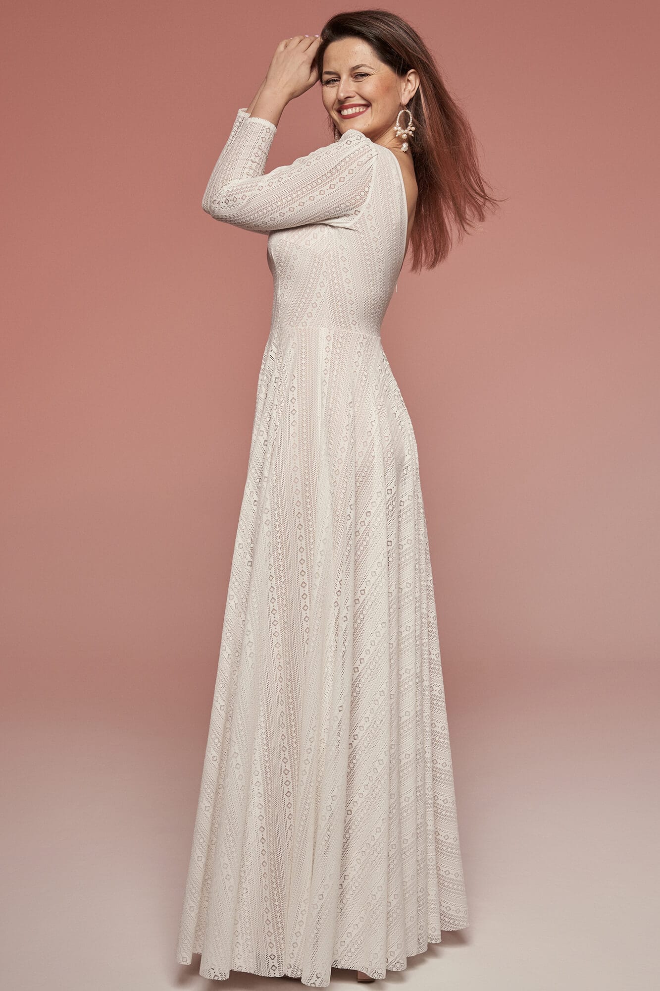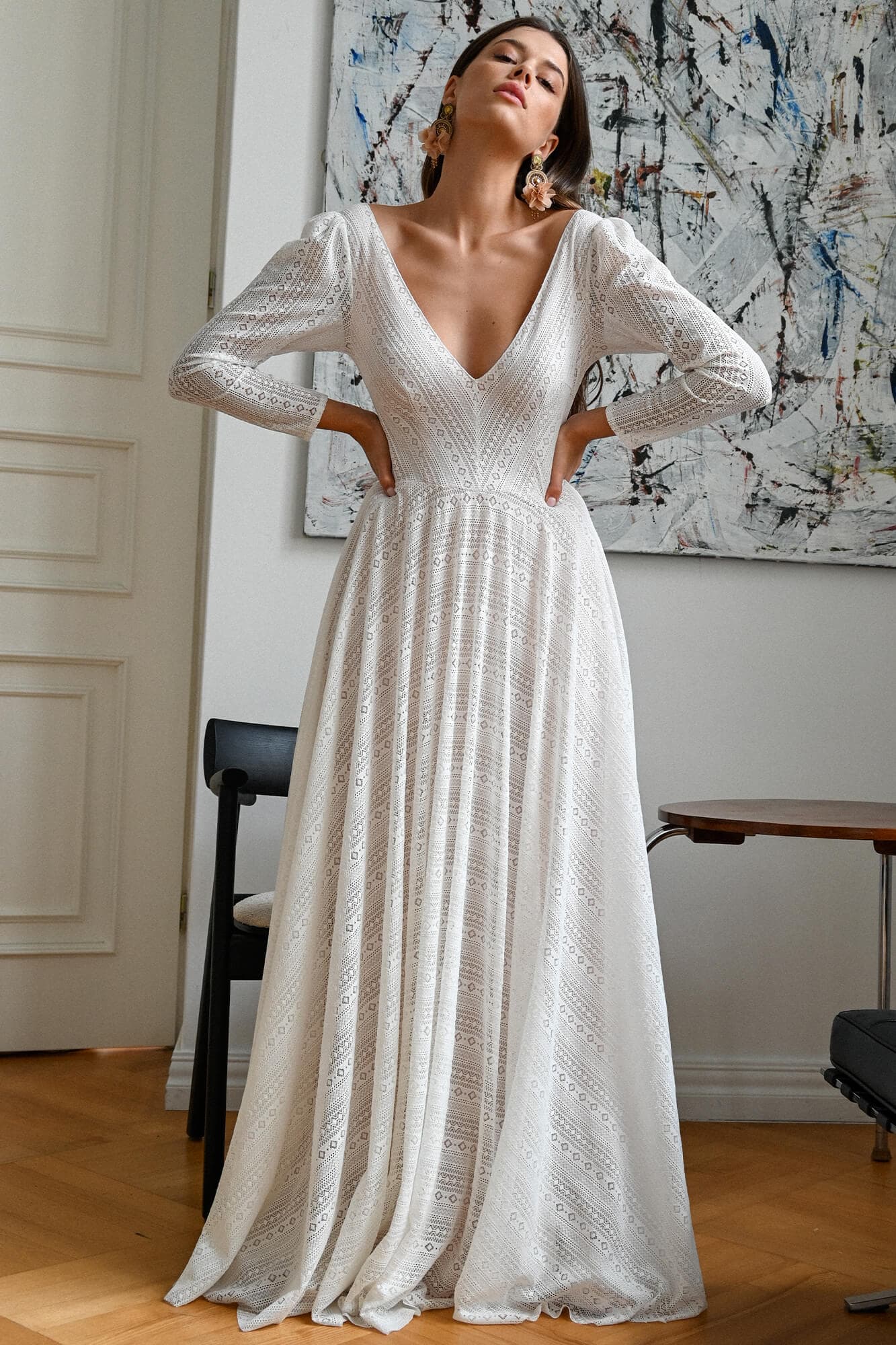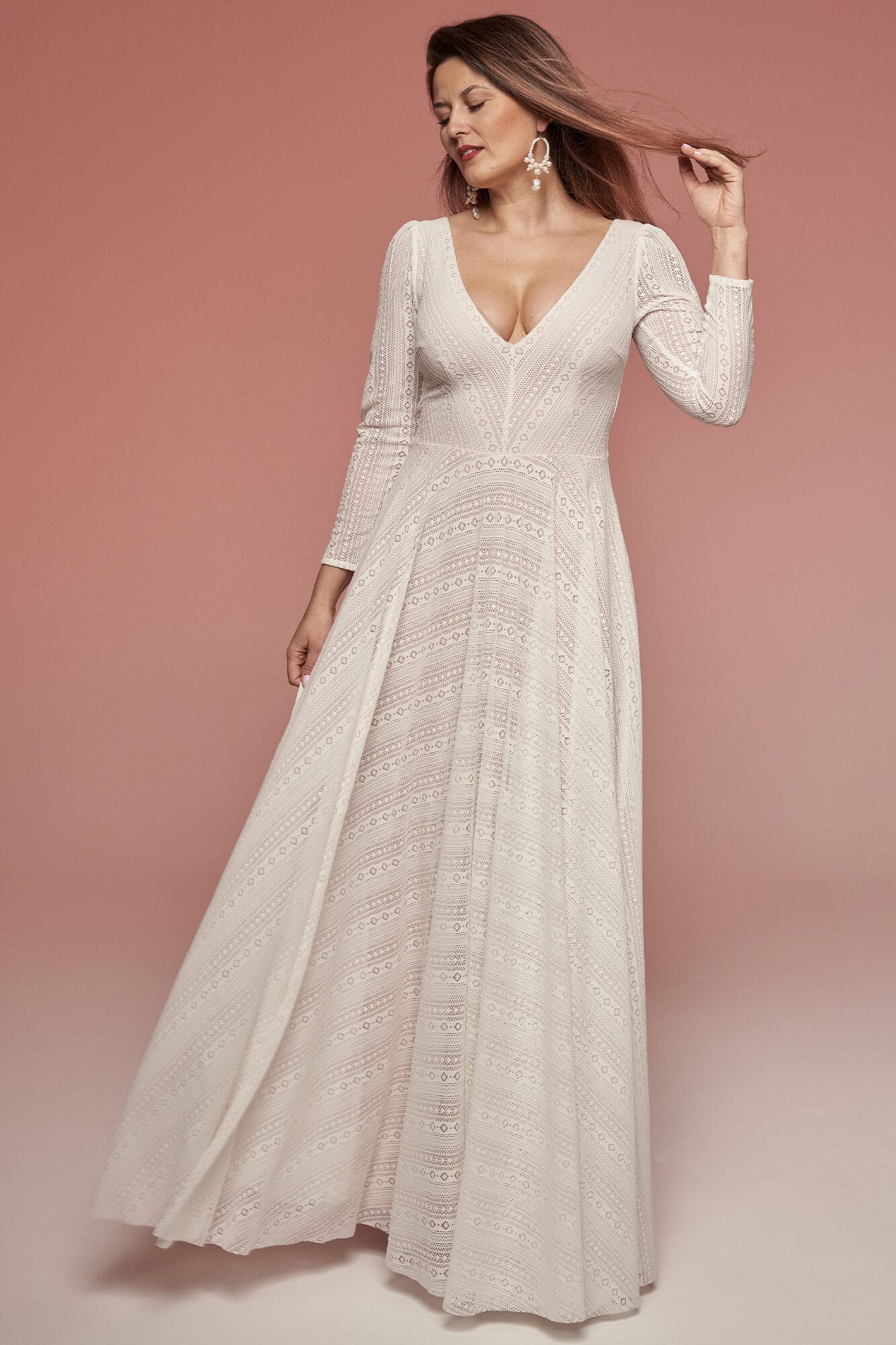 Ta suknia to model wyjściowy - możemy w niej zmienić praktycznie wszystko! Pogłębić lub spłycić dekolt, zmienić jego wykończenie, kształt, dodać lub odjąć falbankę czy frędzle. Rękawy mogą być dłuższe lub krótsze, mieć inny kształt niż te na zdjęciu. Może też nie być ich wcale. Tiul w spódnicy można dodać (lub odjąć) na wierzchu, albo pod spodem. Podszewka może być długa lub krótka w odcieniach bieli i beżu. Rozcięcie na nogę i tren można dodać lub usunąć praktycznie w każdym modelu.