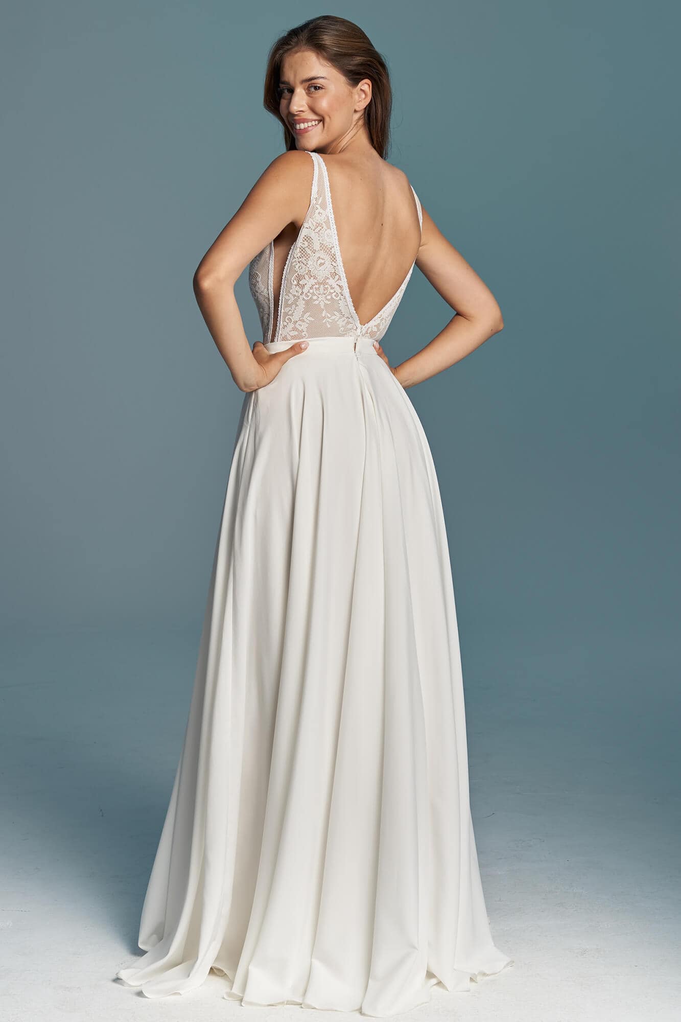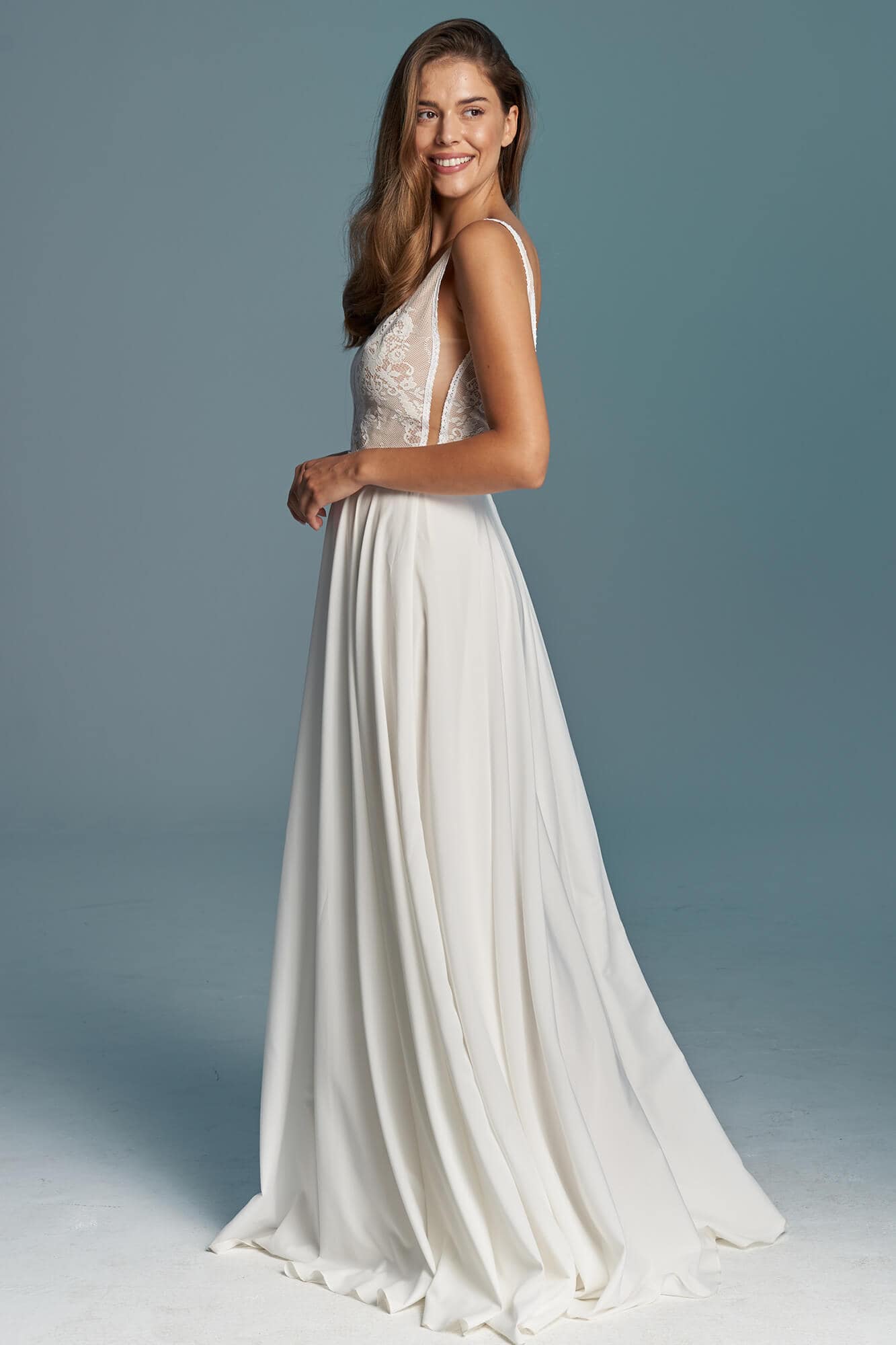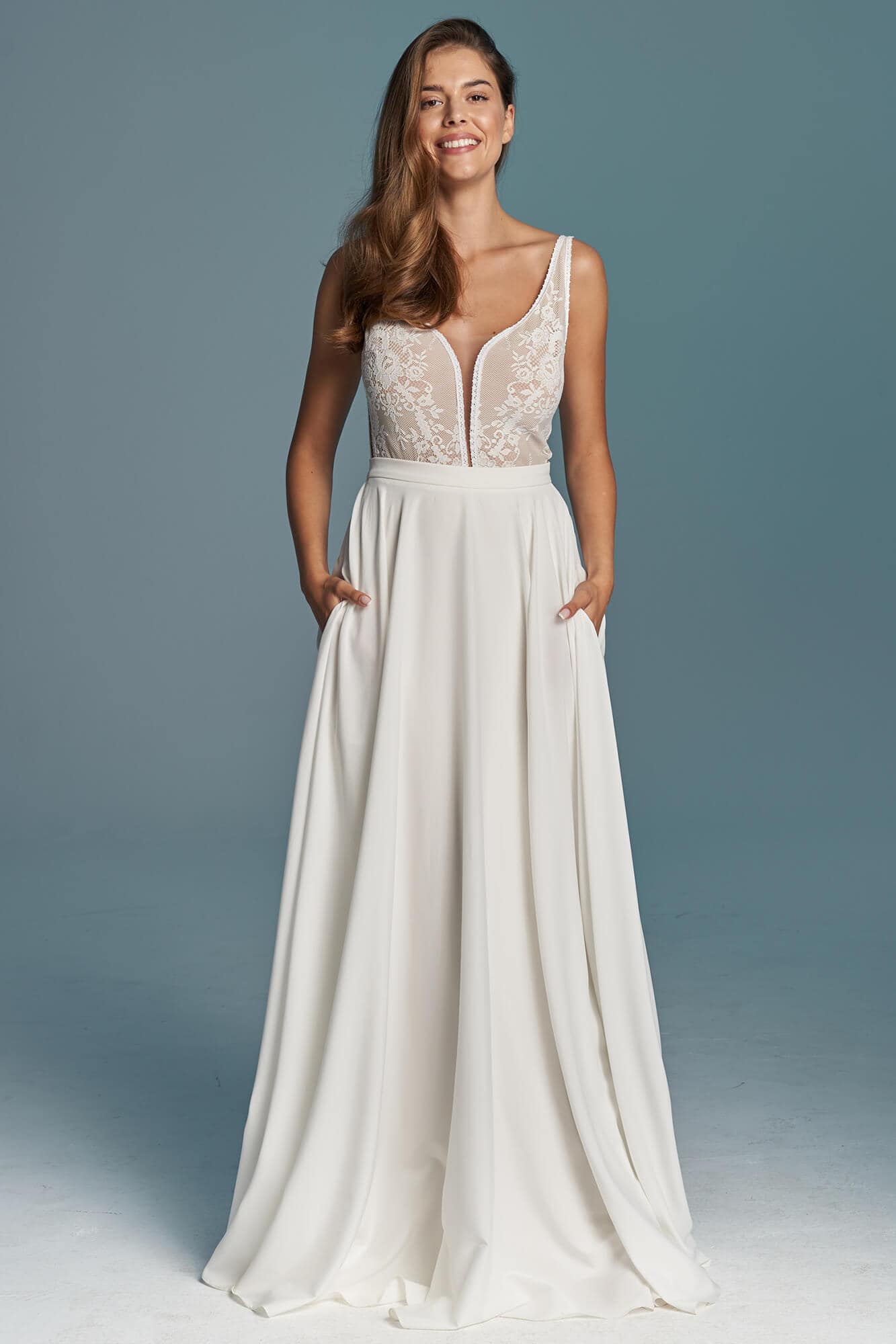 Uszyta ze sprawdzonych i przetestowanych przez nas materiałów. Używane przez nas koronki są mięciutkie, a dzięki swej lekkości cudownie układają się na sylwetce i pięknie wirują w tańcu. Ich elastyczność sprawia, że pracują z Twoim ciałem. Zapewniają komfort rosnącemu ciążowemu brzuszkowi. Praktycznie wszystkie nasze koronki są łatwe do prania w domowej pralce i niegniotące, dzięki czemu swoją suknię spokojnie możesz spakować do walizki i zabrać na romantyczną sesję poślubną.