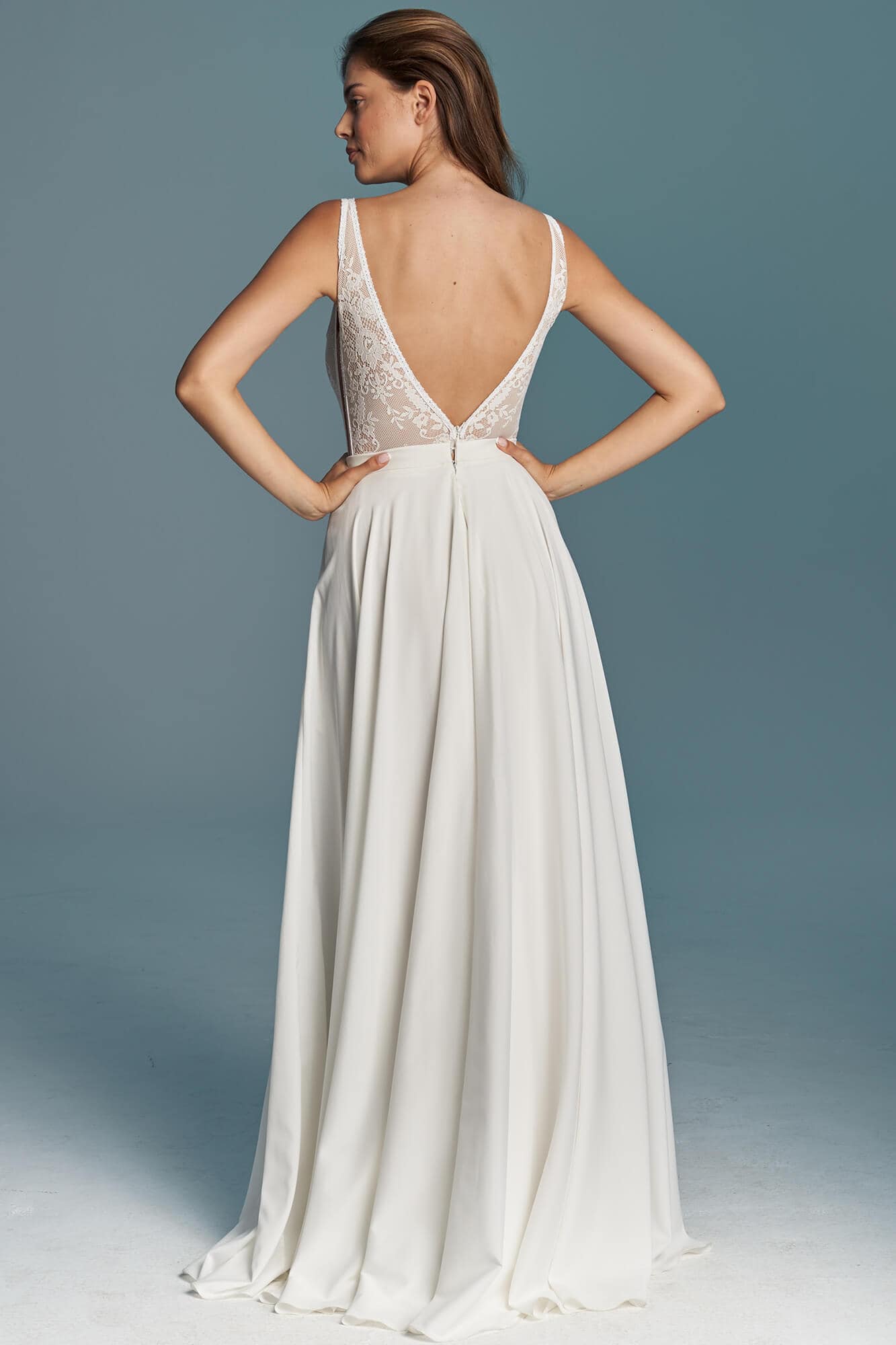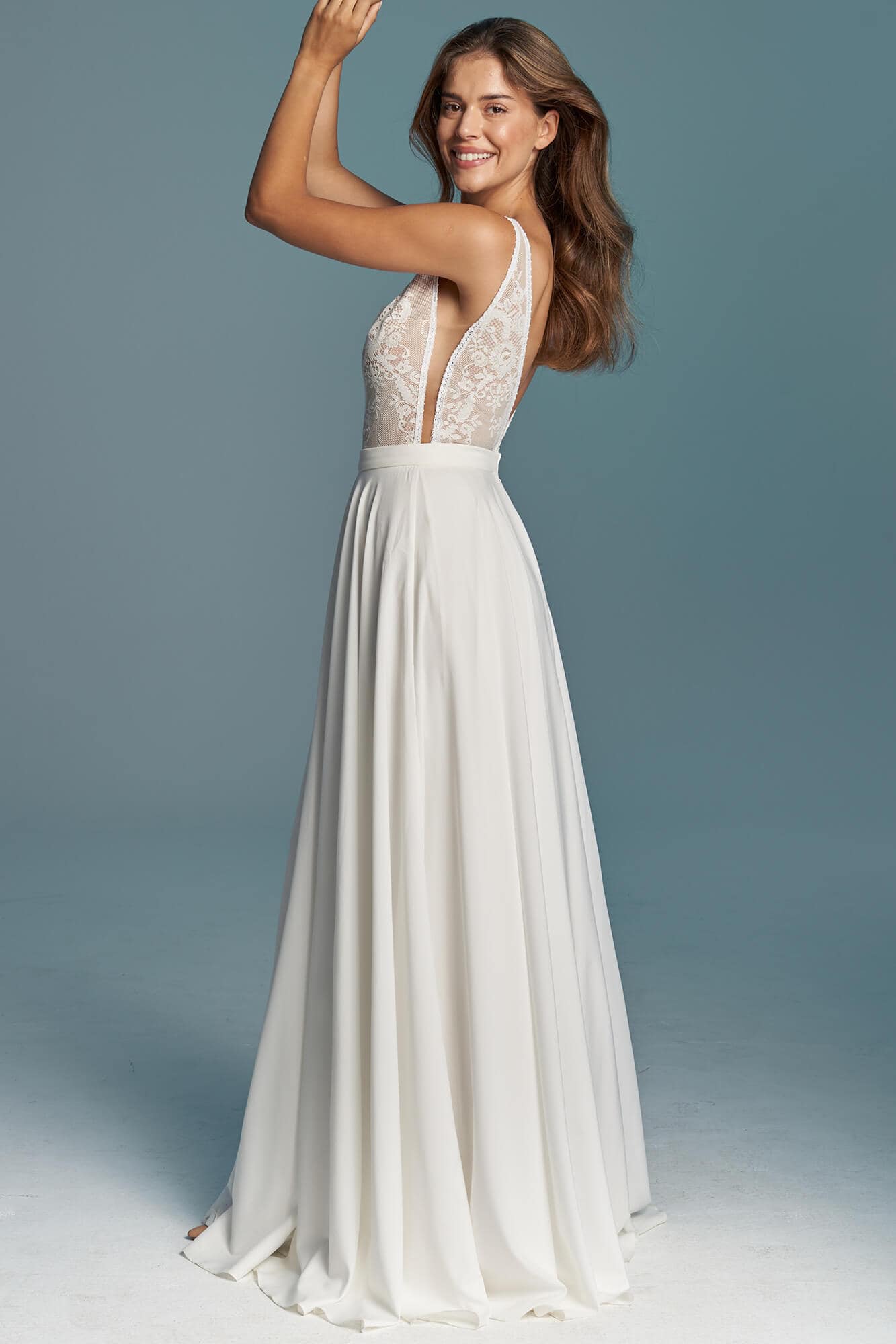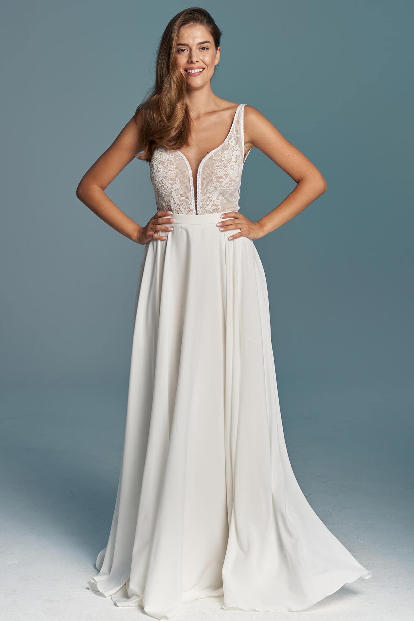 Uszyta ze sprawdzonych i przetestowanych przez nas materiałów. Używane przez nas koronki są mięciutkie, a dzięki swej lekkości cudownie układają się na sylwetce i pięknie wirują w tańcu. Ich elastyczność sprawia, że pracują z Twoim ciałem. Zapewniają komfort rosnącemu ciążowemu brzuszkowi. Praktycznie wszystkie nasze koronki są łatwe do prania w domowej pralce i niegniotące, dzięki czemu swoją suknię spokojnie możesz spakować do walizki i zabrać na romantyczną sesję poślubną.