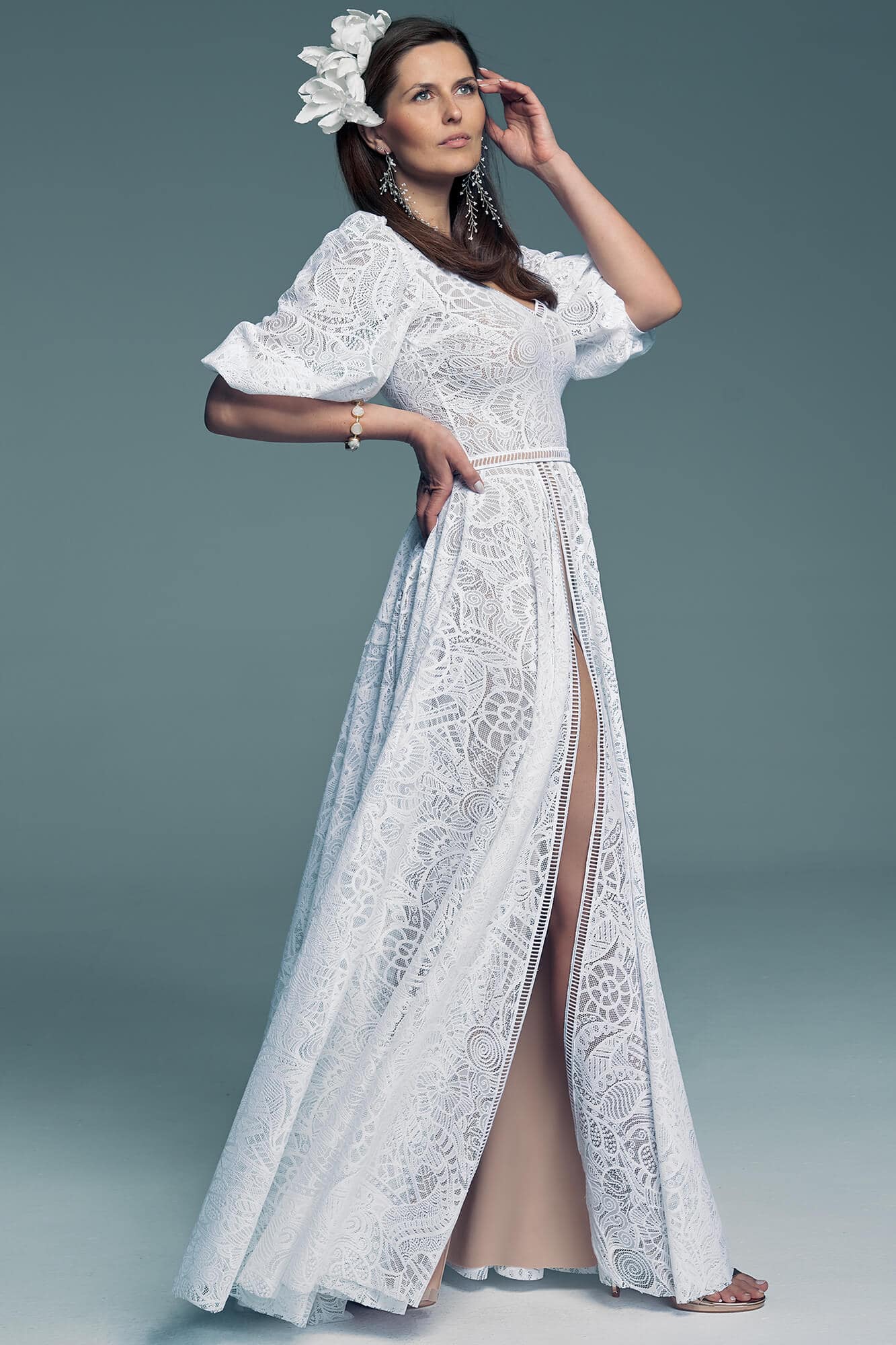 Ta suknia to model wyjściowy - możemy w niej zmienić praktycznie wszystko! Pogłębić lub spłycić dekolt, zmienić jego wykończenie, kształt, dodać lub odjąć falbankę czy frędzle. Rękawy mogą być dłuższe lub krótsze, mieć inny kształt niż te na zdjęciu. Może też nie być ich wcale. Tiul w spódnicy można dodać (lub odjąć) na wierzchu, albo pod spodem. Podszewka może być długa lub krótka w odcieniach bieli i beżu. Rozcięcie na nogę i tren można dodać lub usunąć praktycznie w każdym modelu.