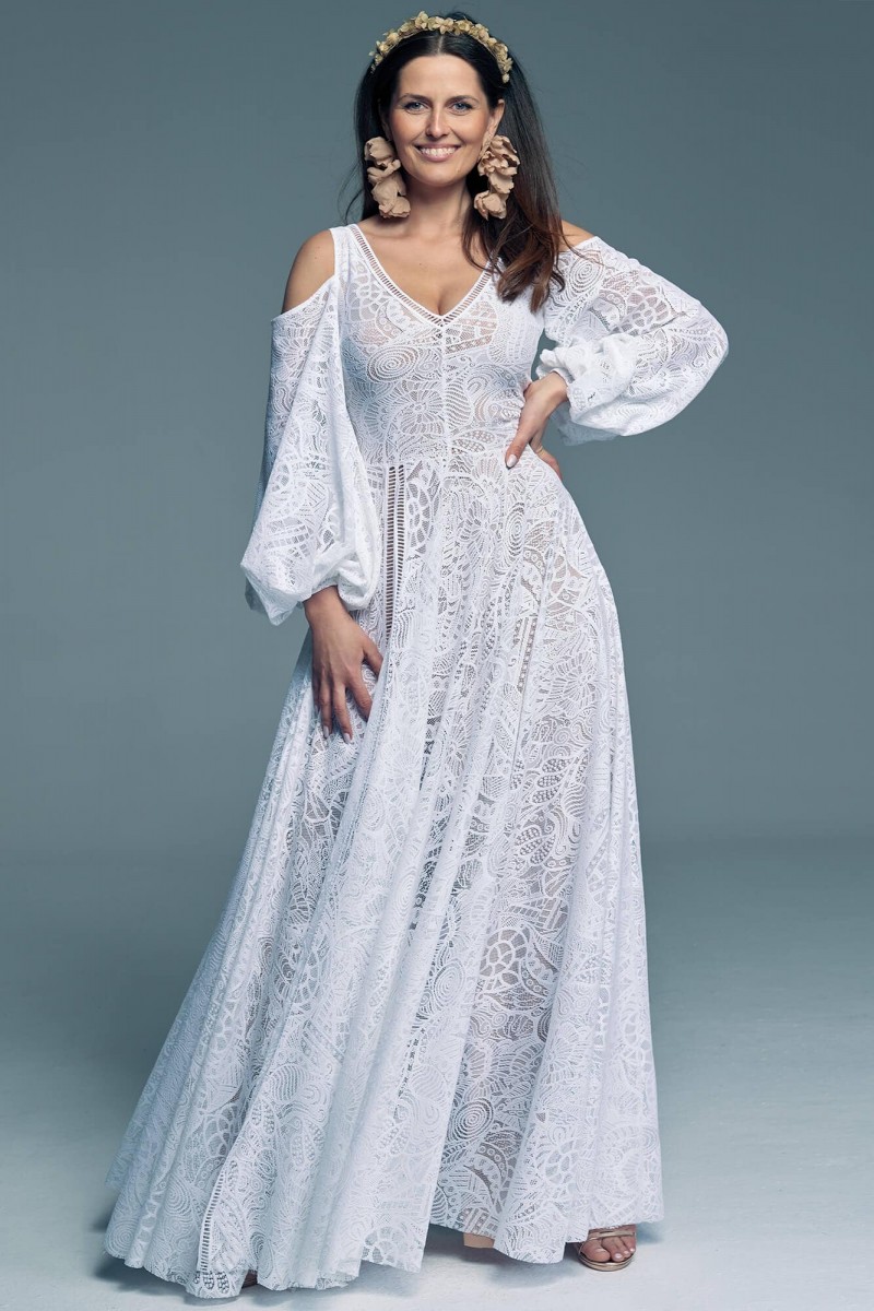 Ta suknia to model wyjściowy - możemy w niej zmienić praktycznie wszystko! Pogłębić lub spłycić dekolt, zmienić jego wykończenie, kształt, dodać lub odjąć falbankę czy frędzle. Rękawy mogą być dłuższe lub krótsze, mieć inny kształt niż te na zdjęciu. Może też nie być ich wcale. Tiul w spódnicy można dodać (lub odjąć) na wierzchu, albo pod spodem. Podszewka może być długa lub krótka w odcieniach bieli i beżu. Rozcięcie na nogę i tren można dodać lub usunąć praktycznie w każdym modelu.