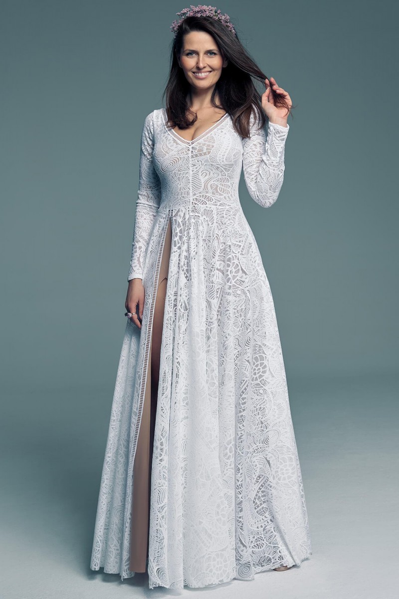 Ta suknia to model wyjściowy - możemy w niej zmienić praktycznie wszystko! Pogłębić lub spłycić dekolt, zmienić jego wykończenie, kształt, dodać lub odjąć falbankę czy frędzle. Rękawy mogą być dłuższe lub krótsze, mieć inny kształt niż te na zdjęciu. Może też nie być ich wcale. Tiul w spódnicy można dodać (lub odjąć) na wierzchu, albo pod spodem. Podszewka może być długa lub krótka w odcieniach bieli i beżu. Rozcięcie na nogę i tren można dodać lub usunąć praktycznie w każdym modelu.