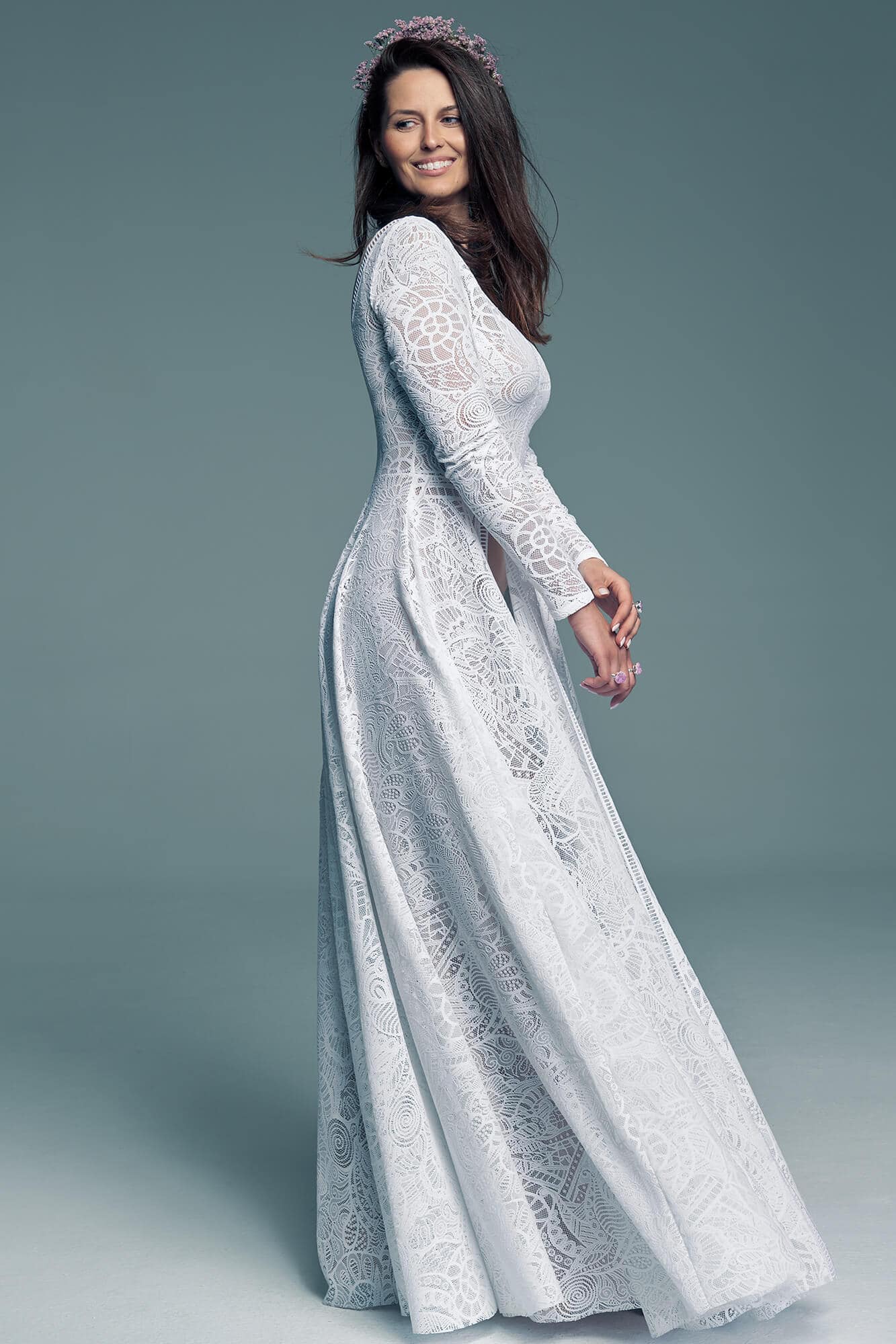 Uszyta ze sprawdzonych i przetestowanych przez nas materiałów. Używane przez nas koronki są mięciutkie, a dzięki swej lekkości cudownie układają się na sylwetce i pięknie wirują w tańcu. Ich elastyczność sprawia, że pracują z Twoim ciałem. Zapewniają komfort rosnącemu ciążowemu brzuszkowi. Praktycznie wszystkie nasze koronki są łatwe do prania w domowej pralce i niegniotące, dzięki czemu swoją suknię spokojnie możesz spakować do walizki i zabrać na romantyczną sesję poślubną.