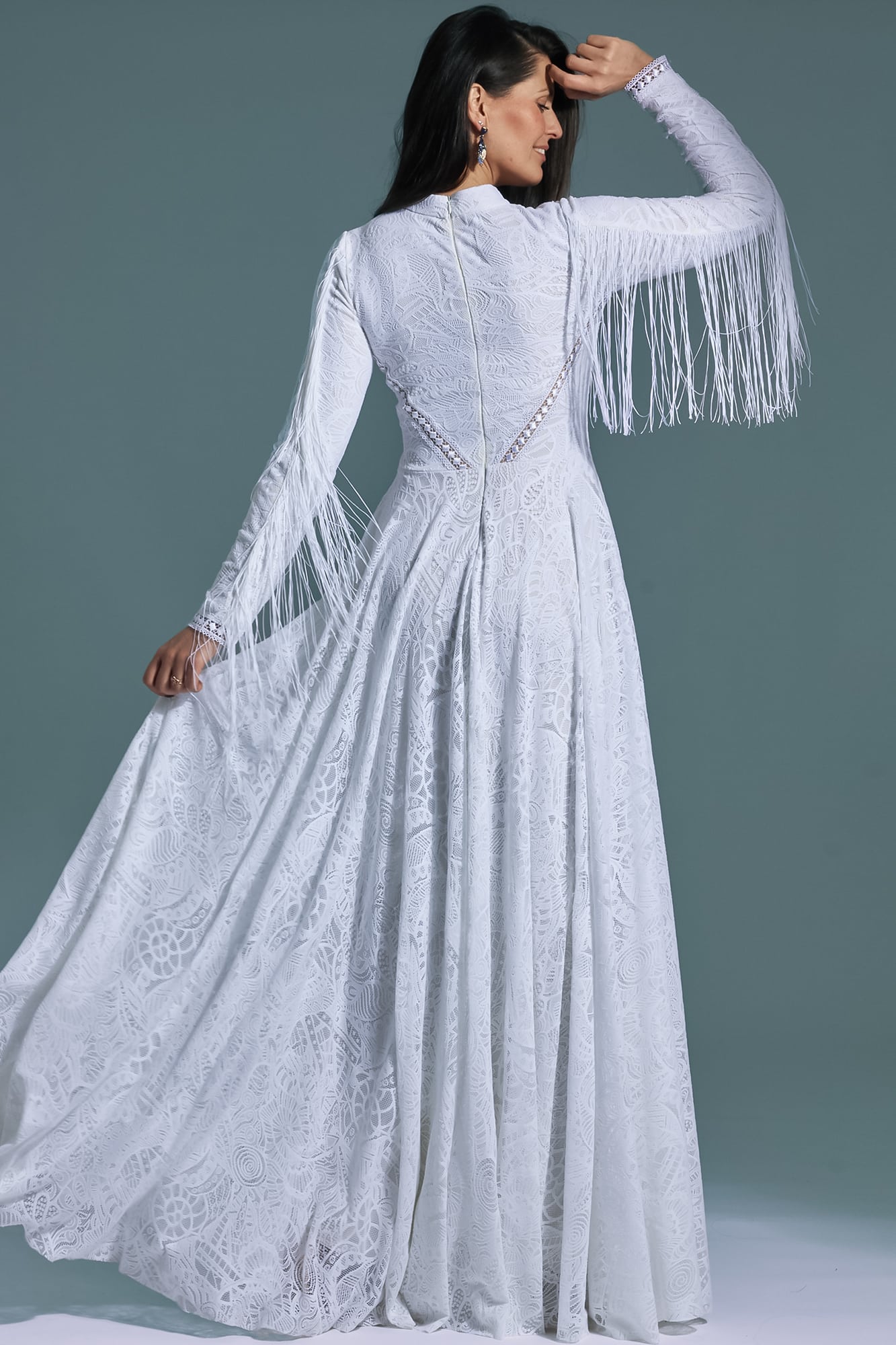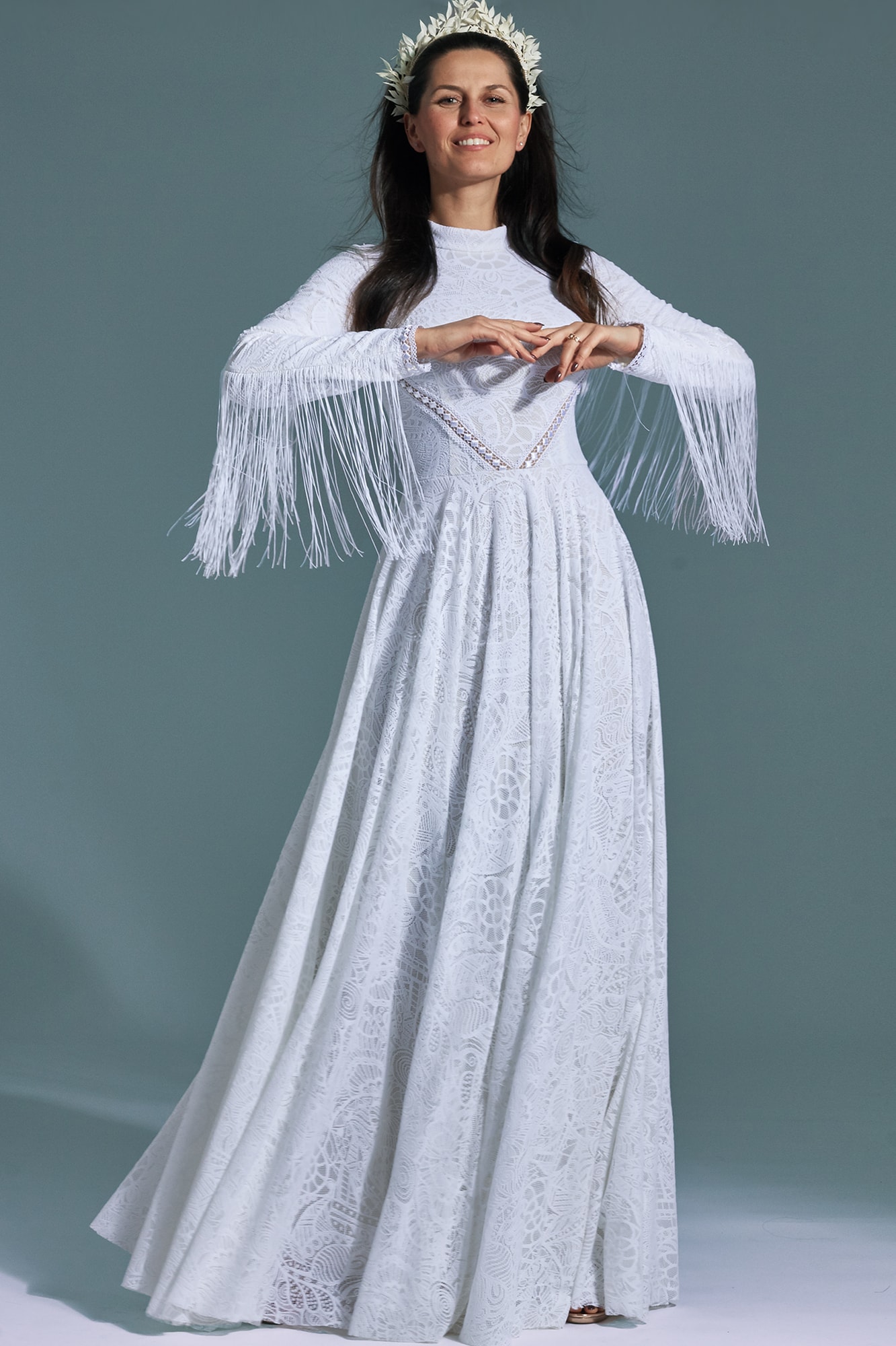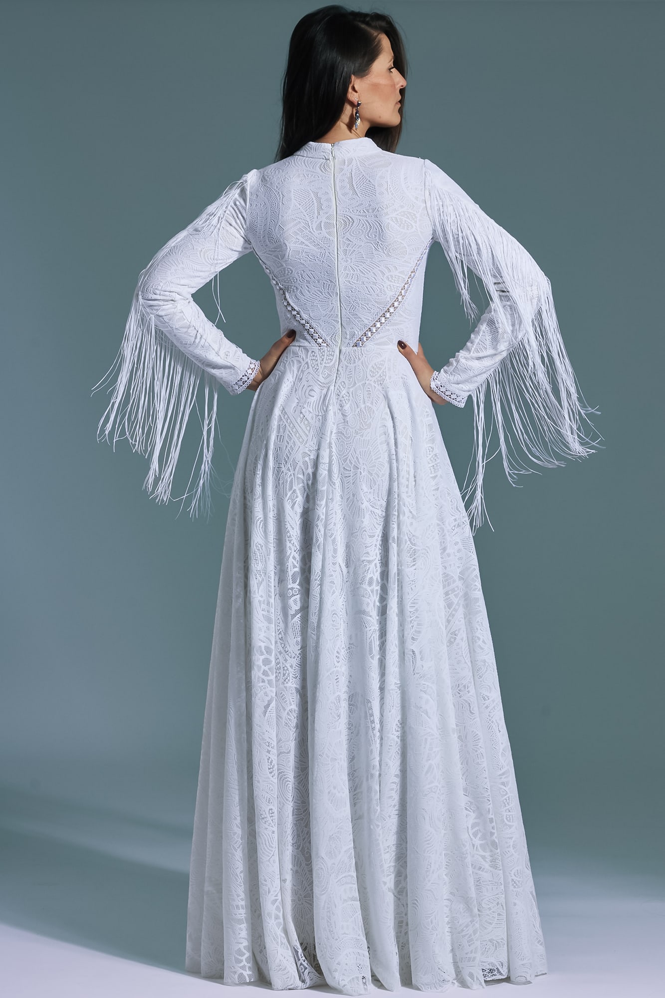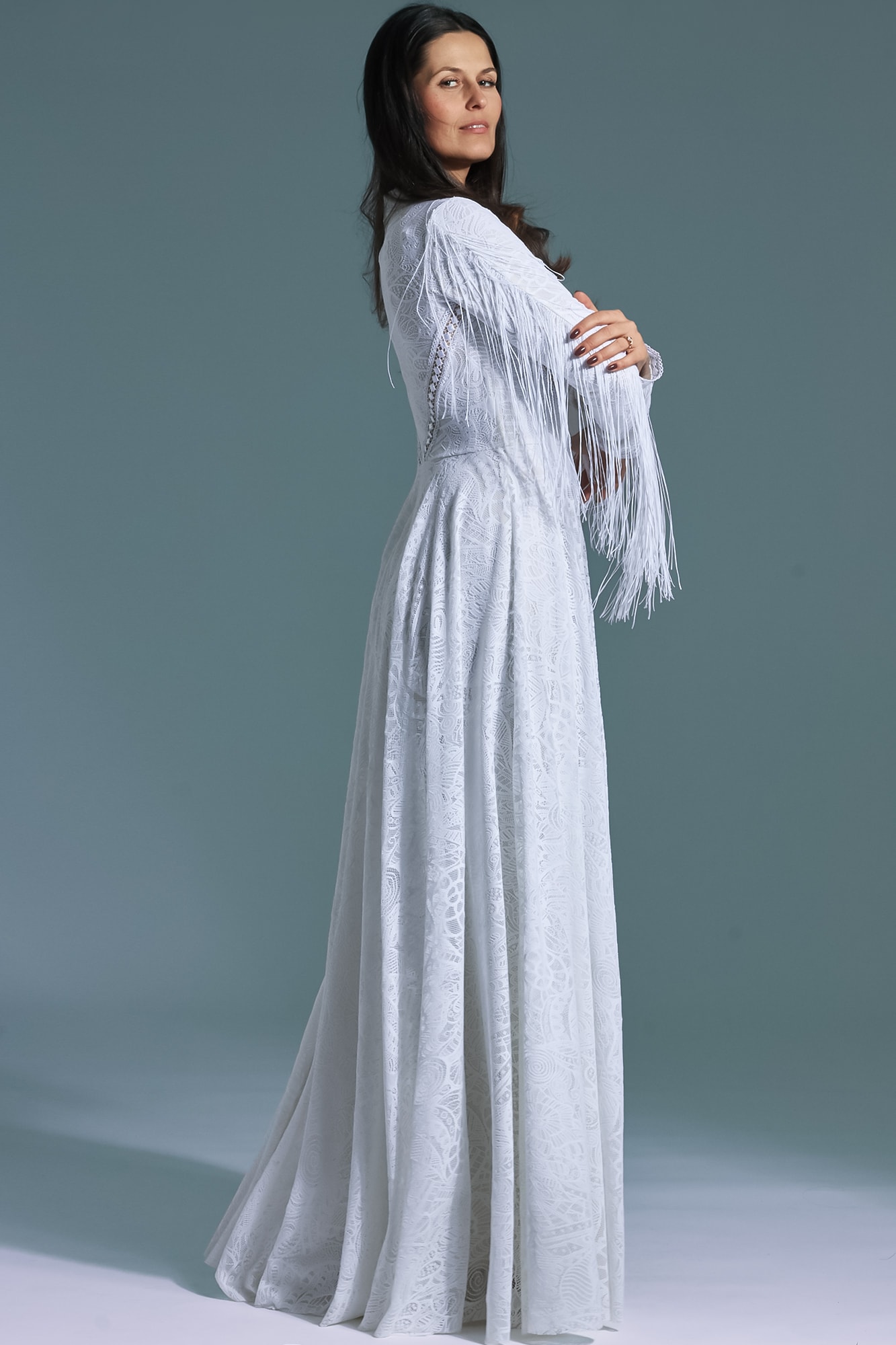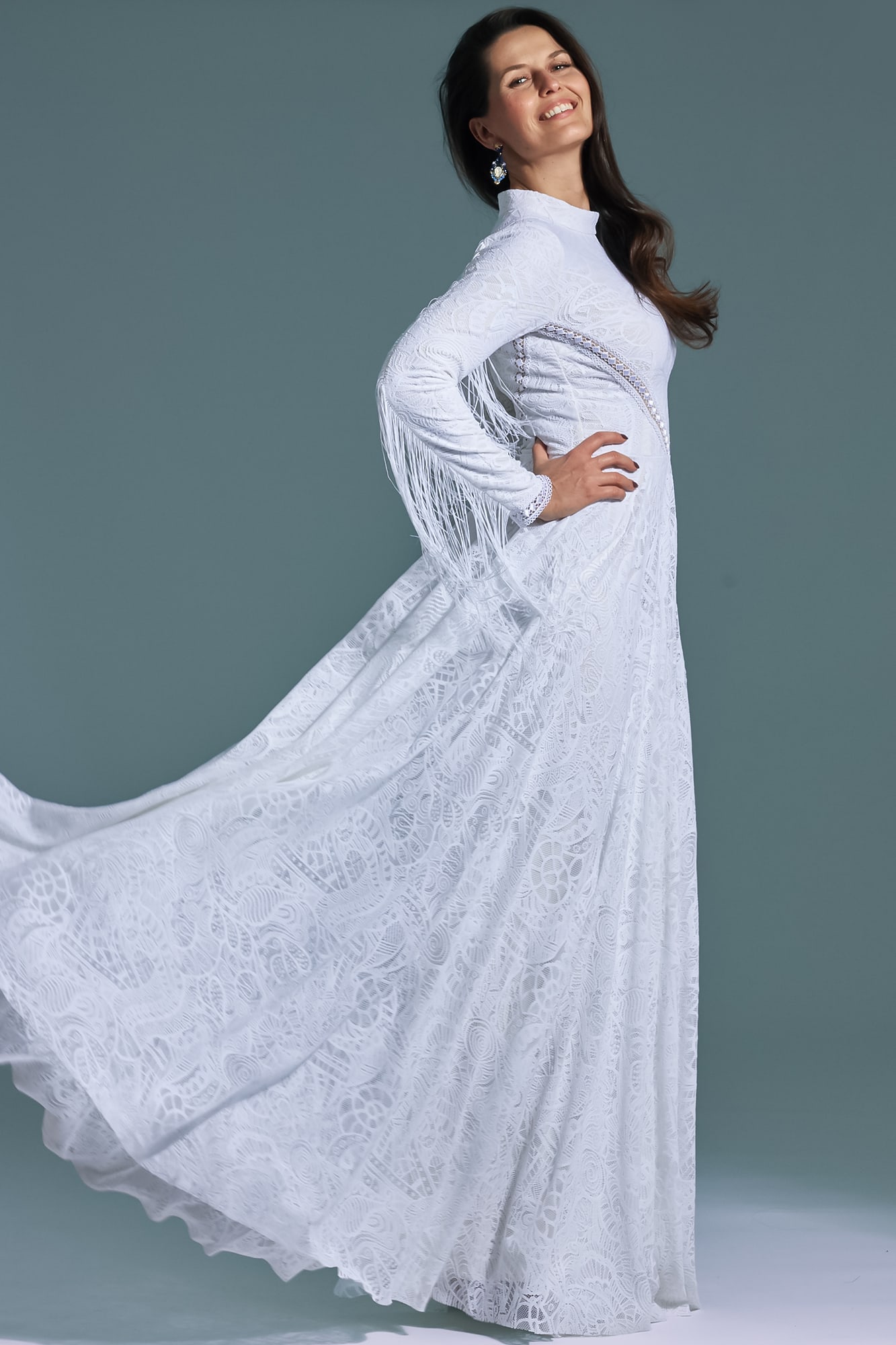 Ta suknia to model wyjściowy - możemy w niej zmienić praktycznie wszystko! Pogłębić lub spłycić dekolt, zmienić jego wykończenie, kształt, dodać lub odjąć falbankę czy frędzle. Rękawy mogą być dłuższe lub krótsze, mieć inny kształt niż te na zdjęciu. Może też nie być ich wcale. Tiul w spódnicy można dodać (lub odjąć) na wierzchu, albo pod spodem. Podszewka może być długa lub krótka w odcieniach bieli i beżu. Rozcięcie na nogę i tren można dodać lub usunąć praktycznie w każdym modelu.
